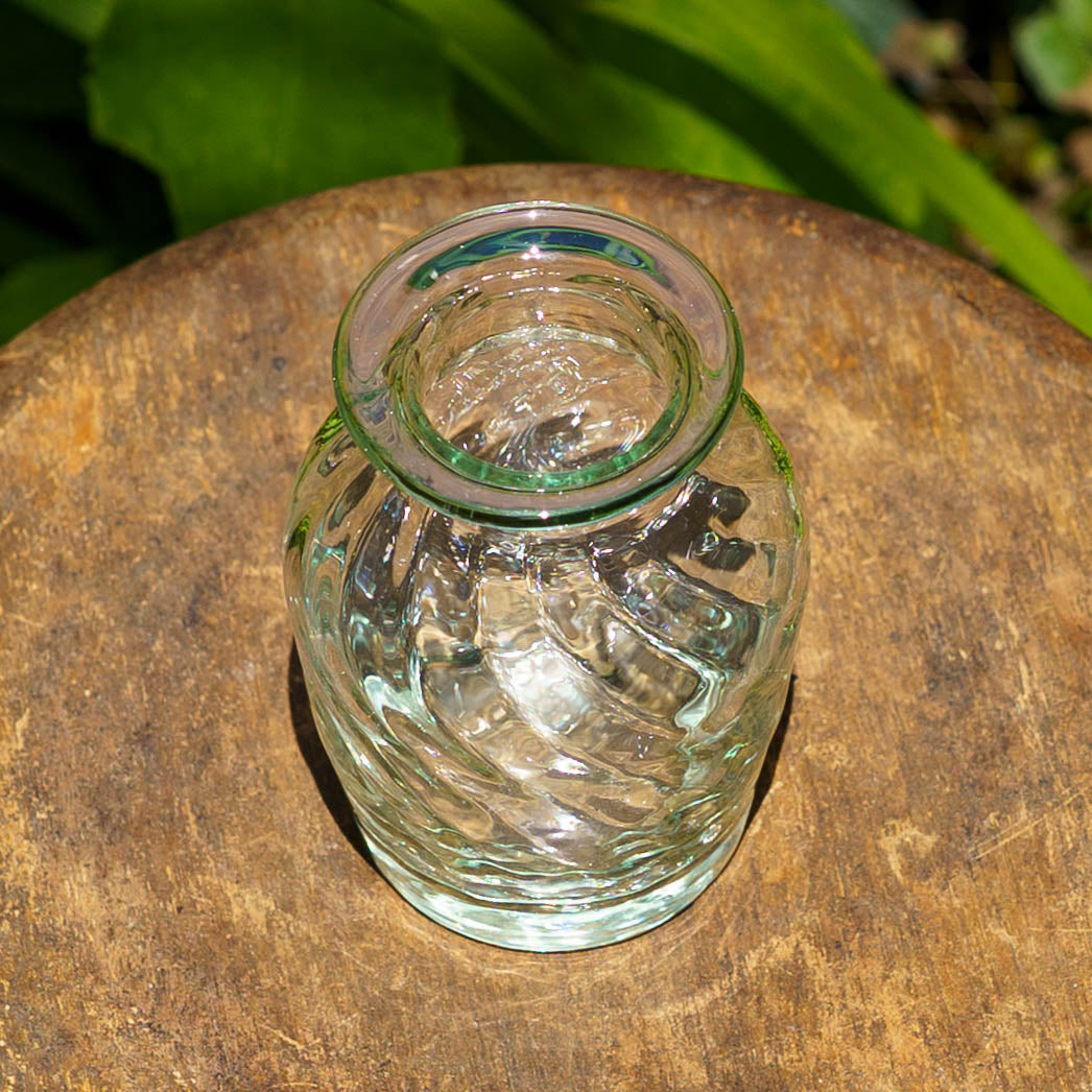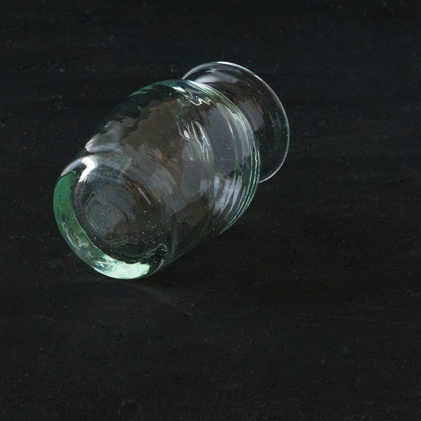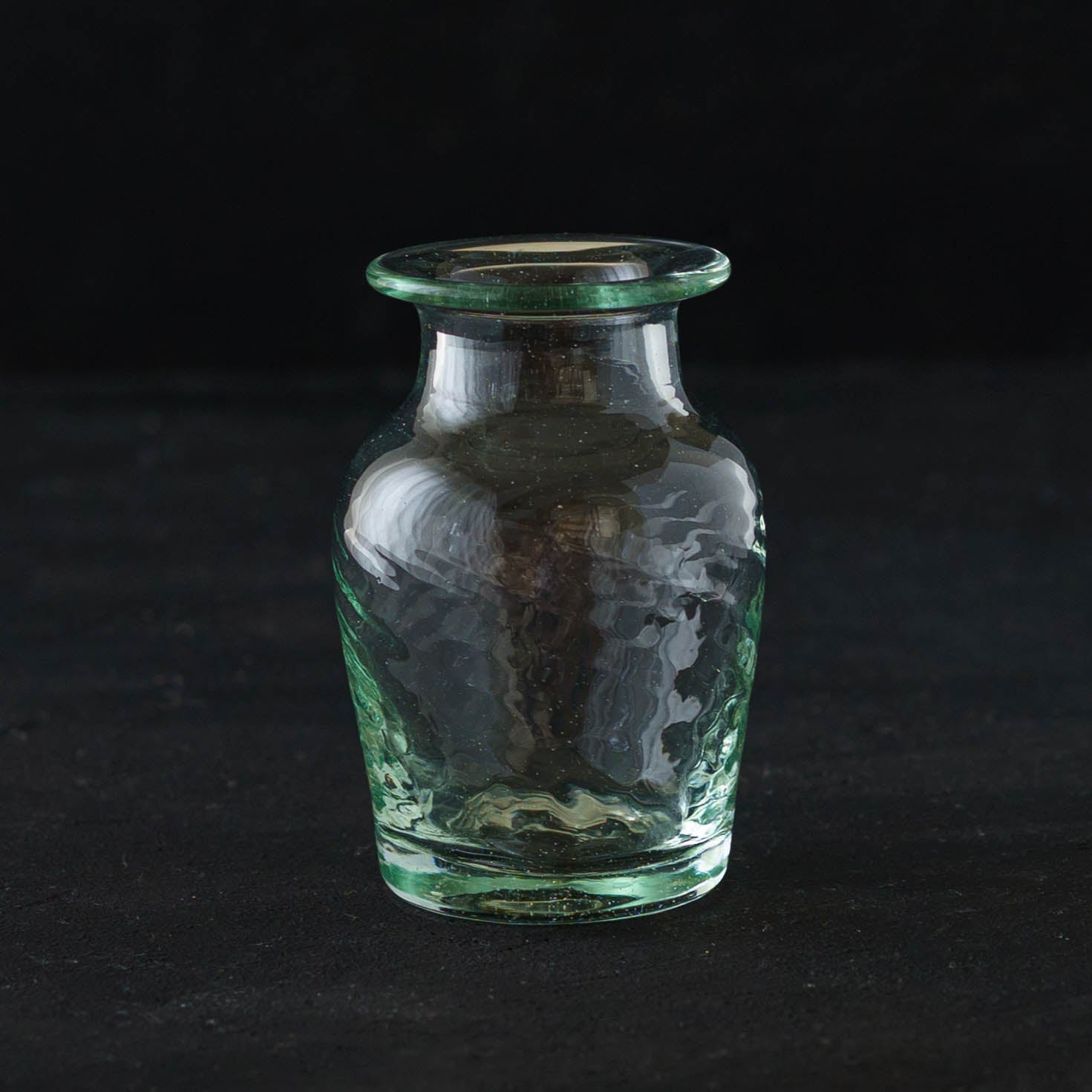廃瓶や古いガラス窓などを材料に作られる再生ガラス。使い終わった酒瓶を丁寧に洗い、ラベルを剥がし炉で溶かす。ひとつひとつ、吹きガラス技法で紡ぎだすうつわたちは、淡くやさしい輝きをまといながら、ぬくもりを感じさせてくれるうつわへと生まれ変わります。
