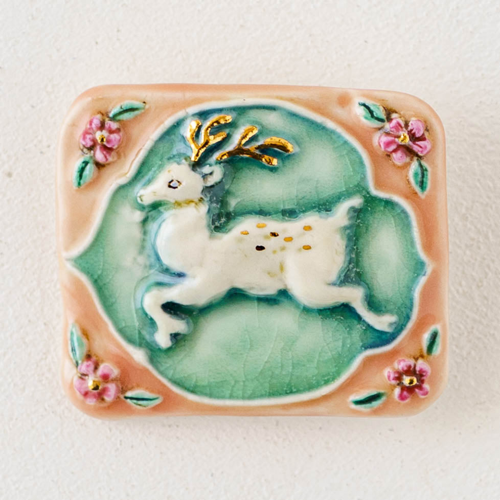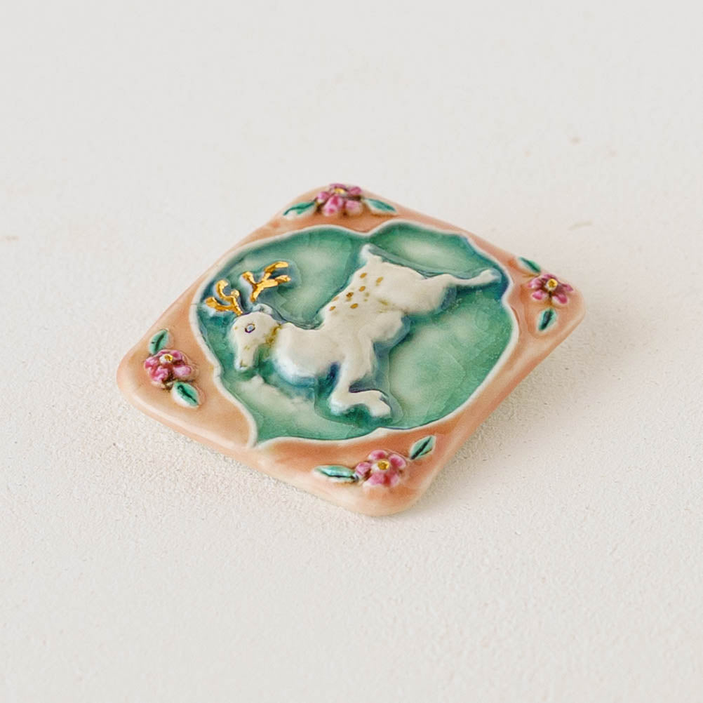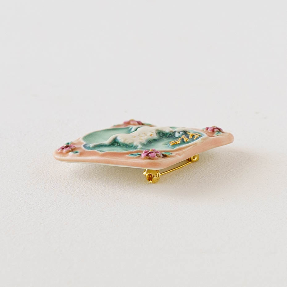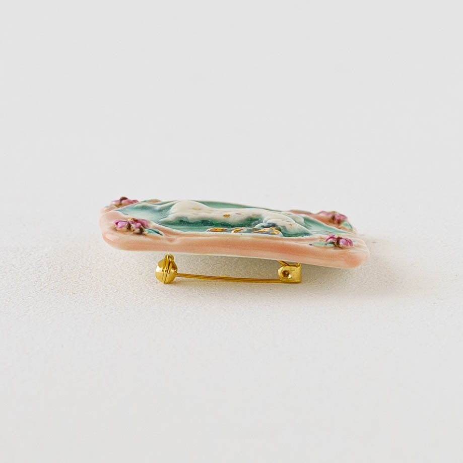 クラシカルな雰囲気と上品な可愛らしさを併せ持った素敵な陶製のブローチ。胸元をかわいく華やかに演出してくれます。ブローチ金具は真鍮に金メッキとなります。
