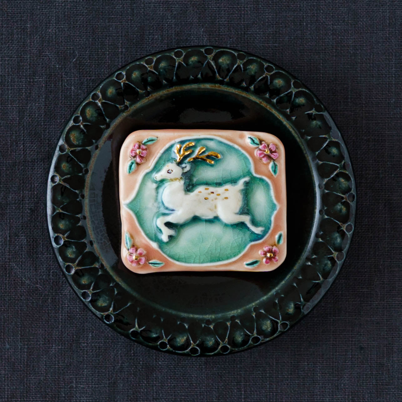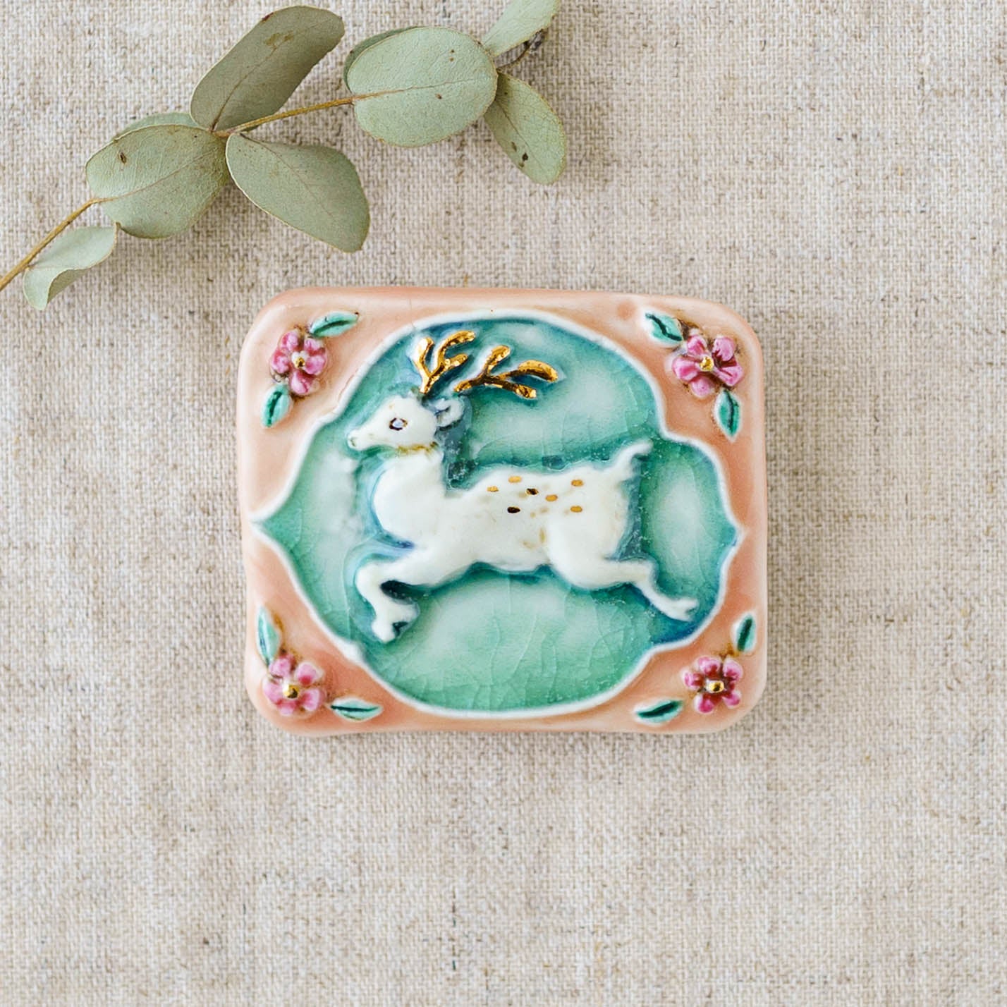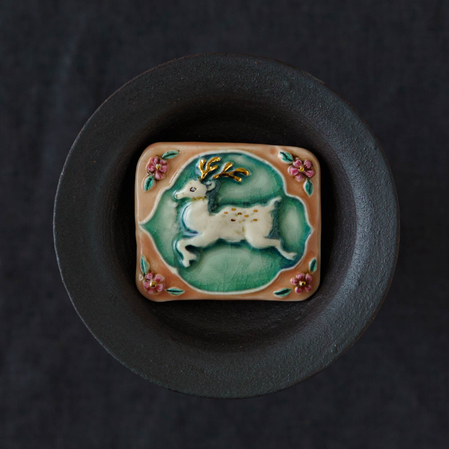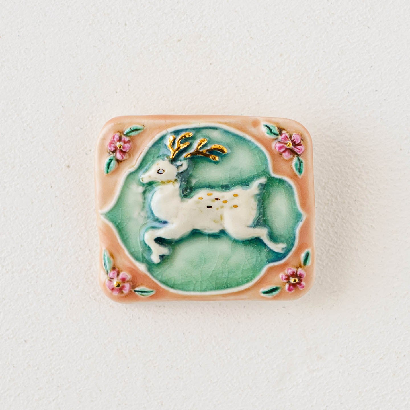 クラシカルな雰囲気と上品な可愛らしさを併せ持った素敵な陶製のブローチ。胸元をかわいく華やかに演出してくれます。ブローチ金具は真鍮に金メッキとなります。