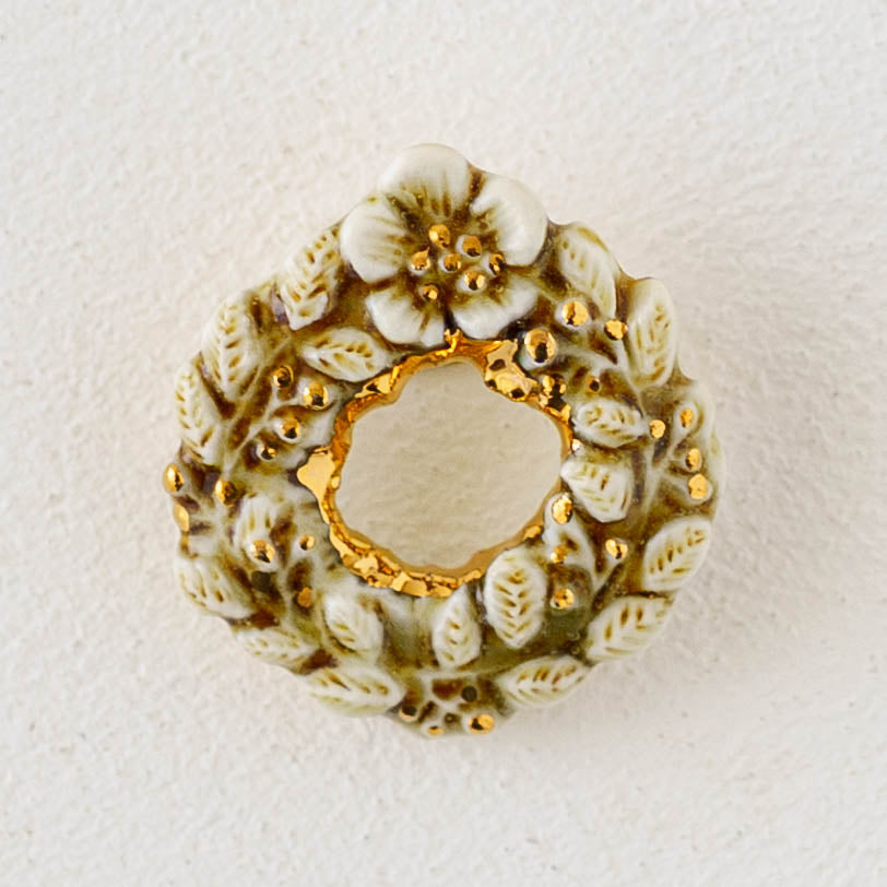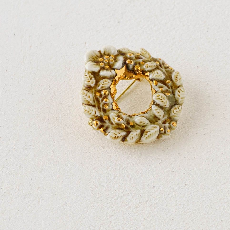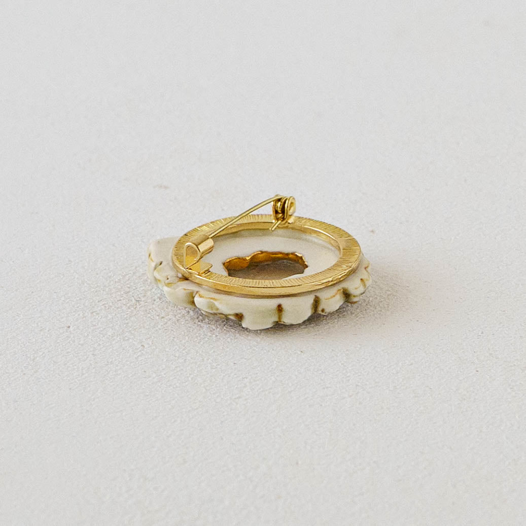 クラシカルな雰囲気と上品な可愛らしさを併せ持った素敵な陶製のブローチ。胸元をかわいく華やかに演出してくれます。ブローチ金具は真鍮に金メッキとなります。