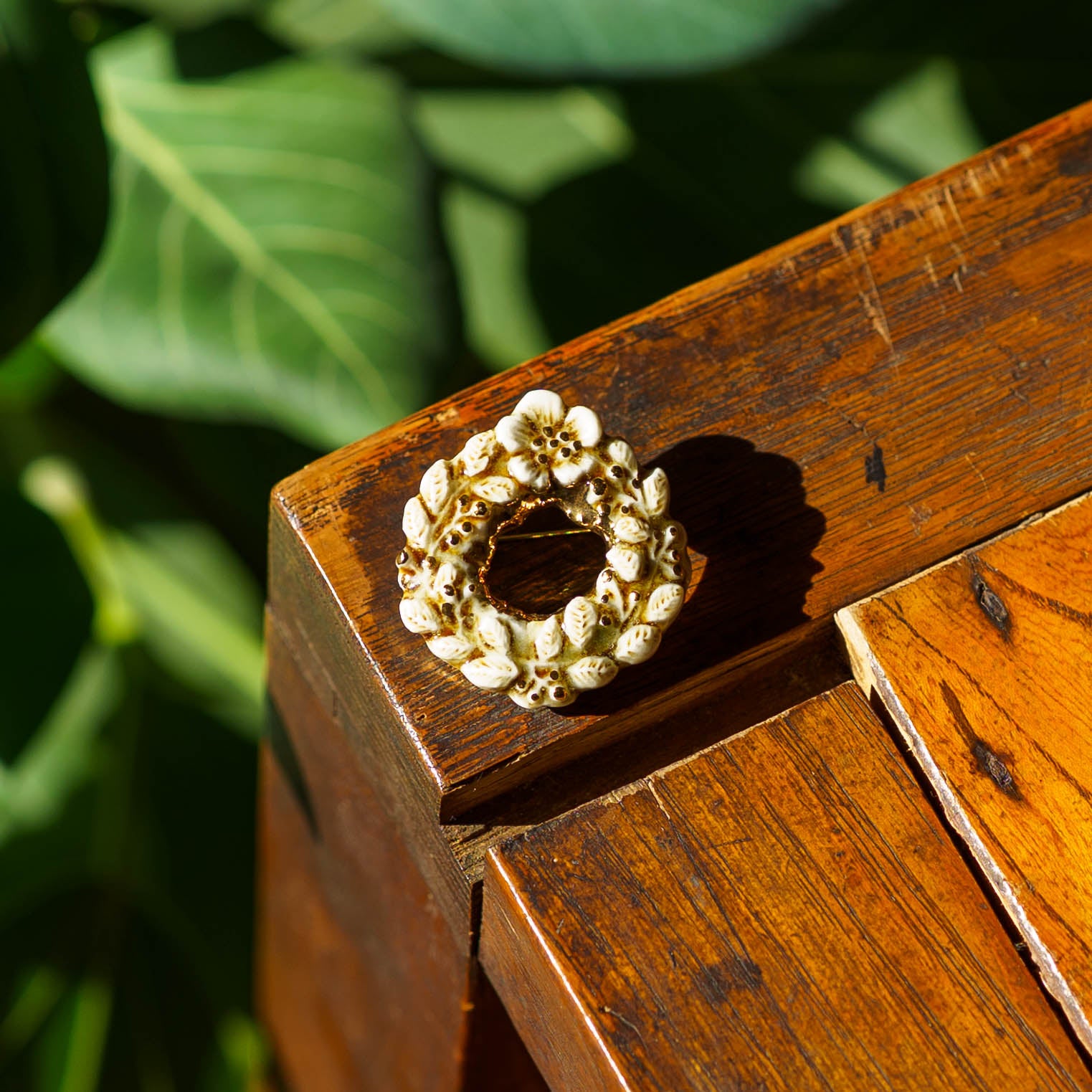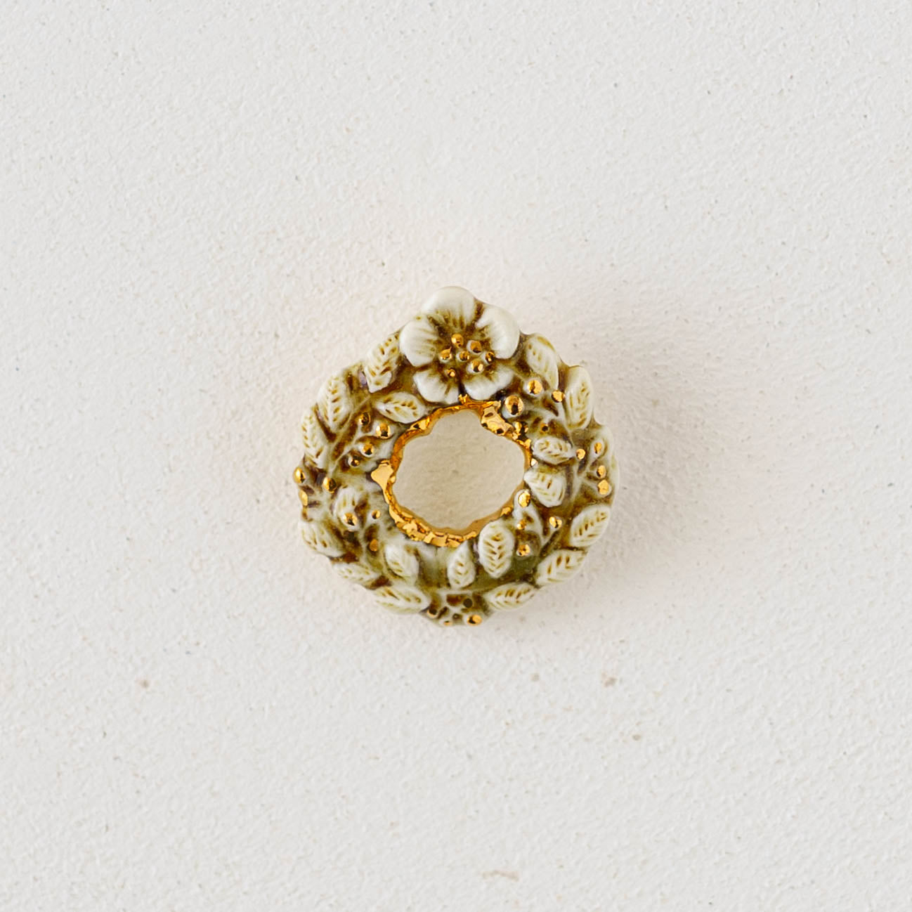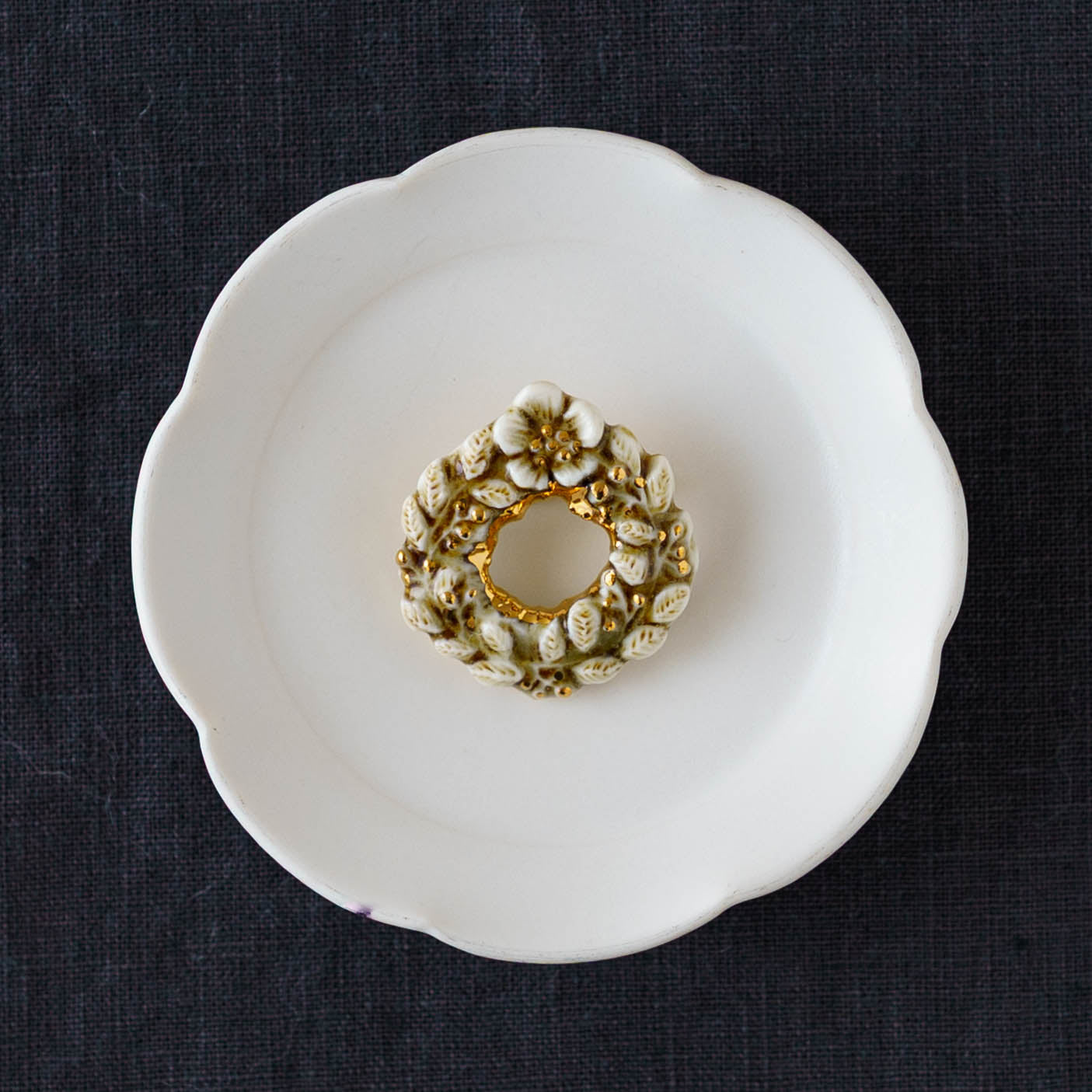 クラシカルな雰囲気と上品な可愛らしさを併せ持った素敵な陶製のブローチ。胸元をかわいく華やかに演出してくれます。ブローチ金具は真鍮に金メッキとなります。