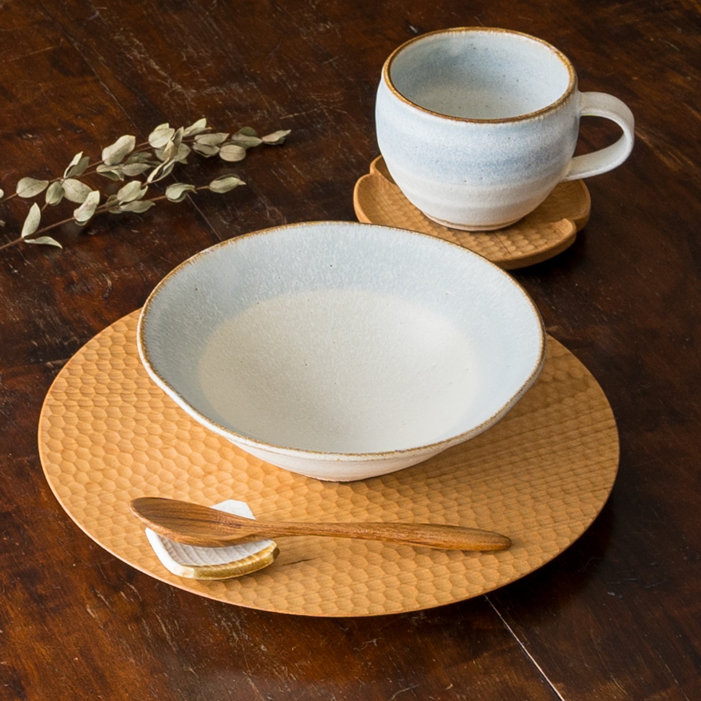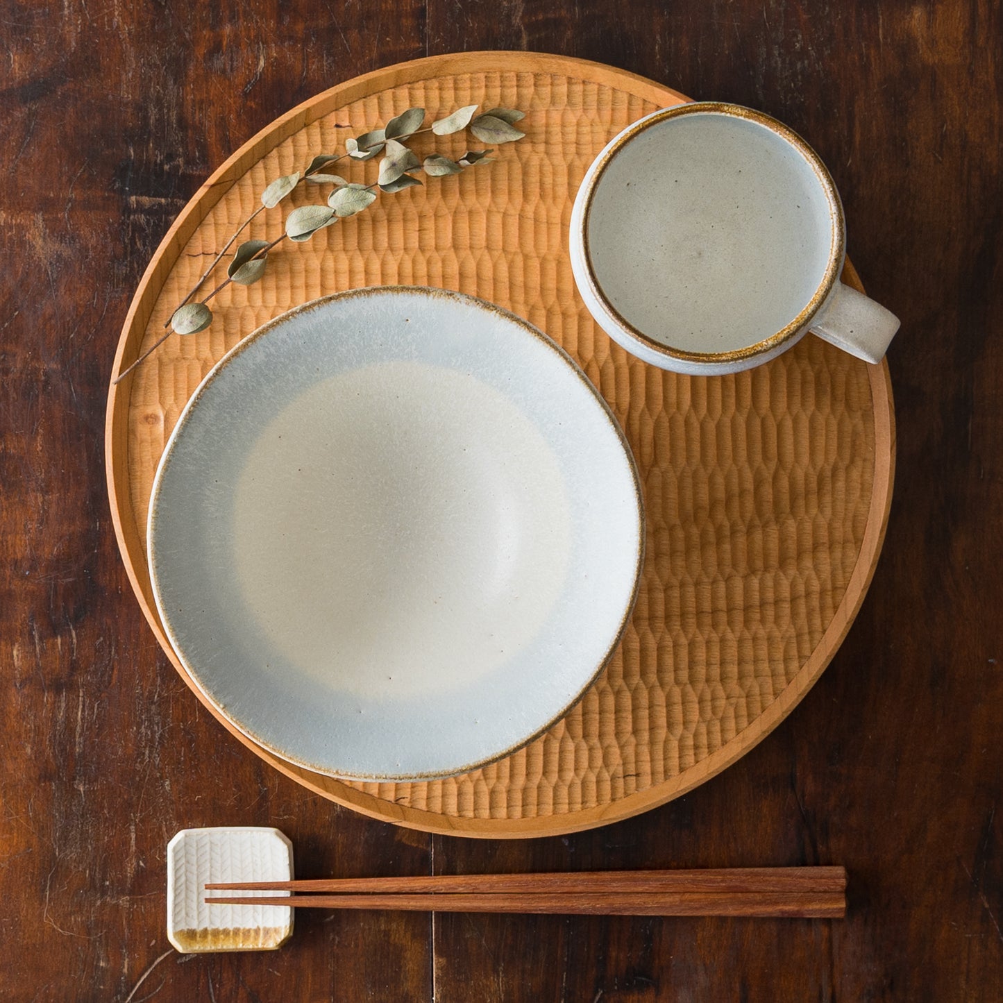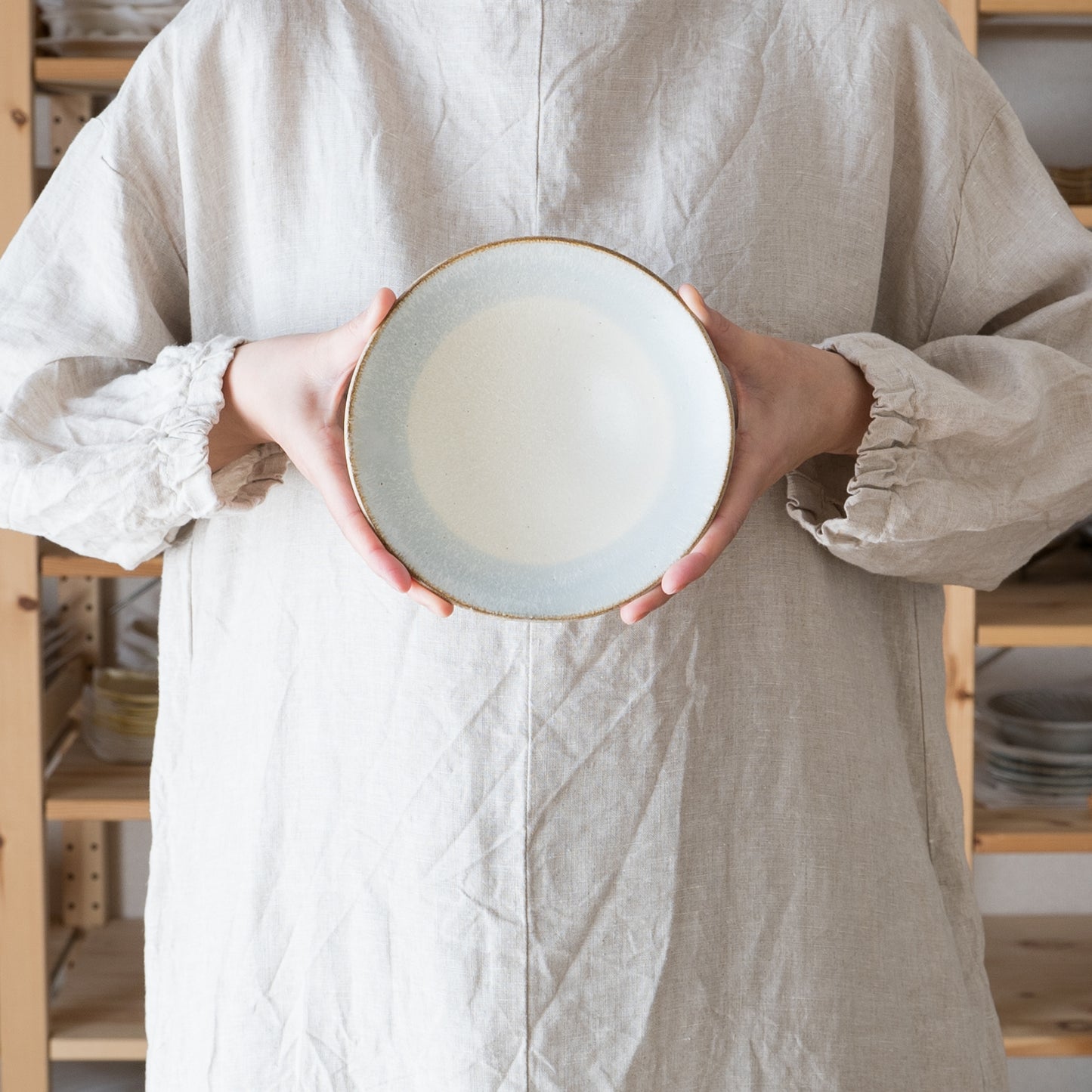 やさしく落ち着いた色味と風合いなので、いつものお料理を上品に彩ってくれます。手仕事の温かさを感じるたわみや焼成時に小さな穴が残るピンホールなど繊細さと味わい深さを併せ持っています。
