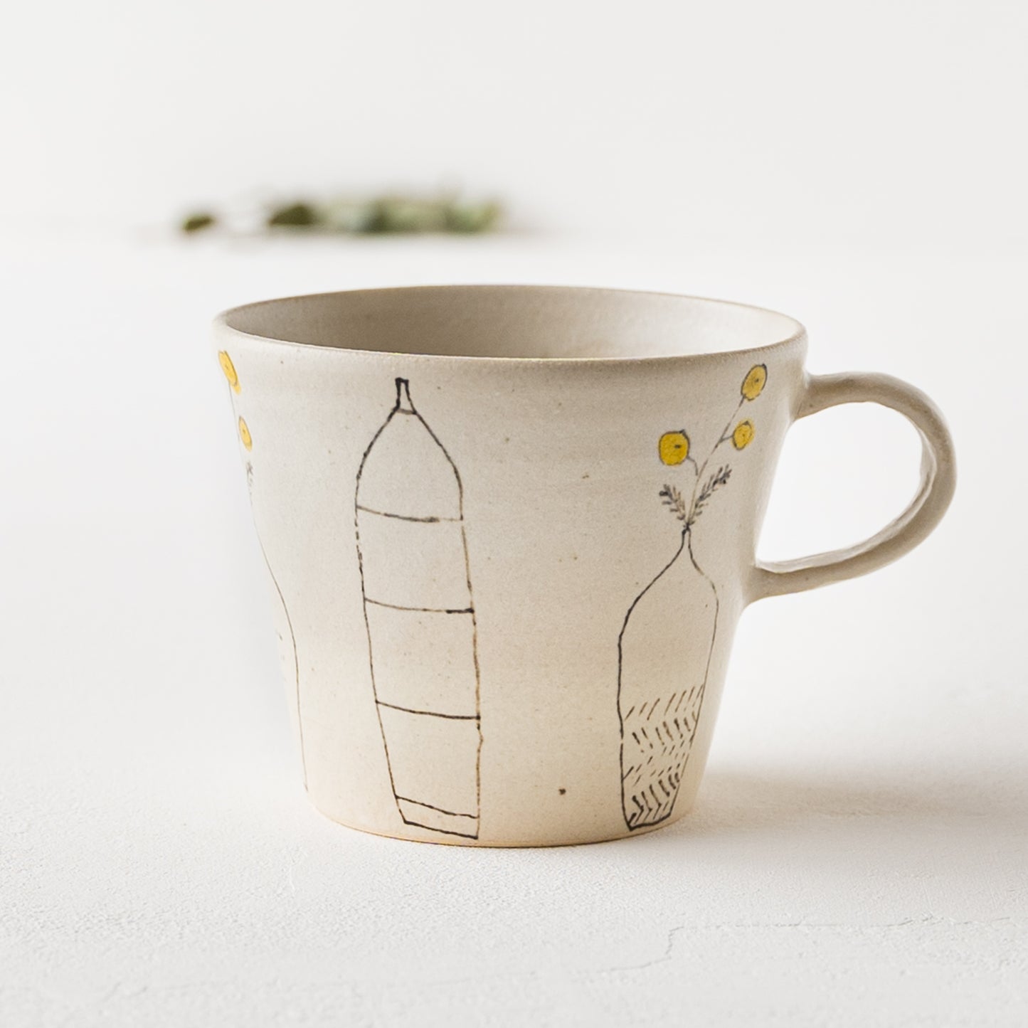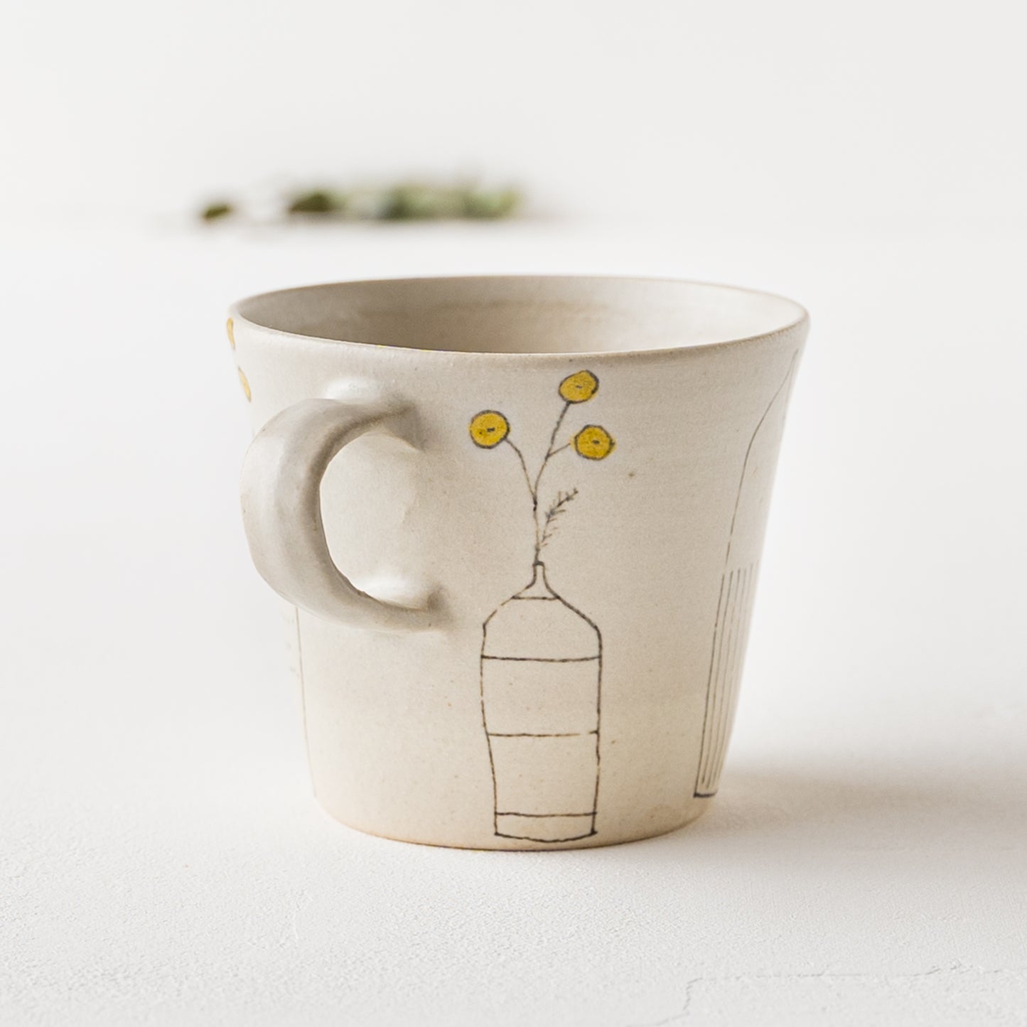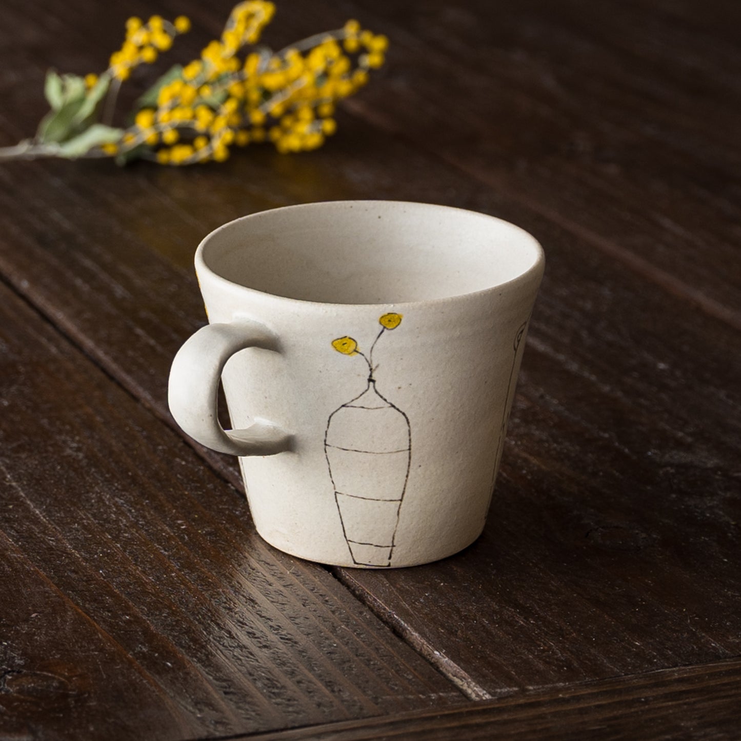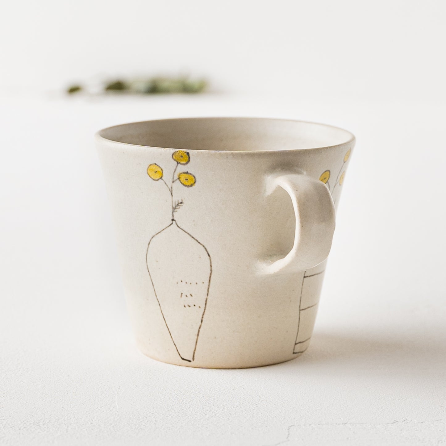 緩やかなラインで描かれたミモザと花びんのマグ。ほっと一休みの時やデスクワークのお供に、午後のおやつタイム、来客のおもてなし用、就寝前の読書の時などいつでも温かな気持ちにしてくれます。