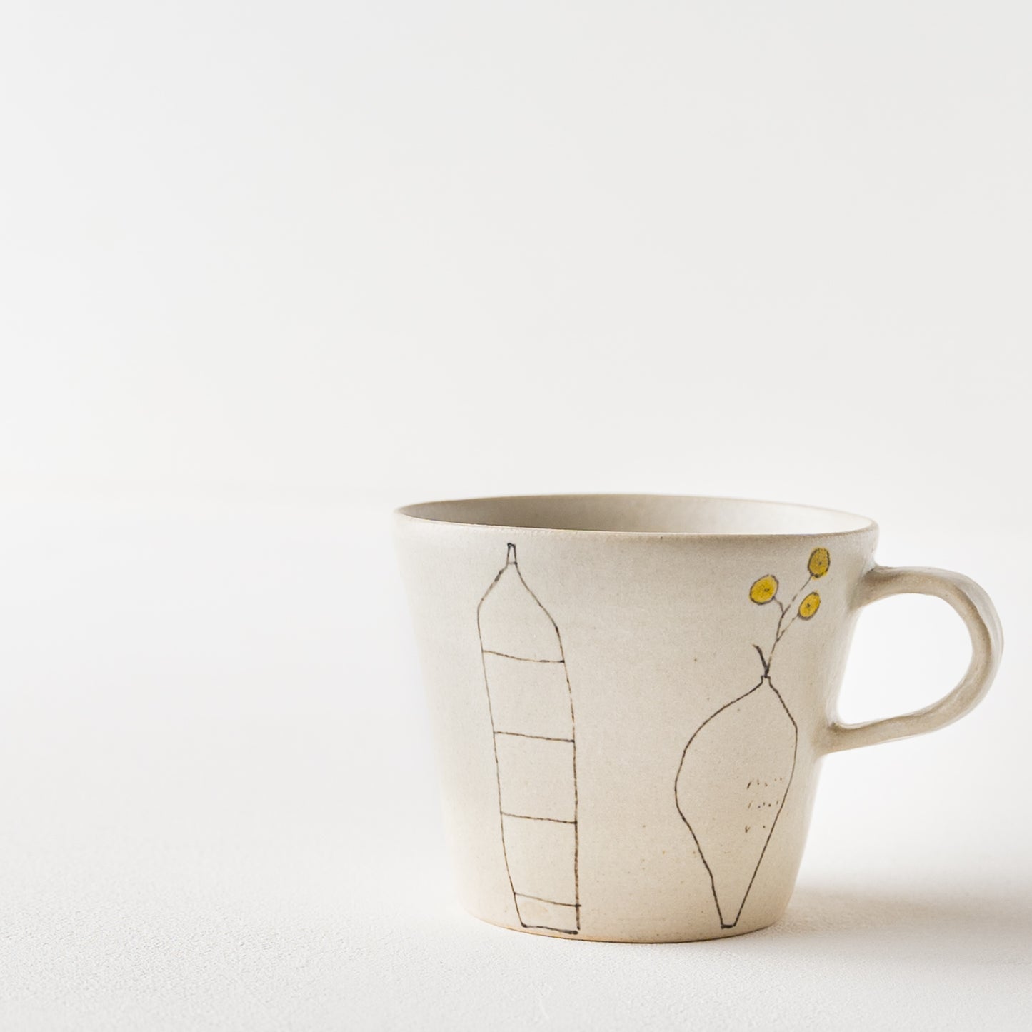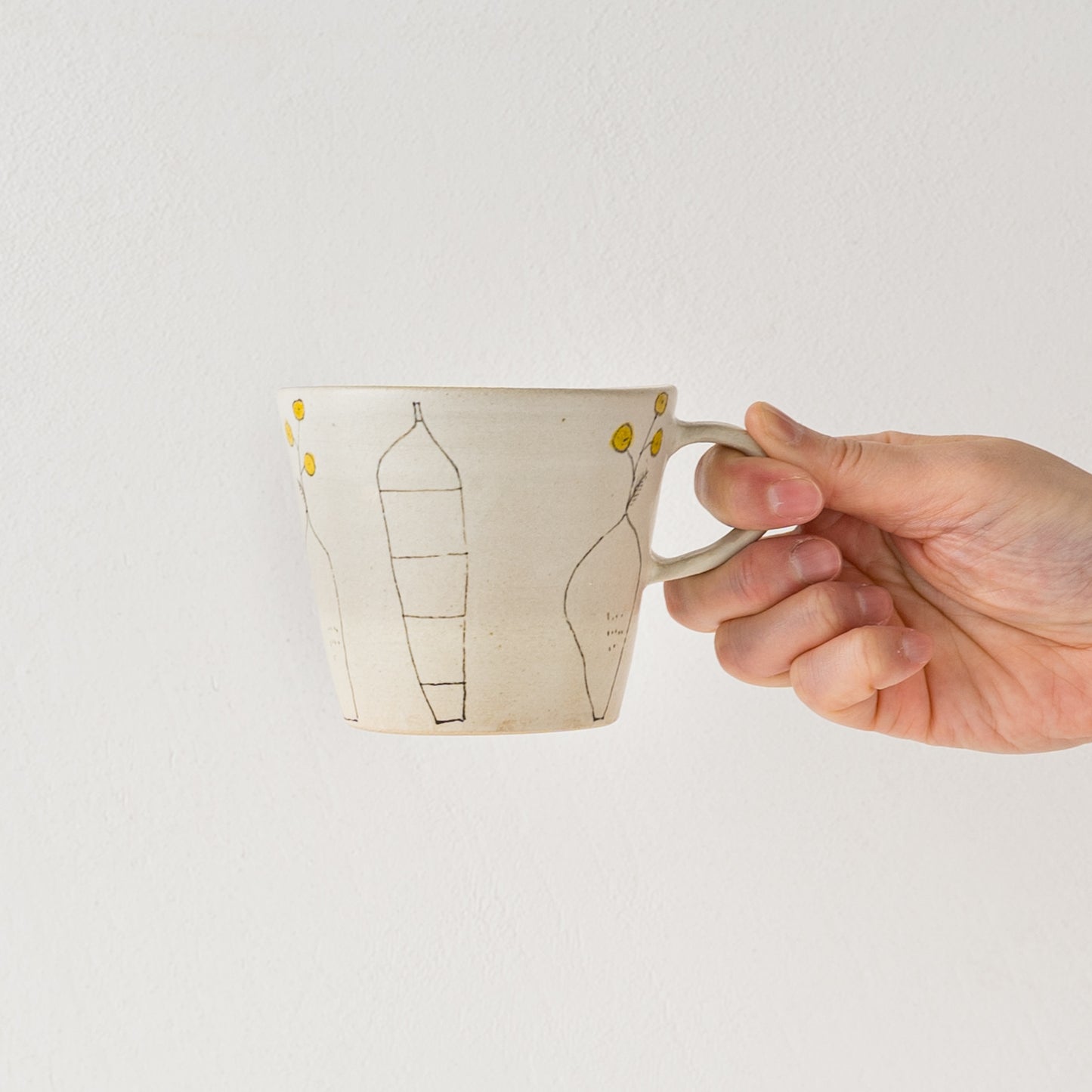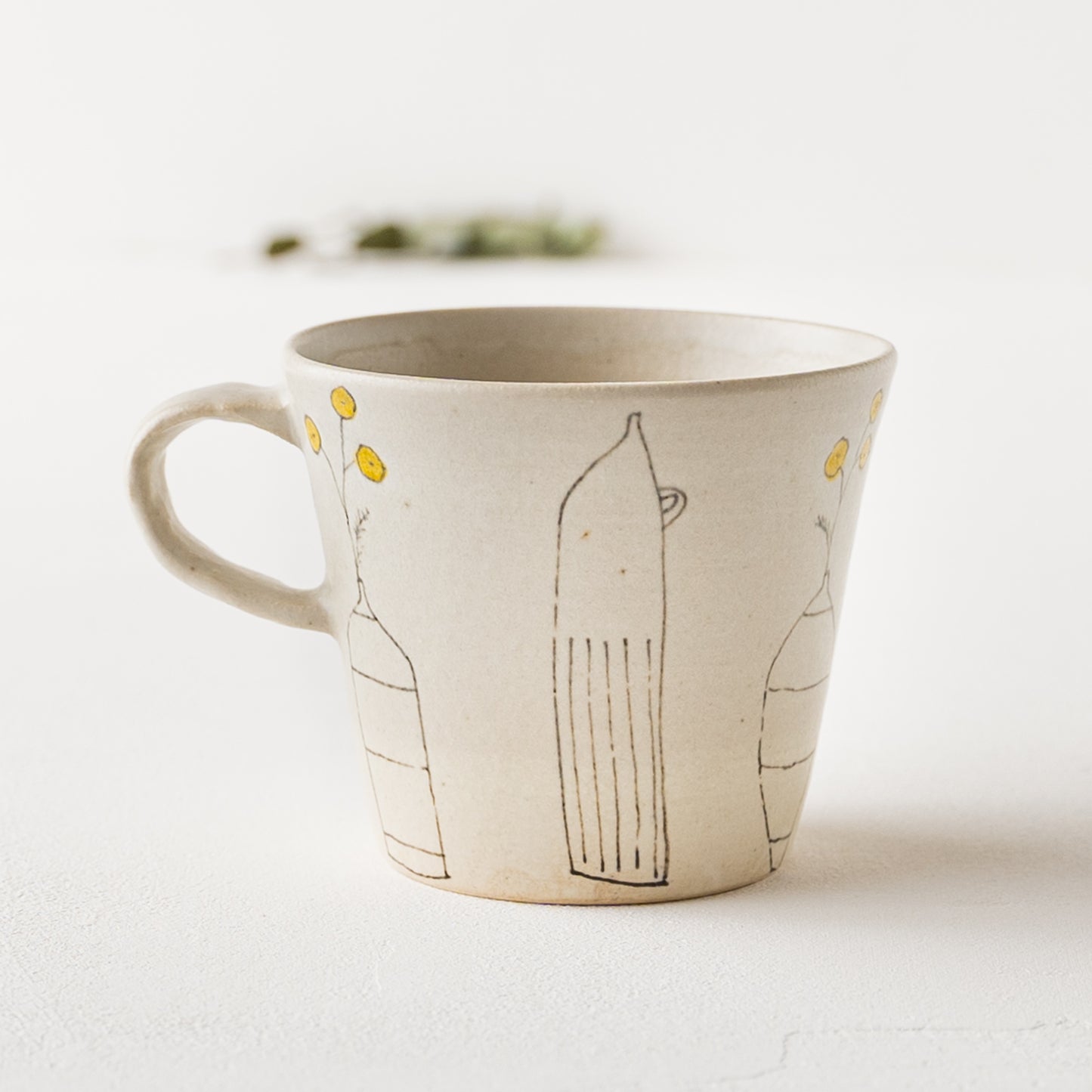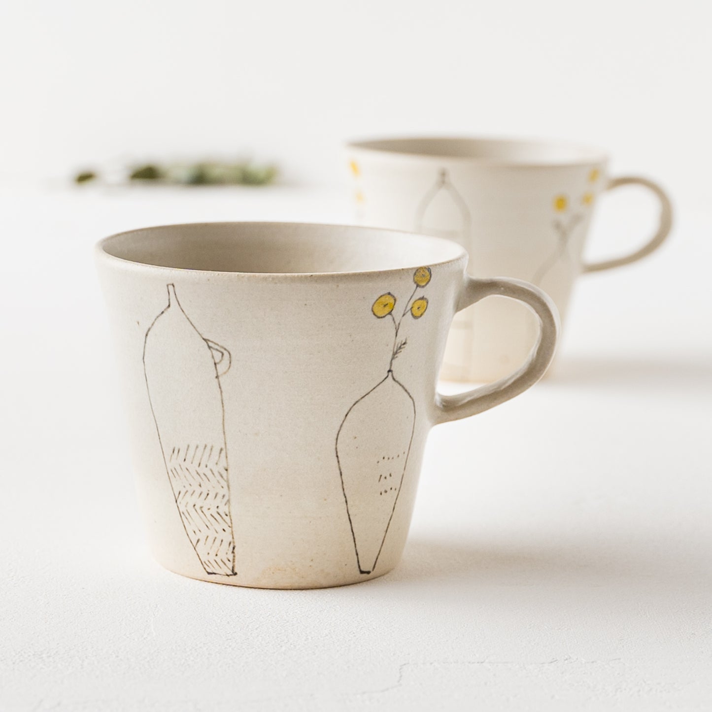 緩やかなラインで描かれたミモザと花びんのマグ。ほっと一休みの時やデスクワークのお供に、午後のおやつタイム、来客のおもてなし用、就寝前の読書の時などいつでも温かな気持ちにしてくれます。