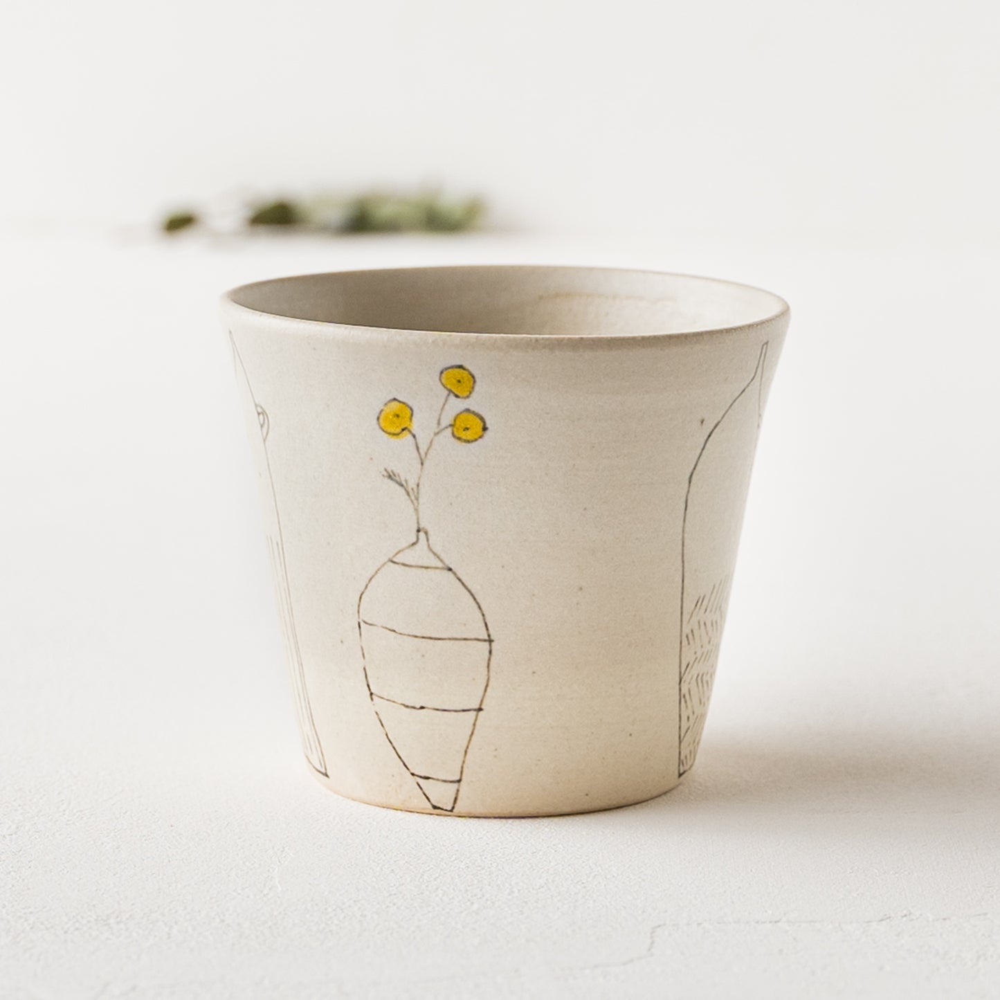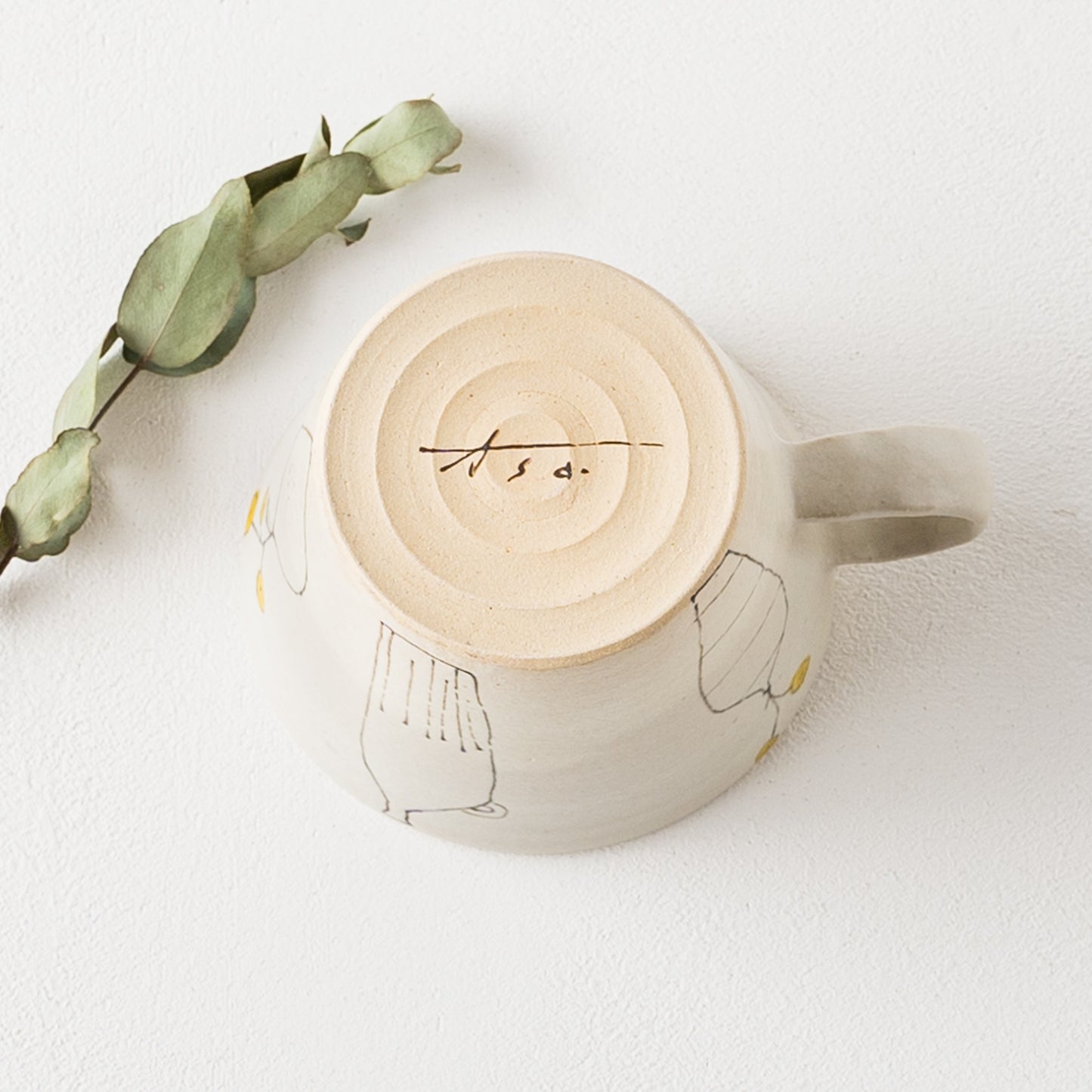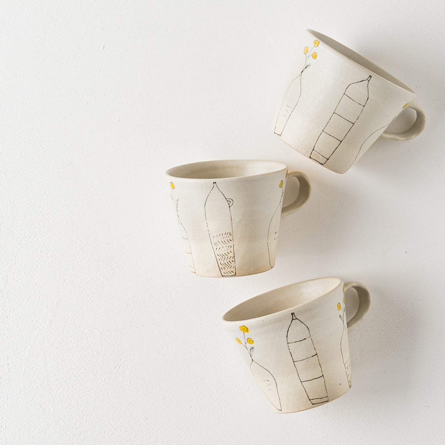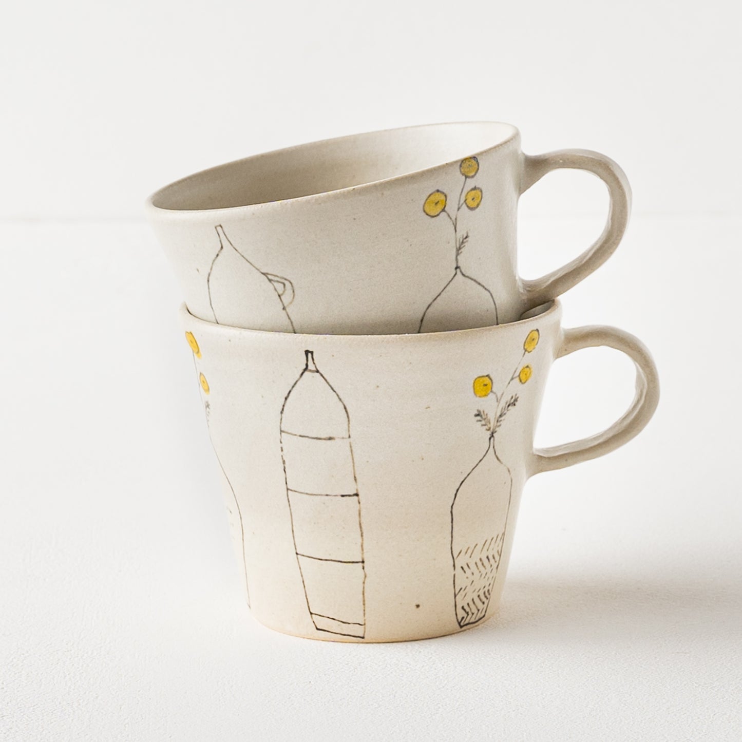 緩やかなラインで描かれたミモザと花びんのマグ。ほっと一休みの時やデスクワークのお供に、午後のおやつタイム、来客のおもてなし用、就寝前の読書の時などいつでも温かな気持ちにしてくれます。