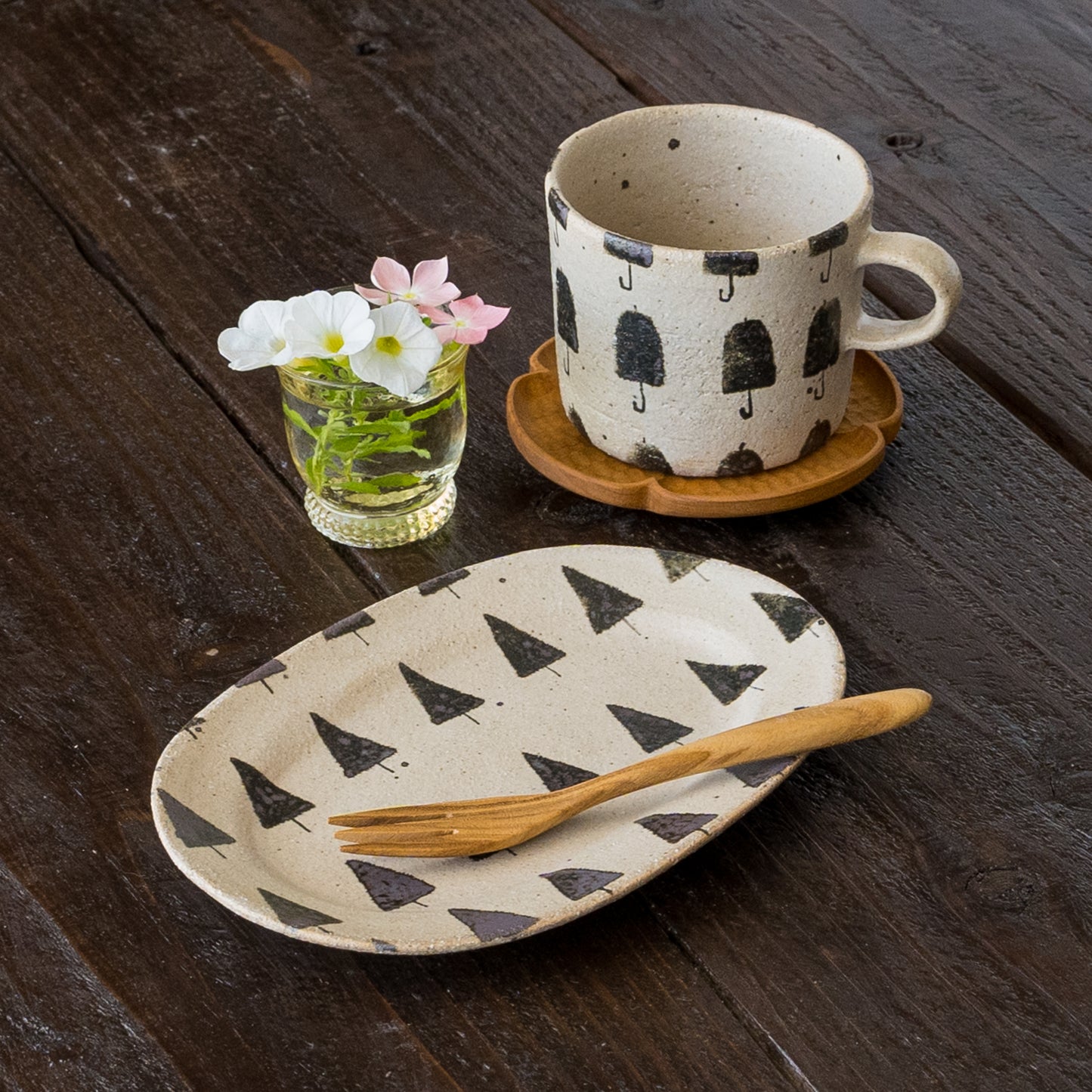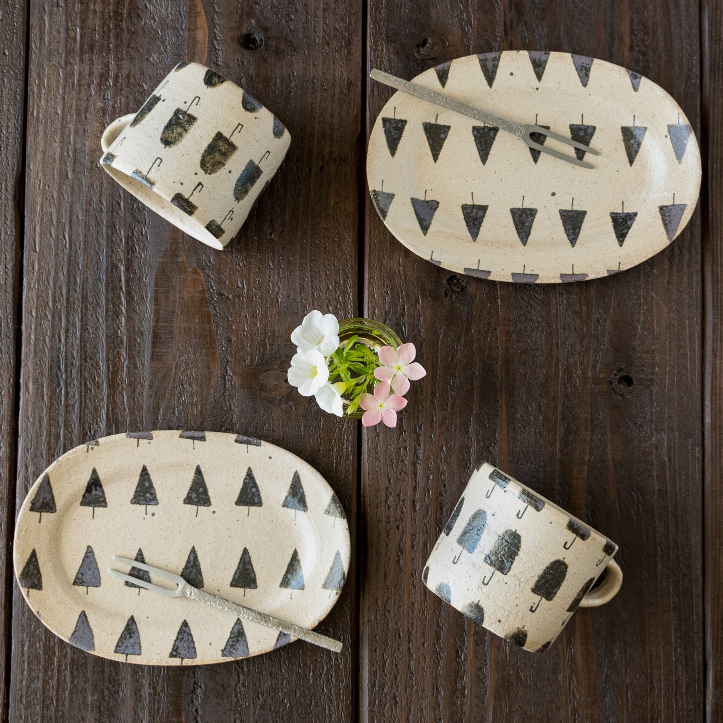 酸化鉄の赤い釉薬ベンガラで絵付けをし、還元焼成すると黒になります。この黒が鉄っぽい風合いで、また、濃淡や掠れなどの表情も表れて、どこか懐かしい気持ちになります。