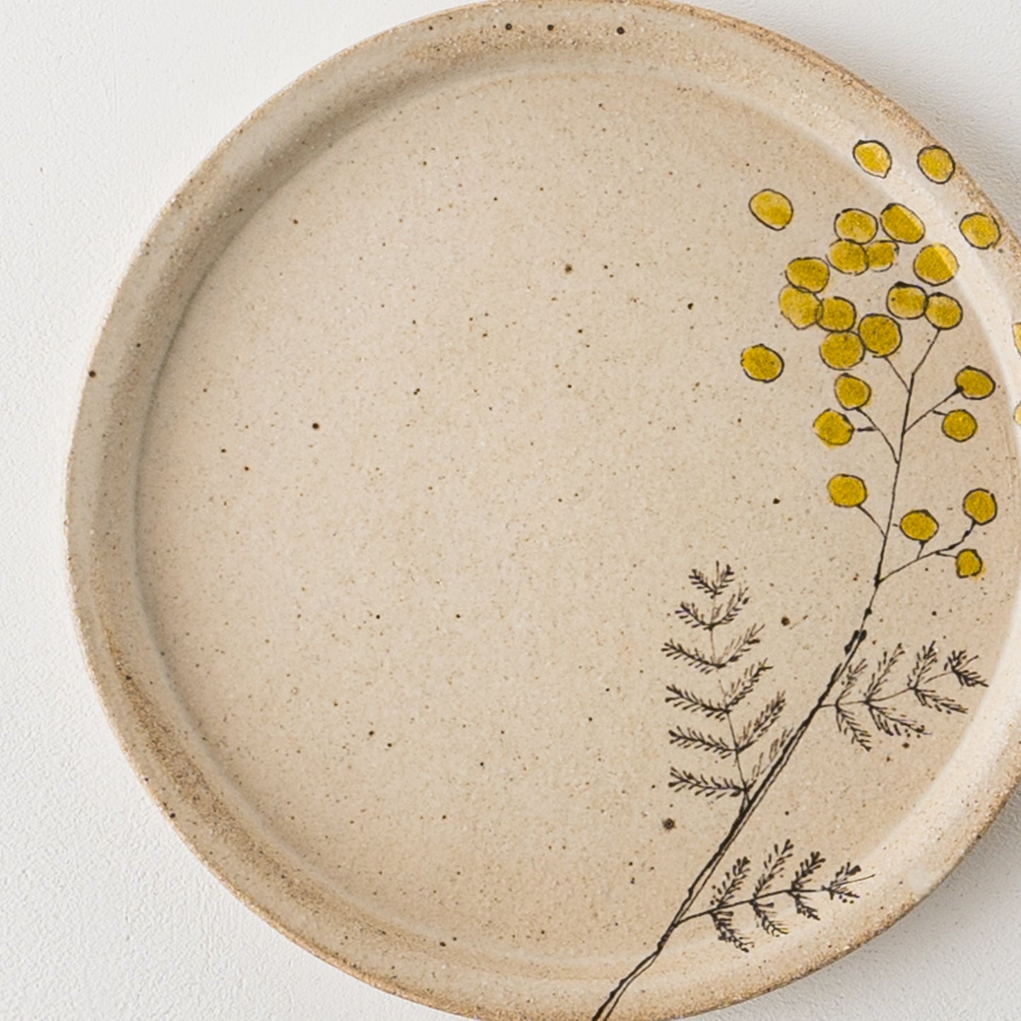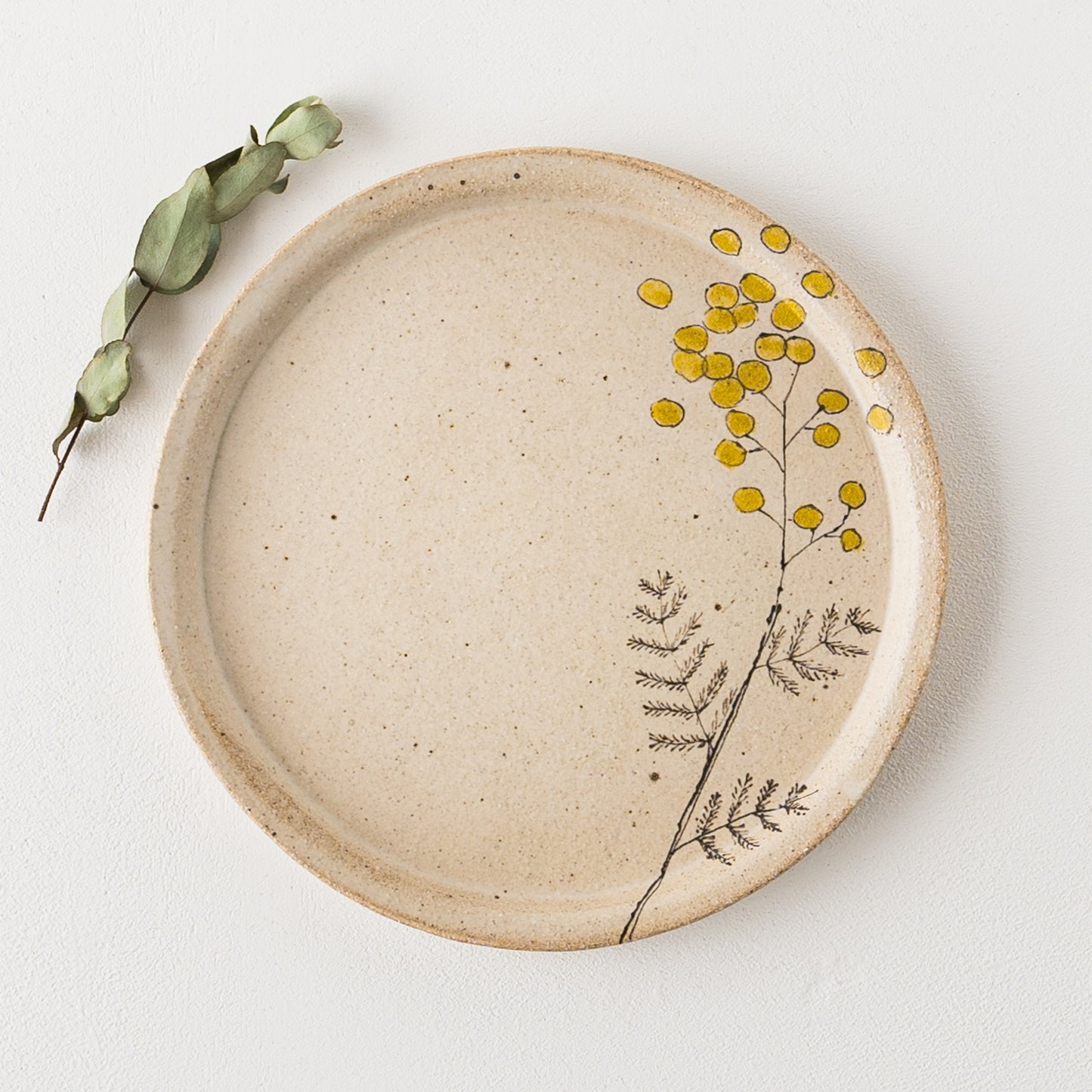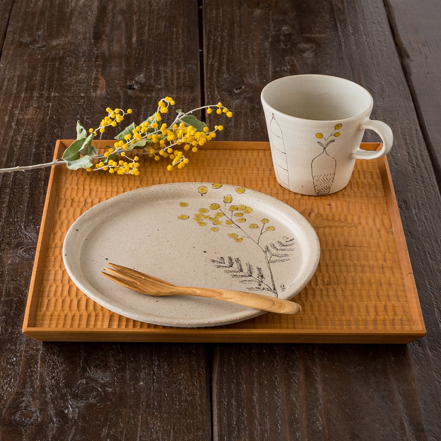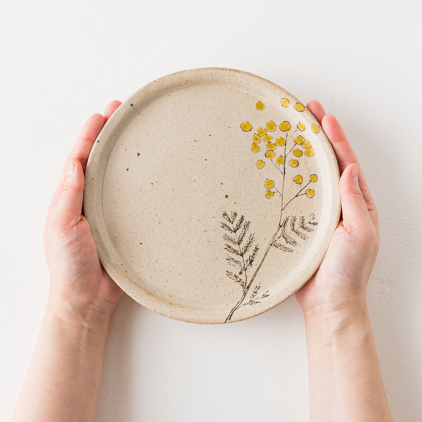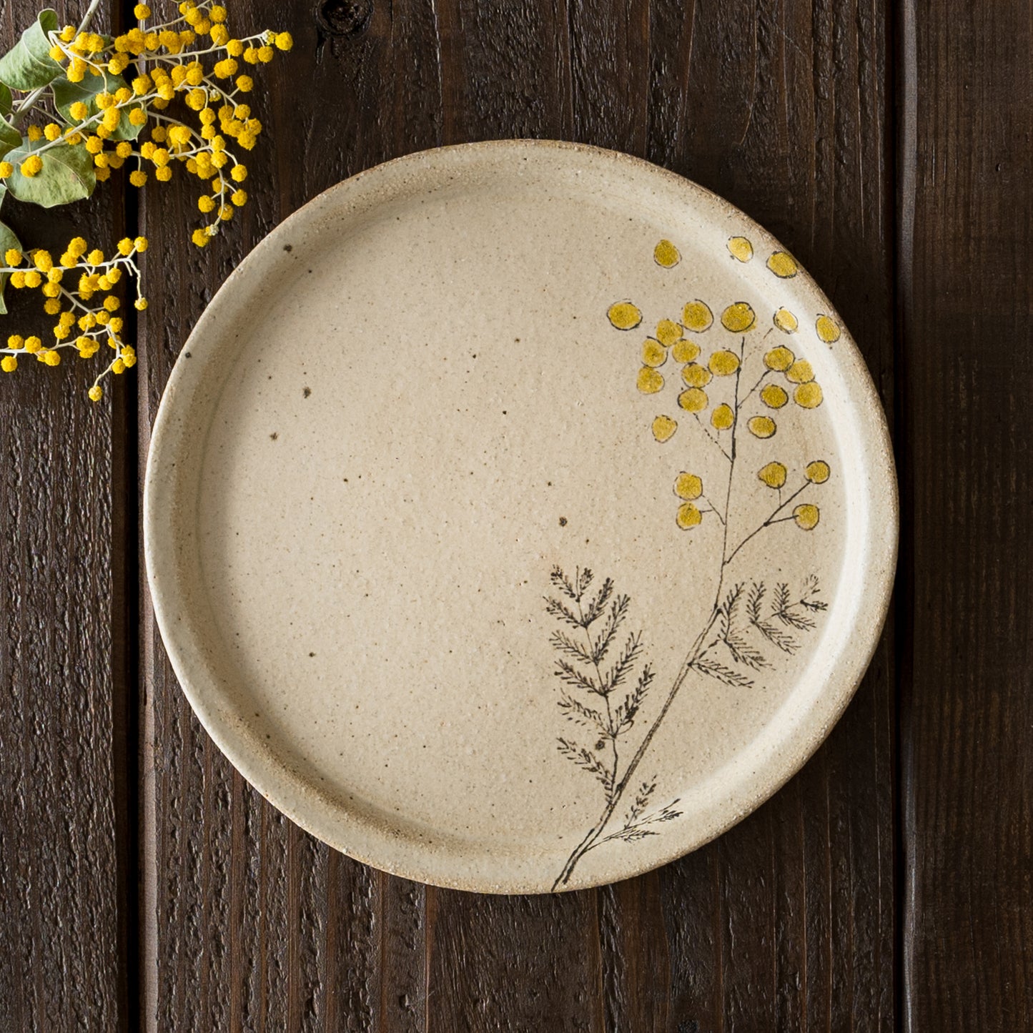 やさしいタッチで描かれた愛らしいミモザ。フリーハンドで描いているので穏やかで柔らかな表情に。眺めているだけで心に安らぎを与えてくれます。