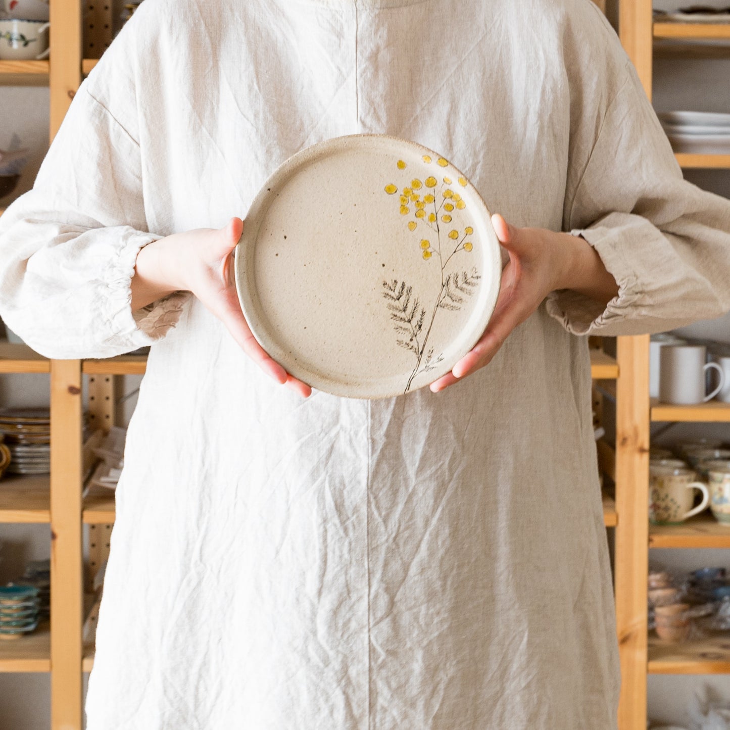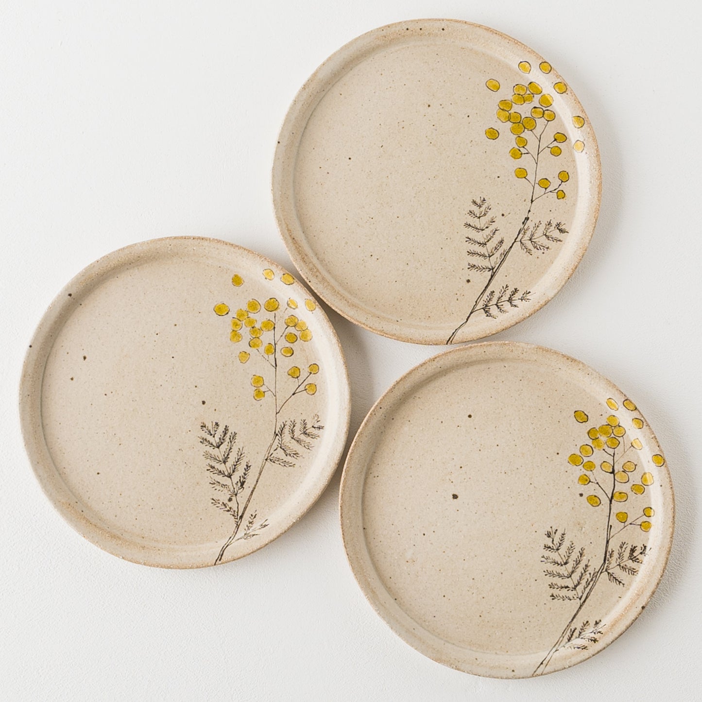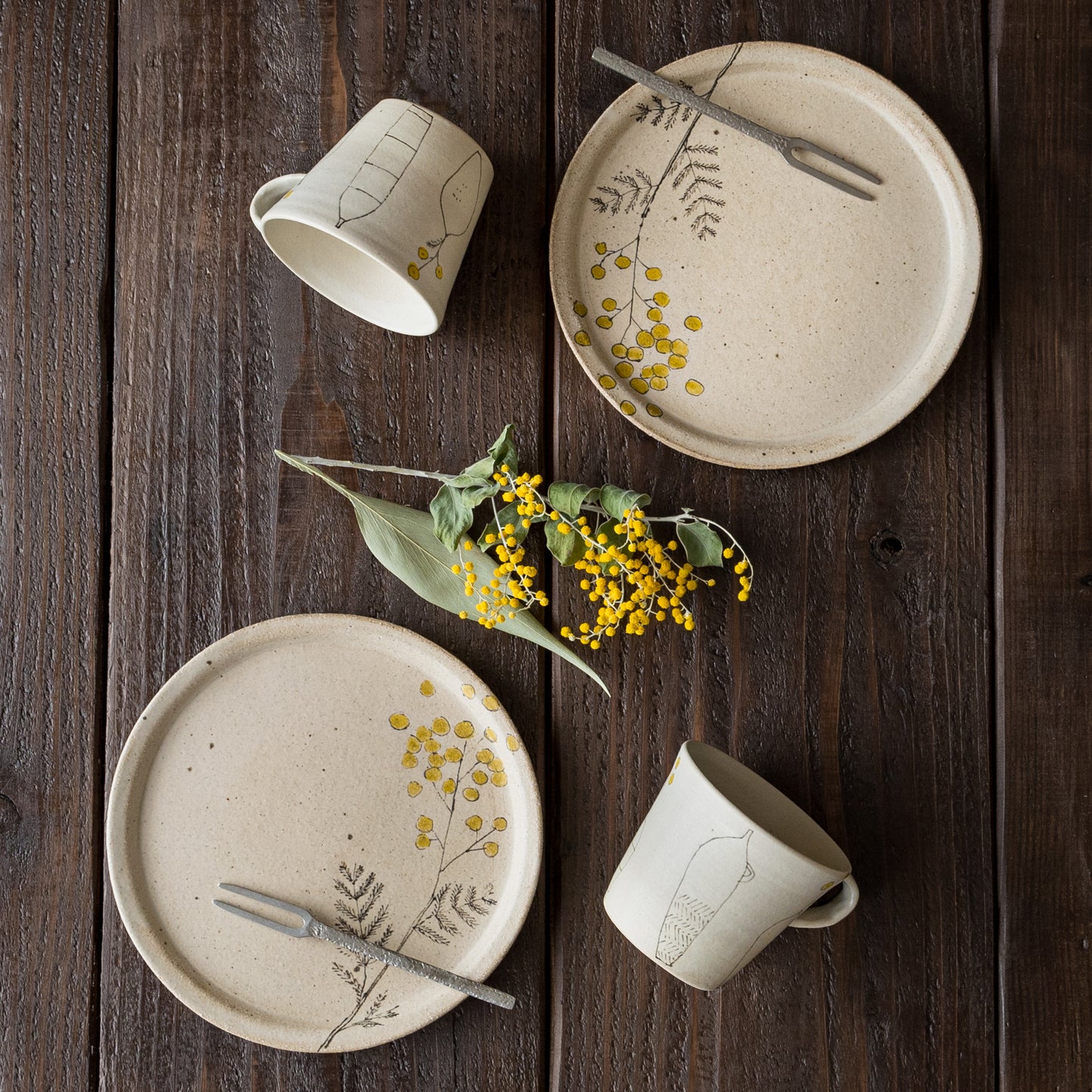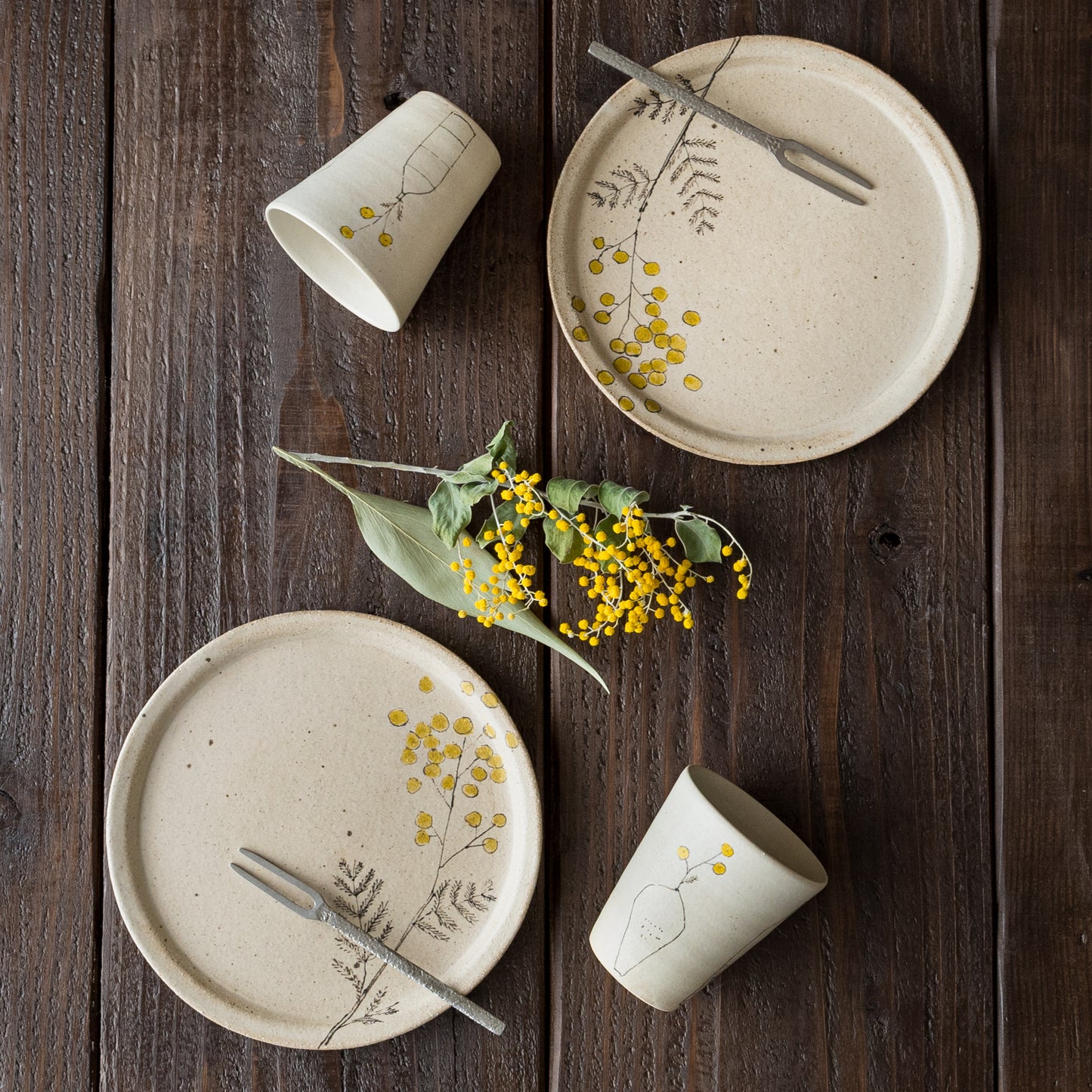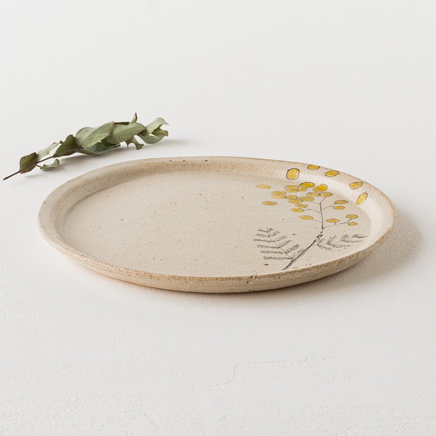 やさしいタッチで描かれた愛らしいミモザ。フリーハンドで描いているので穏やかで柔らかな表情に。眺めているだけで心に安らぎを与えてくれます。