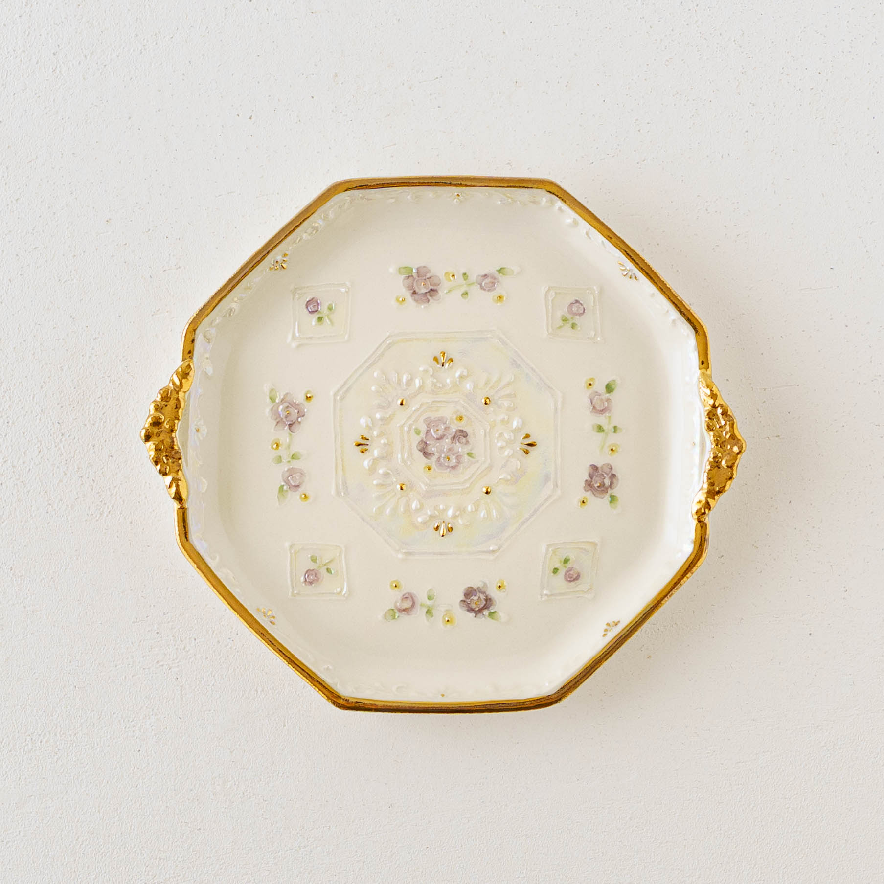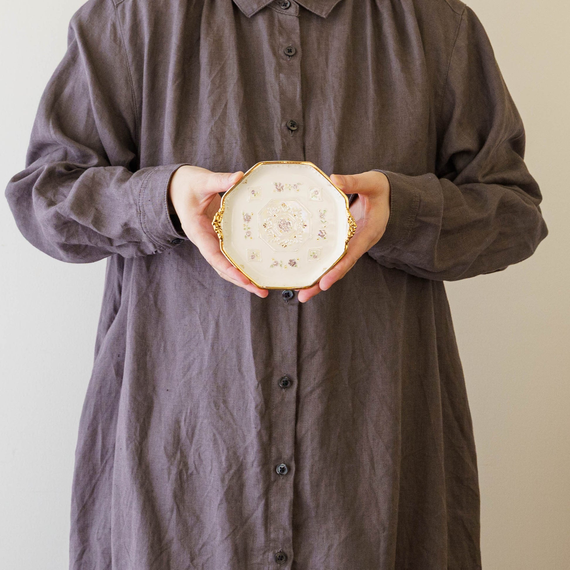 真珠ラスター液という名前の通り真珠のように輝く絵の具と金彩を施したエレガントなうつわは、光の角度で表情を変え、淡い虹色のきらめきを放ちます。光の角度によって表情を変え、まるで夜空に散りばめられた星々のように移ろいます。三度の焼成を経て完成するその姿は、手に取るたびに幻想的な光が舞い降り、静かに心をときめかせてくれます。