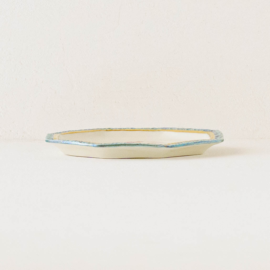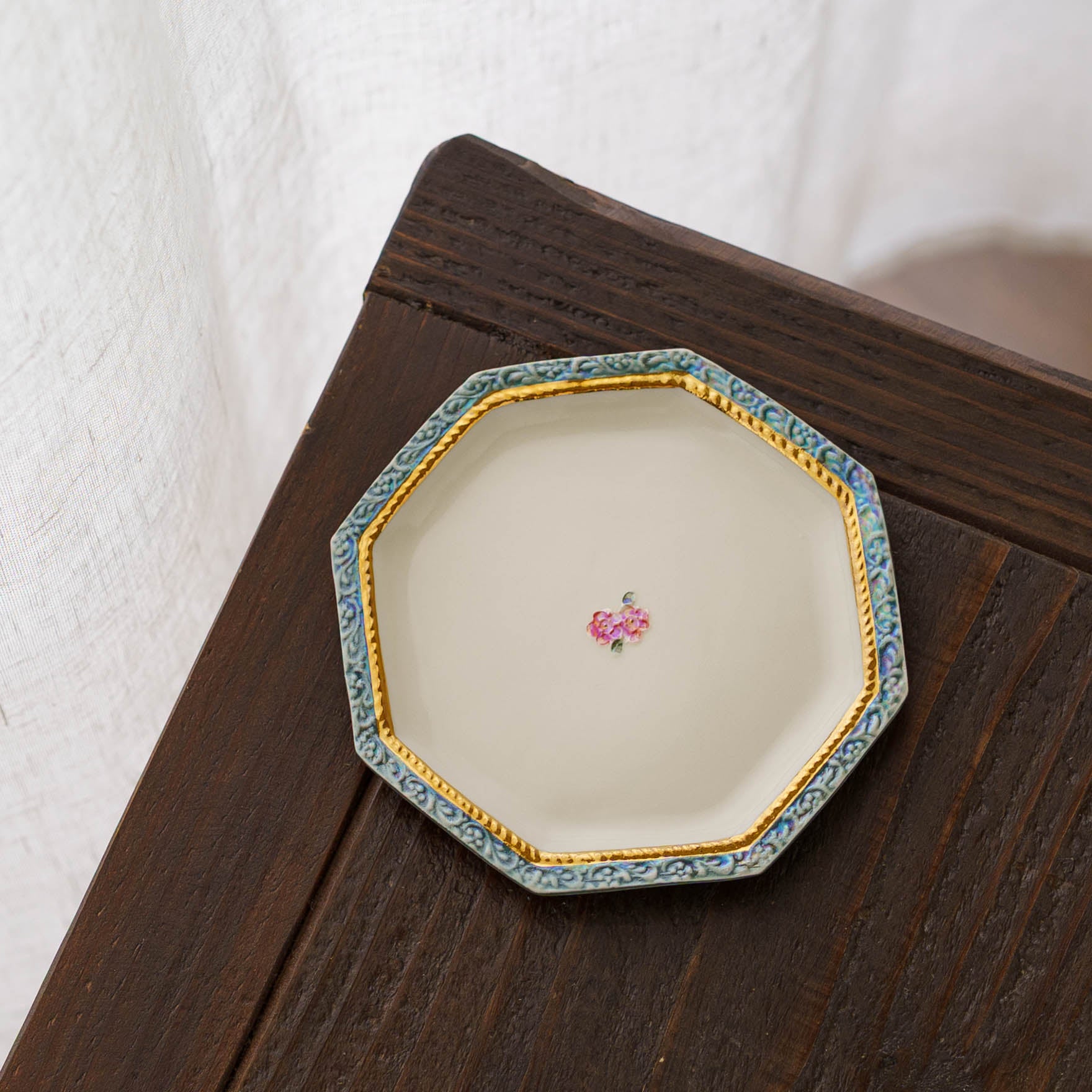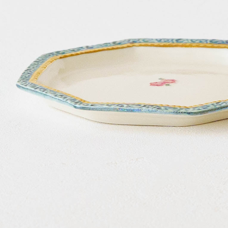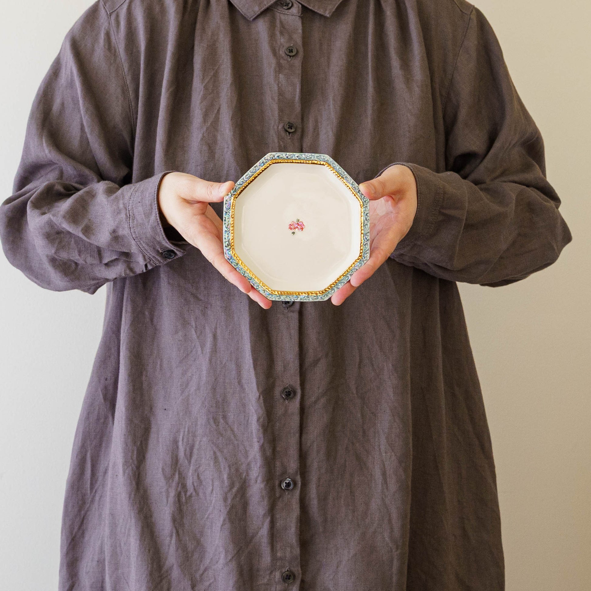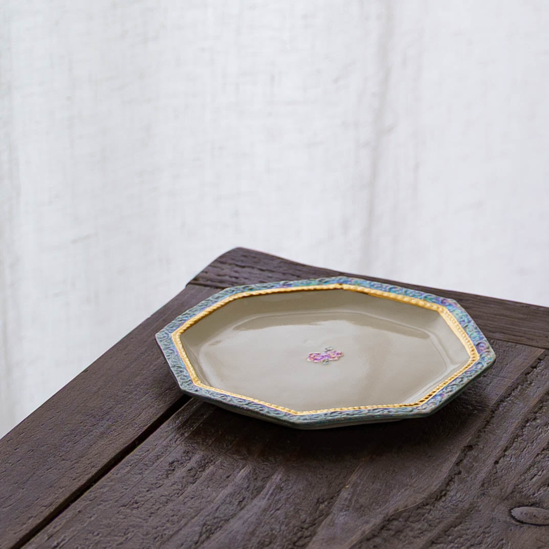 真珠ラスター液という名前の通り真珠のように輝く絵の具と金彩を施したエレガントなうつわは、光の角度で表情を変え、淡い虹色のきらめきを放ちます。光の角度によって表情を変え、まるで夜空に散りばめられた星々のように移ろいます。三度の焼成を経て完成するその姿は、手に取るたびに幻想的な光が舞い降り、静かに心をときめかせてくれます。