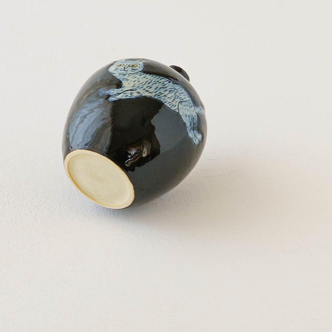 くるくると変わるねこの姿がイメージできるような楽し気な表情に、深海の底に光が差し込んだような静謐な空気感を漂わせた瑠璃色に心奪われます。見る人を夢のような世界へと誘ってくれるかのようです。