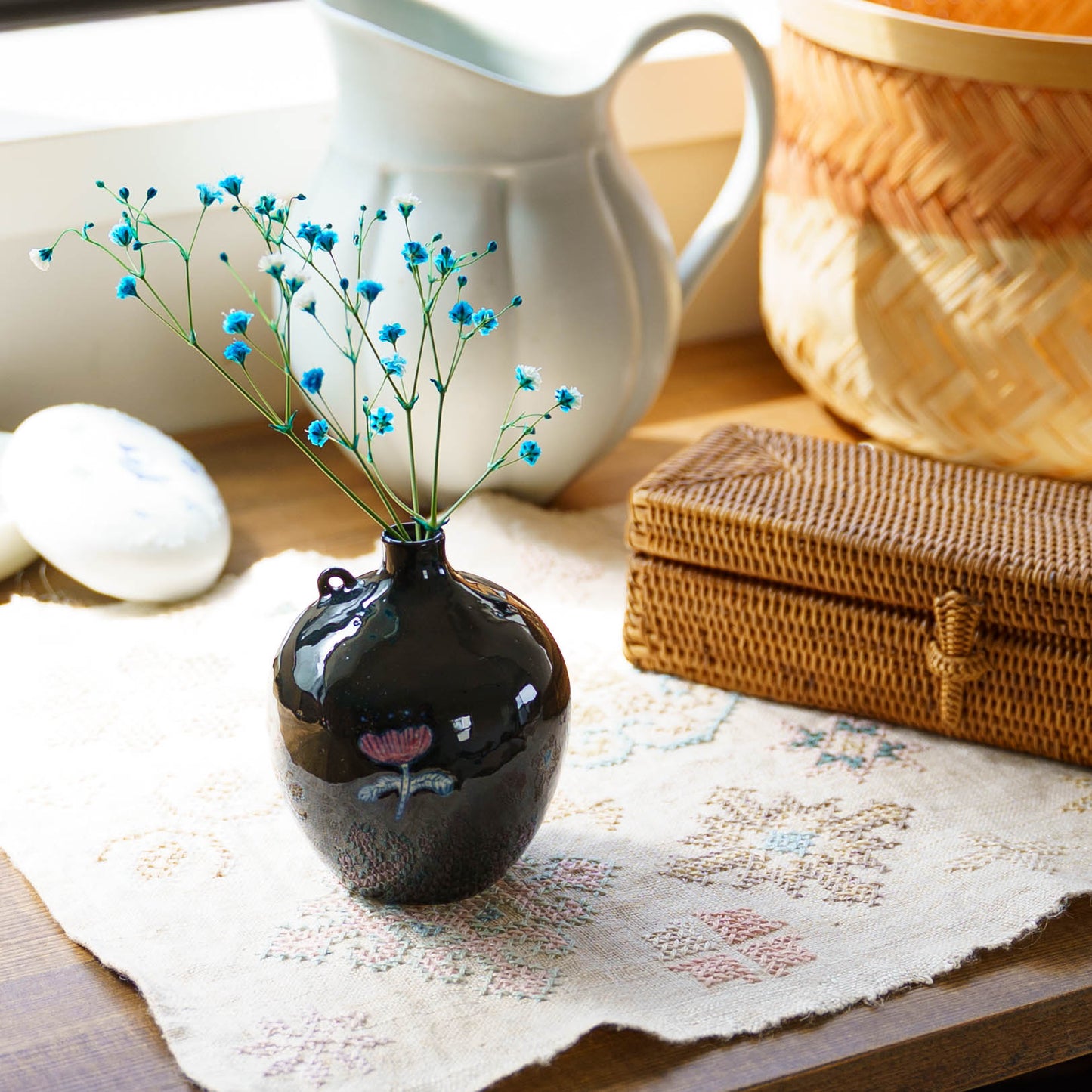 静かな美しさを放った瑠璃色。小さな花をそっと挿すだけで、空間に華やぎを添えてくれます。そこにあるだけで心を和ませ、眺めるたびに新たな美しさを感じさせてくれる一輪挿しです。
