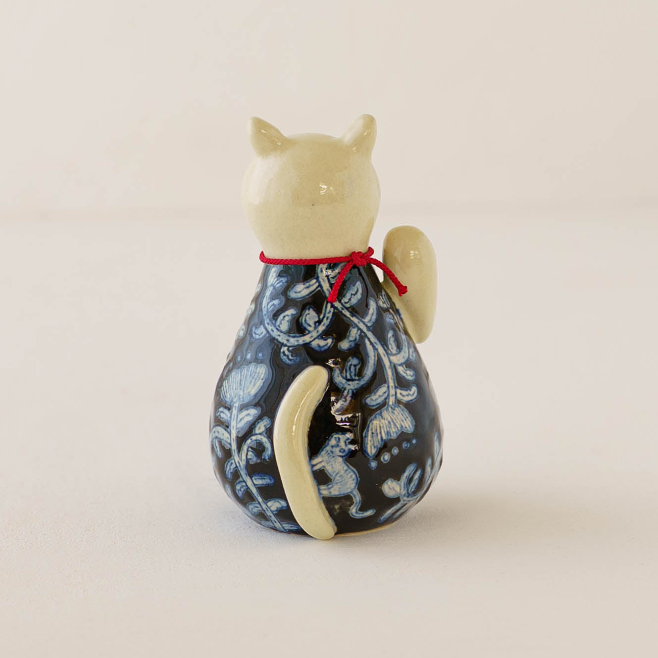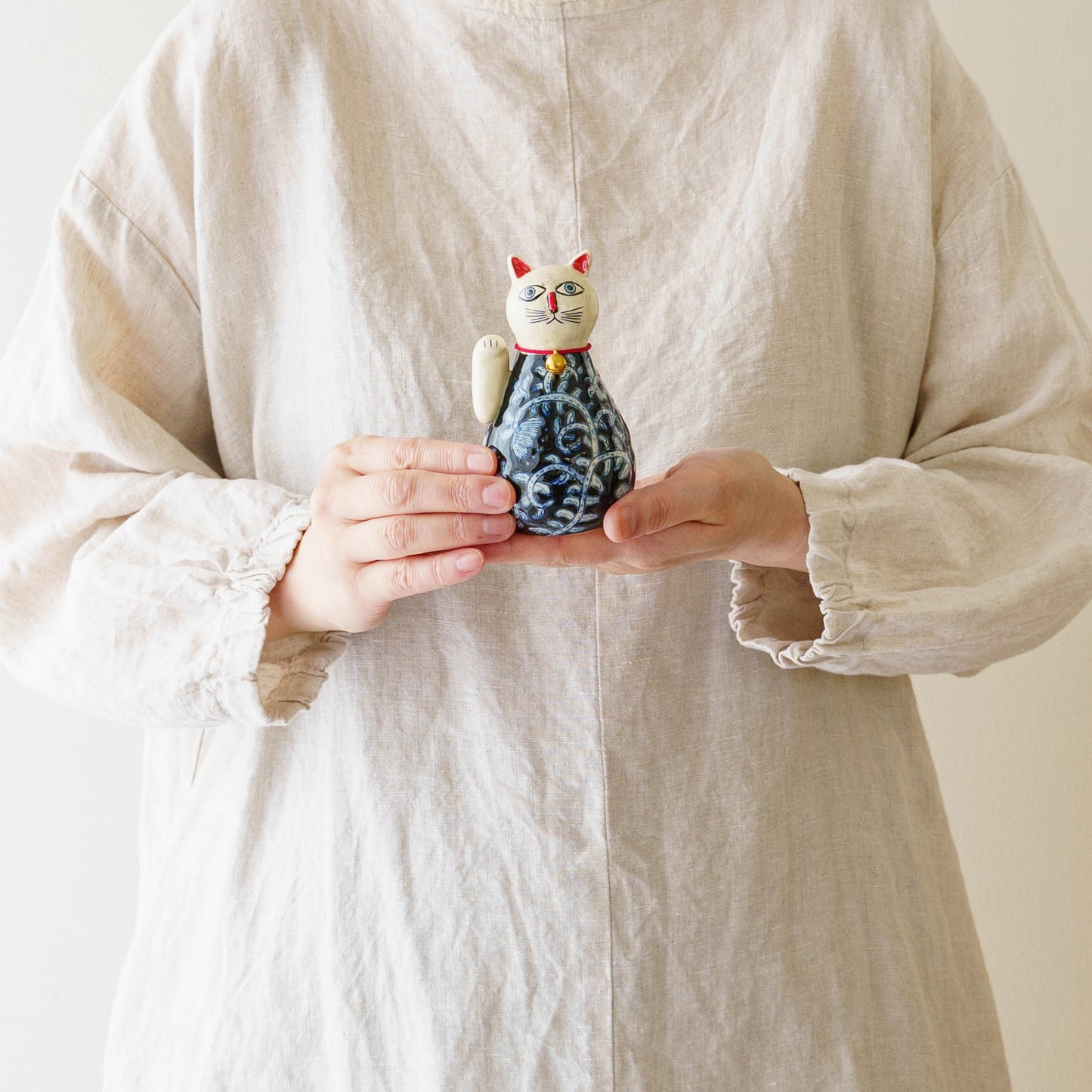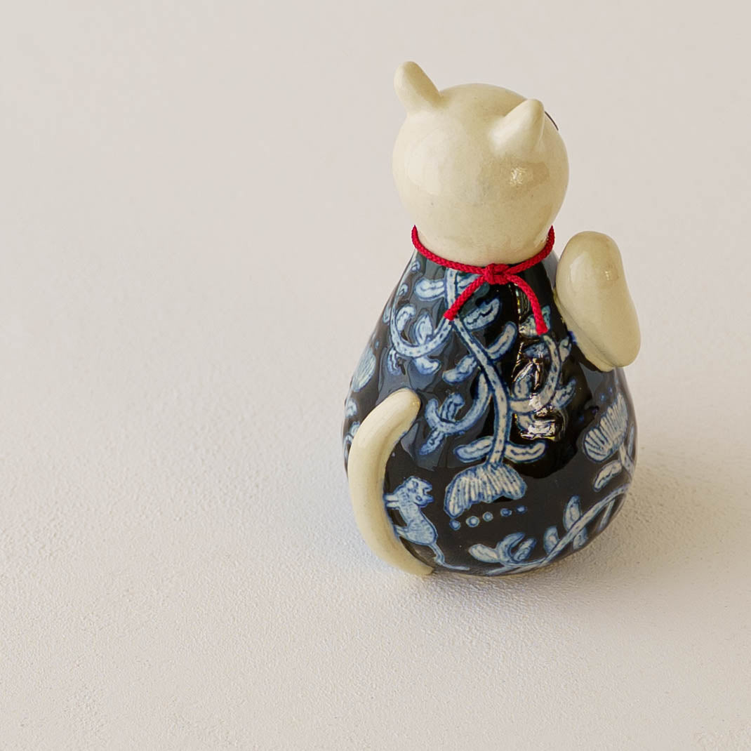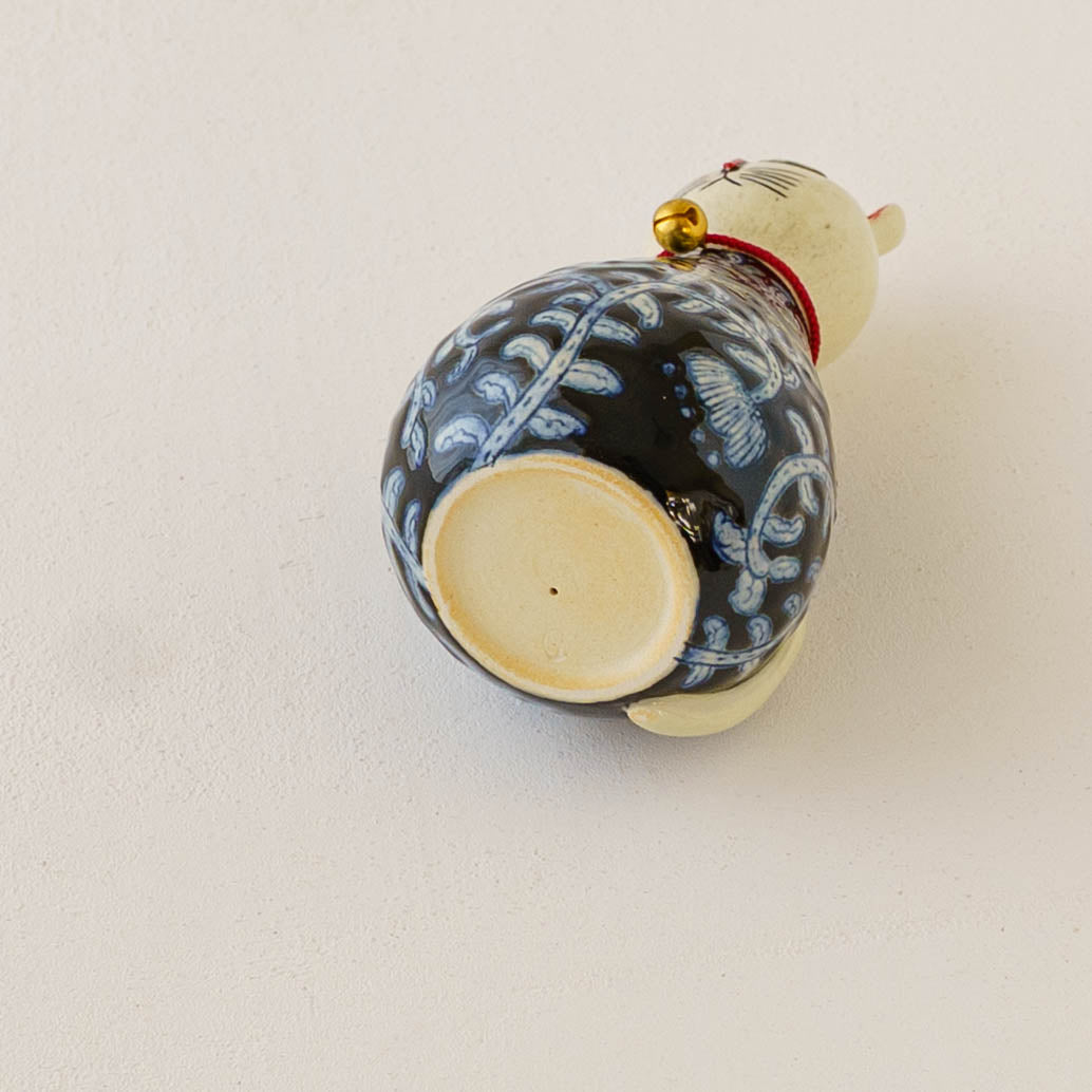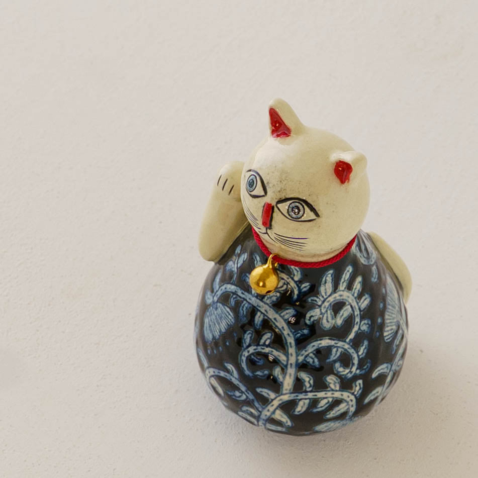 内部に陶のかけらが入っているので、振るとシャンシャンとやさしい音が響きます。首輪の鈴の音と重なって素敵な音色を奏でてくれます。愛らしい表情とやさしい音色と共に、日々にそっと寄り添い、たくさんの福を招いてくれますように。