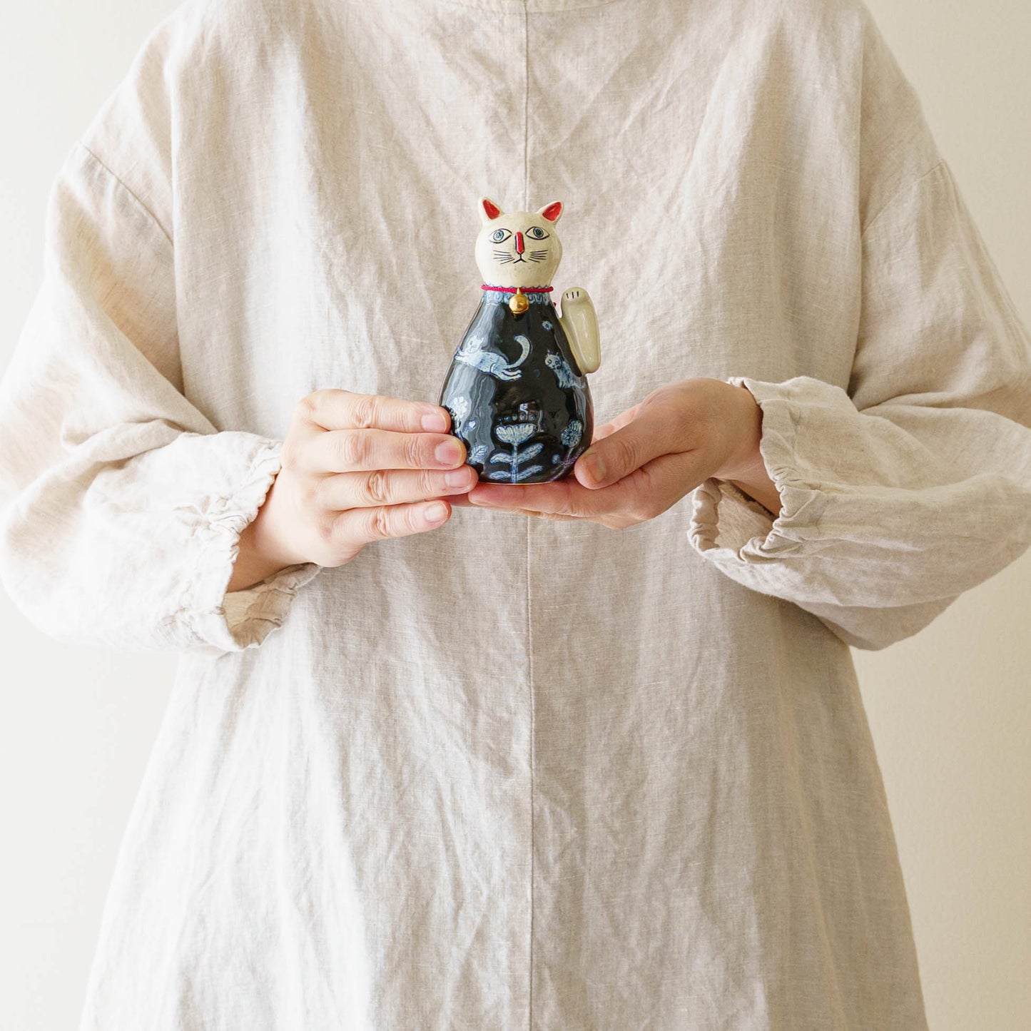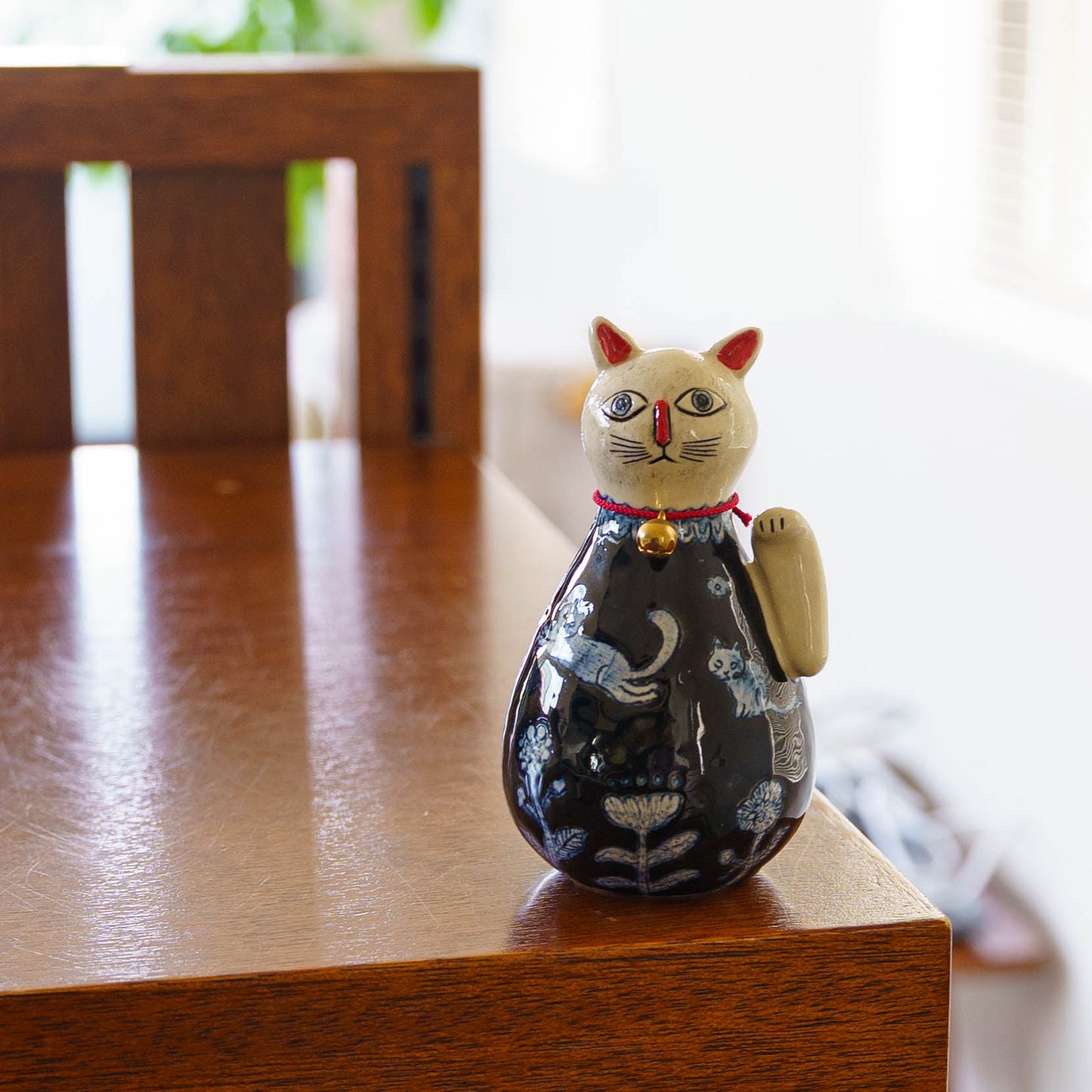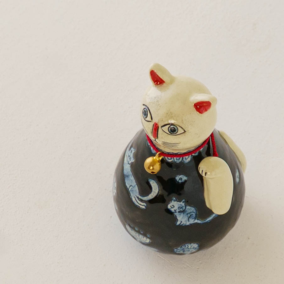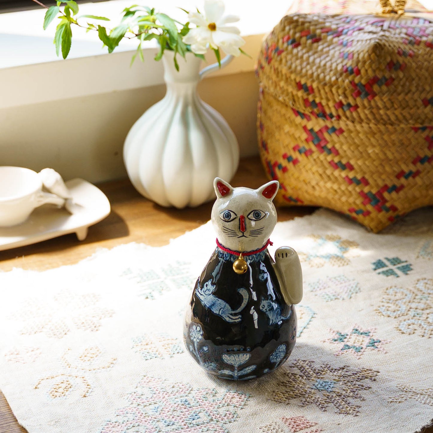 ころんと丸みを帯びたやさしいフォルムに、ねこ特有の愛らしさと凛とした佇まいが感じられる招き猫。洗練されたデザインと柔らかなラインが、遊び心と落ち着きを絶妙に融合させていて、どんな空間にもさりげなく華やぎを添えてくれます。
