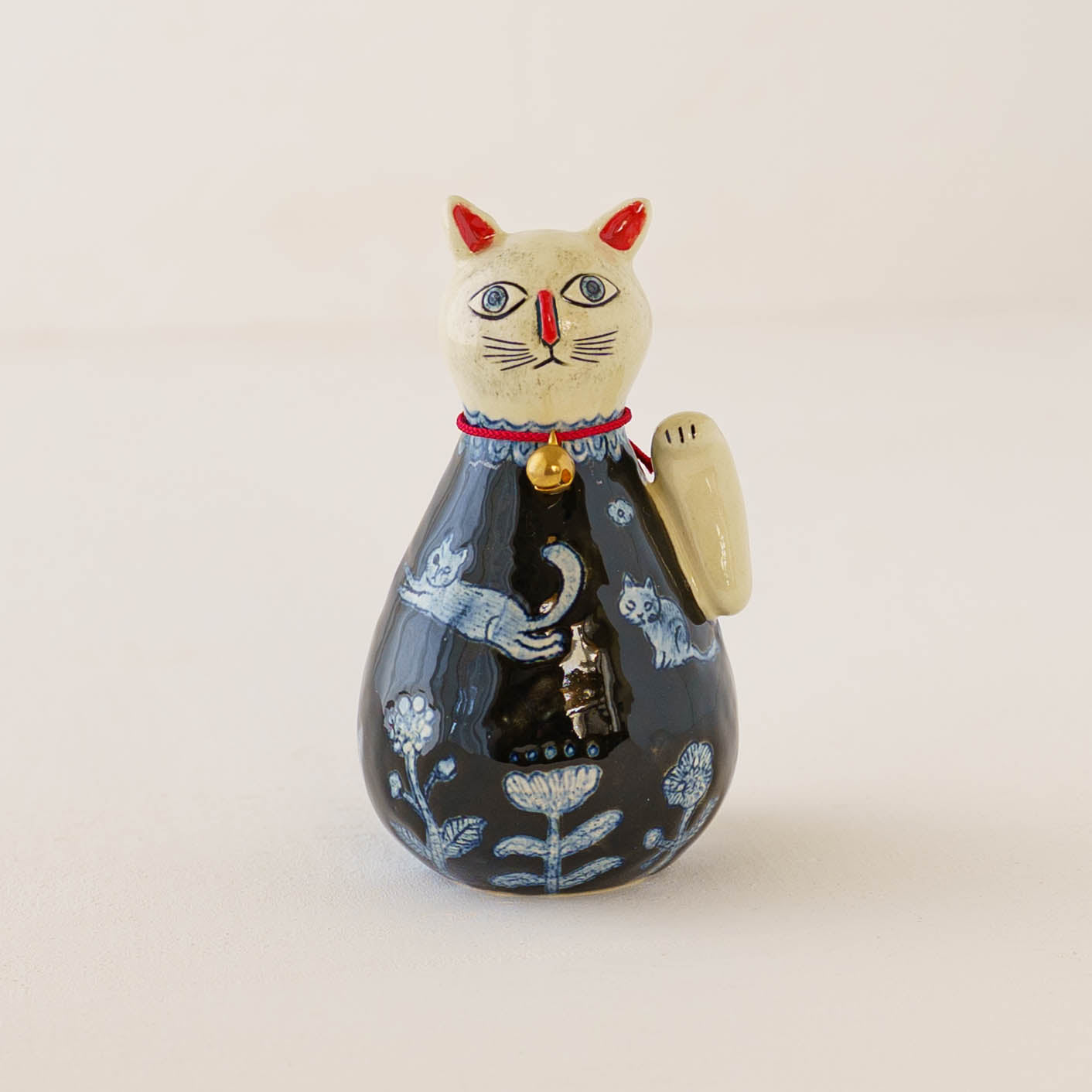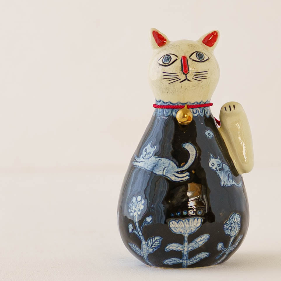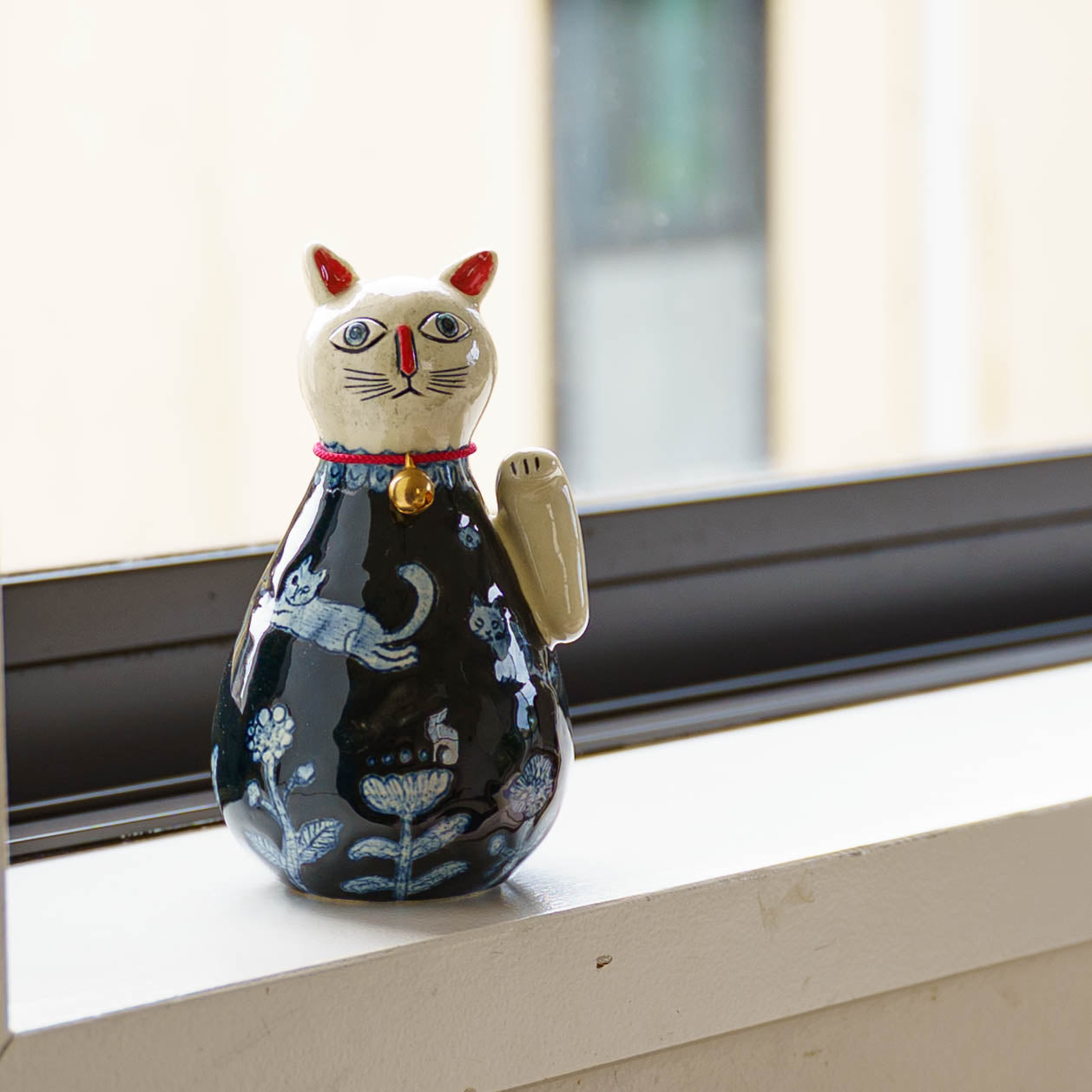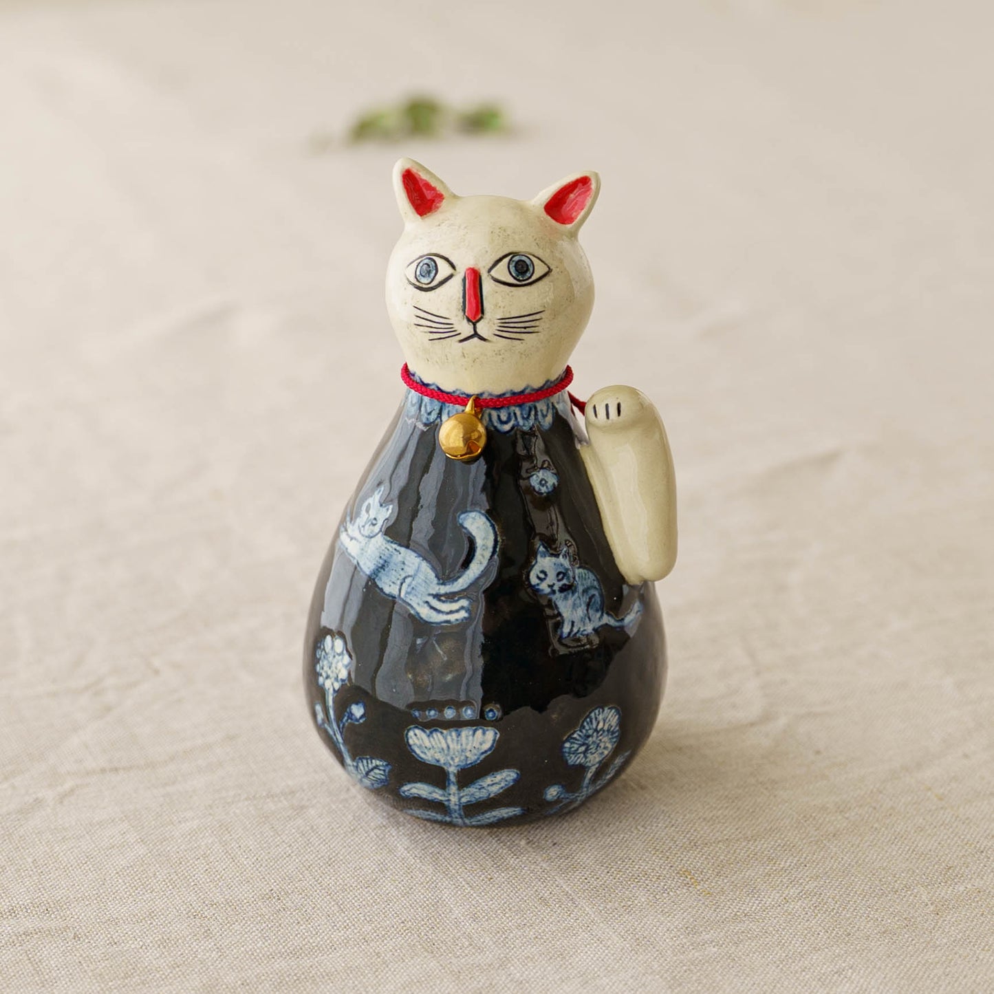 ころんと丸みを帯びたやさしいフォルムに、ねこ特有の愛らしさと凛とした佇まいが感じられる招き猫。洗練されたデザインと柔らかなラインが、遊び心と落ち着きを絶妙に融合させていて、どんな空間にもさりげなく華やぎを添えてくれます。