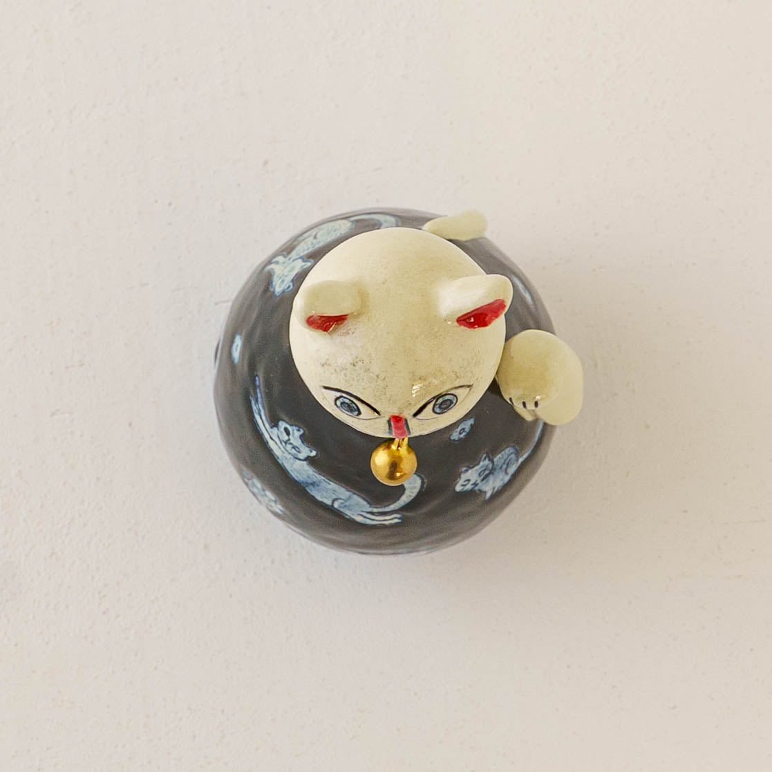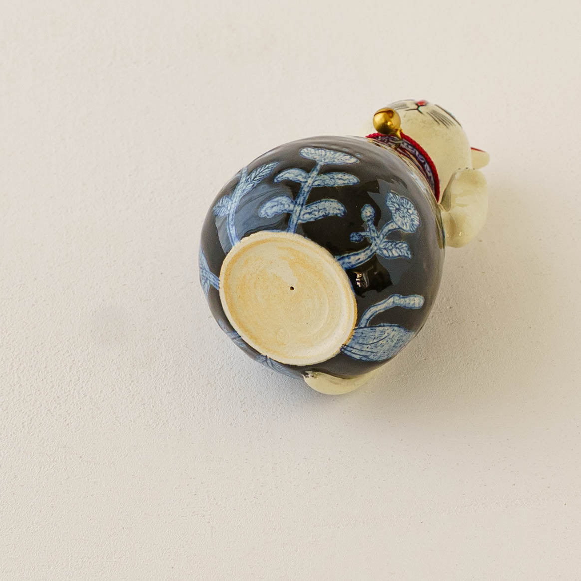 内部に陶のかけらが入っているので、振るとシャンシャンとやさしい音が響きます。首輪の鈴の音と重なって素敵な音色を奏でてくれます。愛らしい表情とやさしい音色と共に、日々にそっと寄り添い、たくさんの福を招いてくれますように。