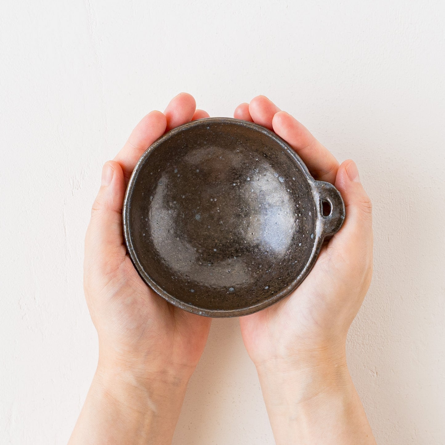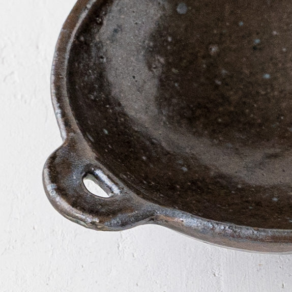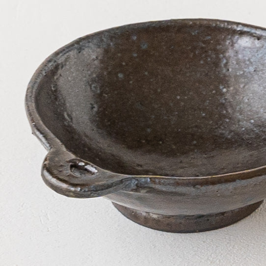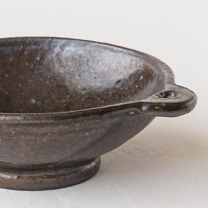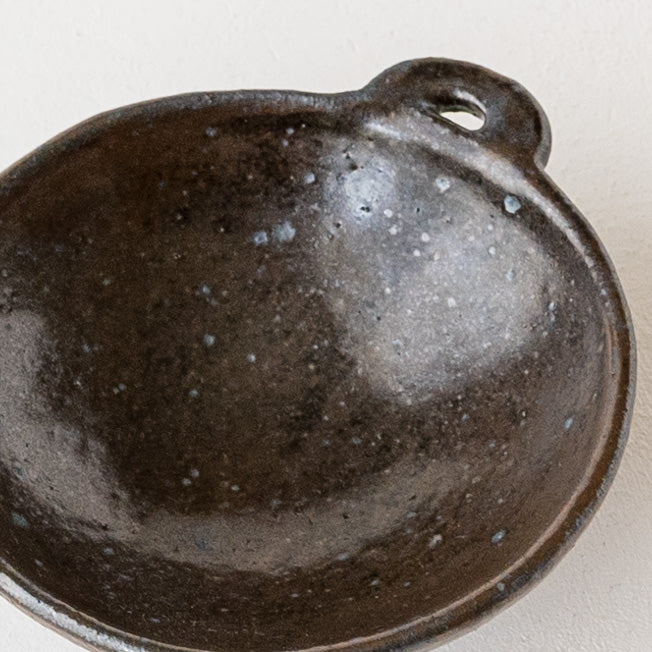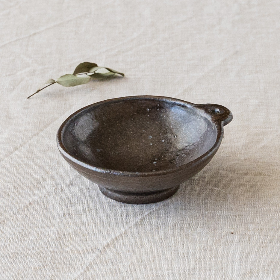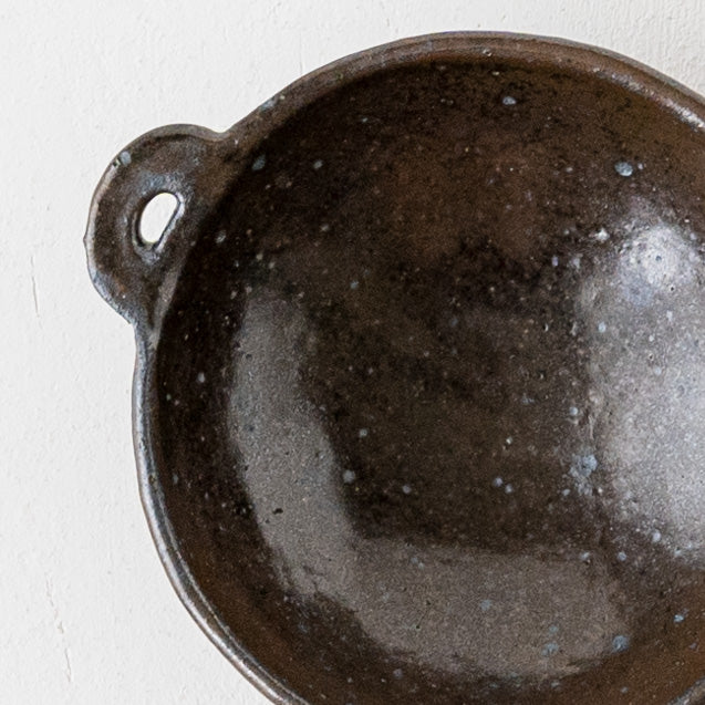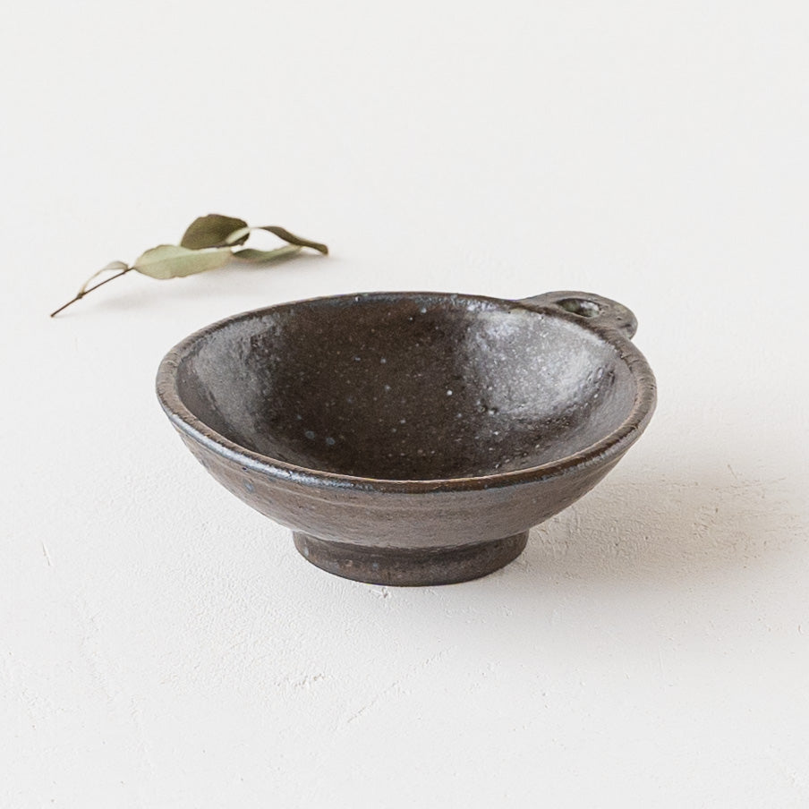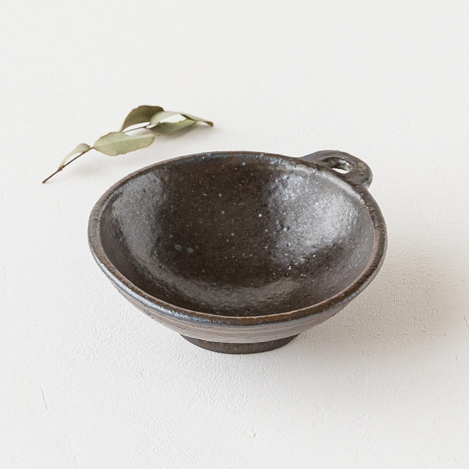 こっくりとした深みのある色合いが素敵な黒にちょこんと付いた持ち手が愛らしい小鉢。顔料で黒く色付け後、釉薬を掛けられています。均一にならないようあえて刷毛塗りをしているので豊かな表情に。使っていくと少しずつしっとりとした風合いになっていきます。