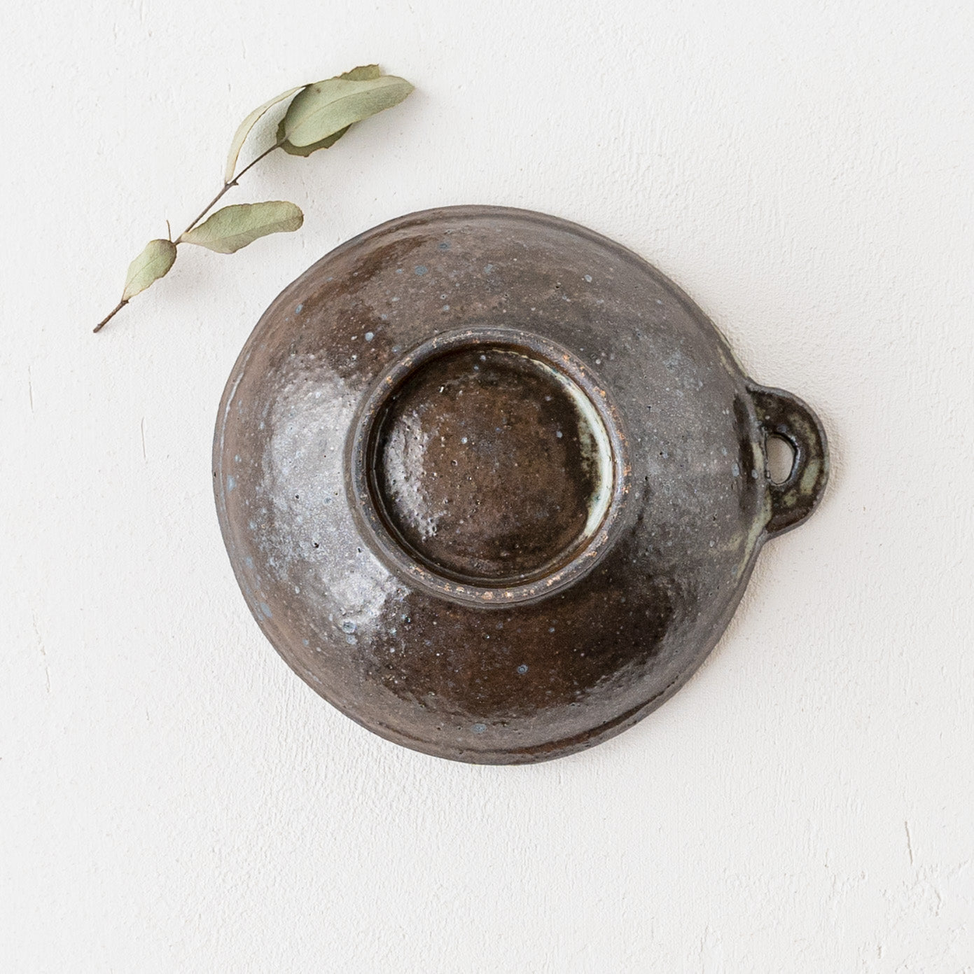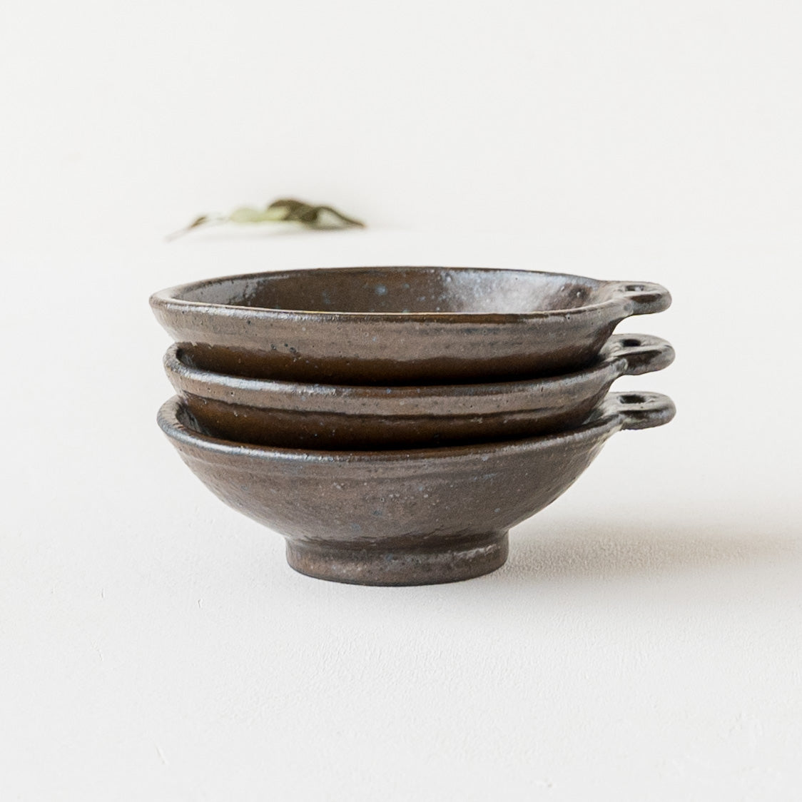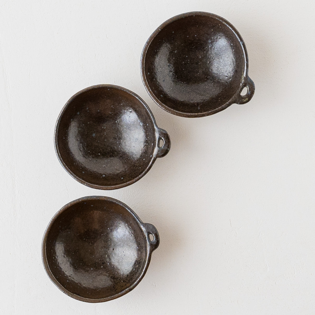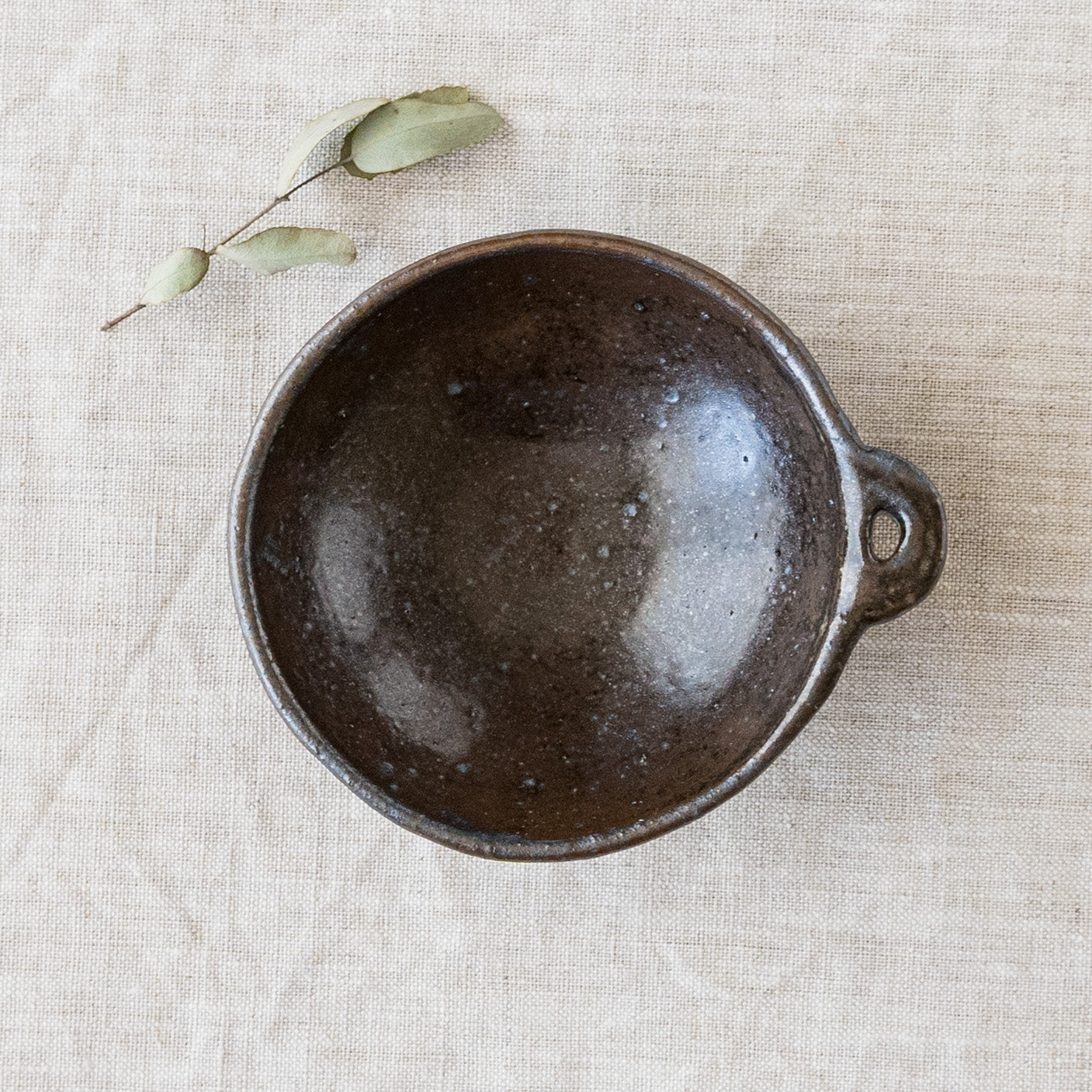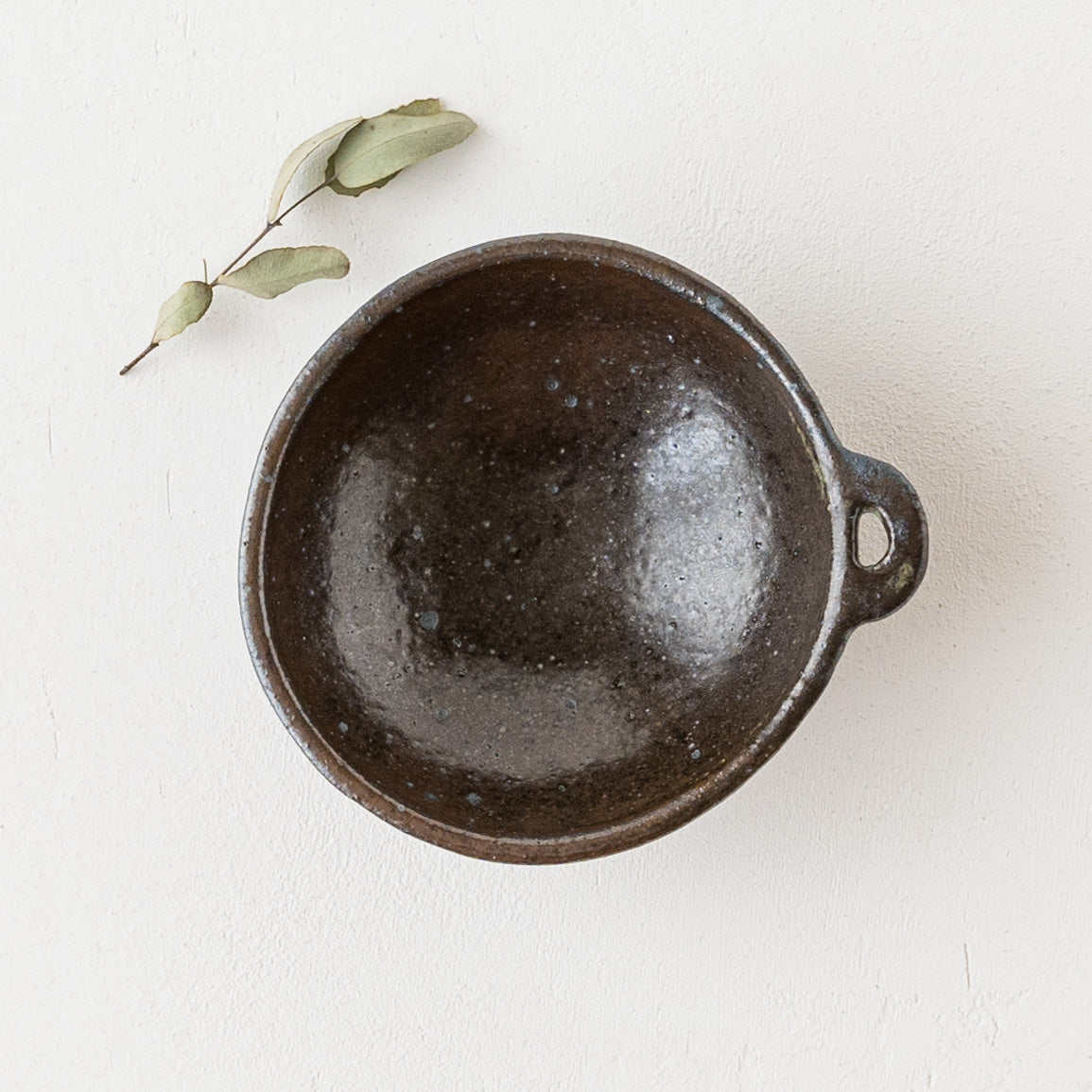 こっくりとした深みのある色合いが素敵な黒にちょこんと付いた持ち手が愛らしい小鉢。顔料で黒く色付け後、釉薬を掛けられています。均一にならないようあえて刷毛塗りをしているので豊かな表情に。使っていくと少しずつしっとりとした風合いになっていきます。