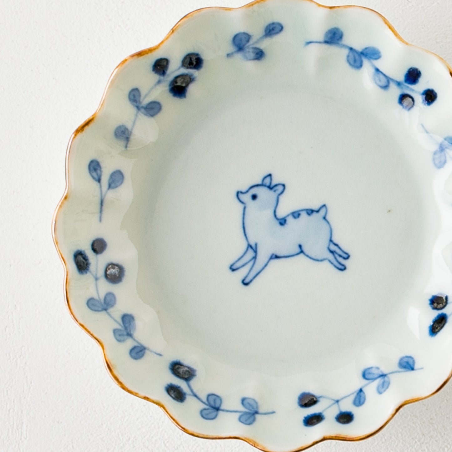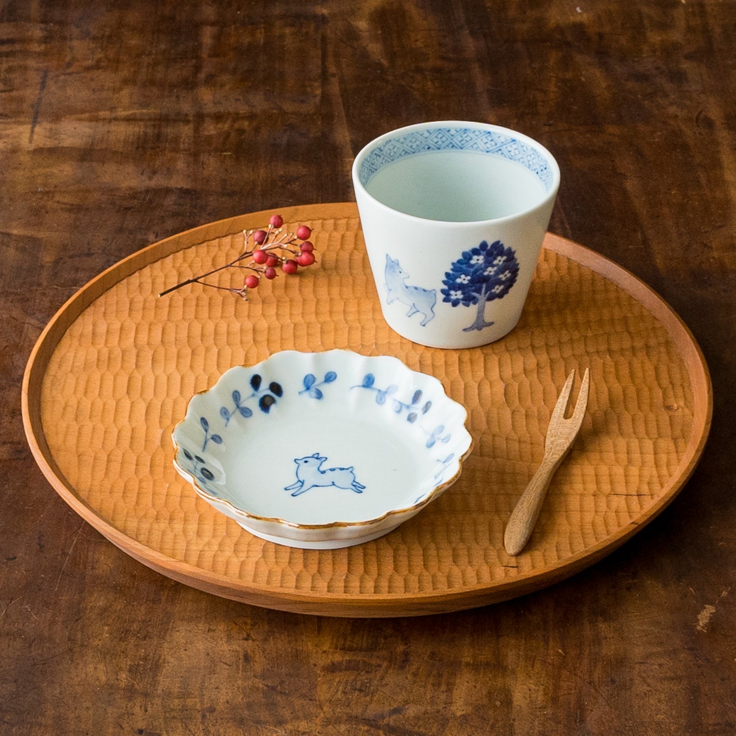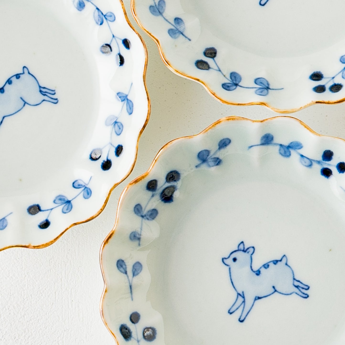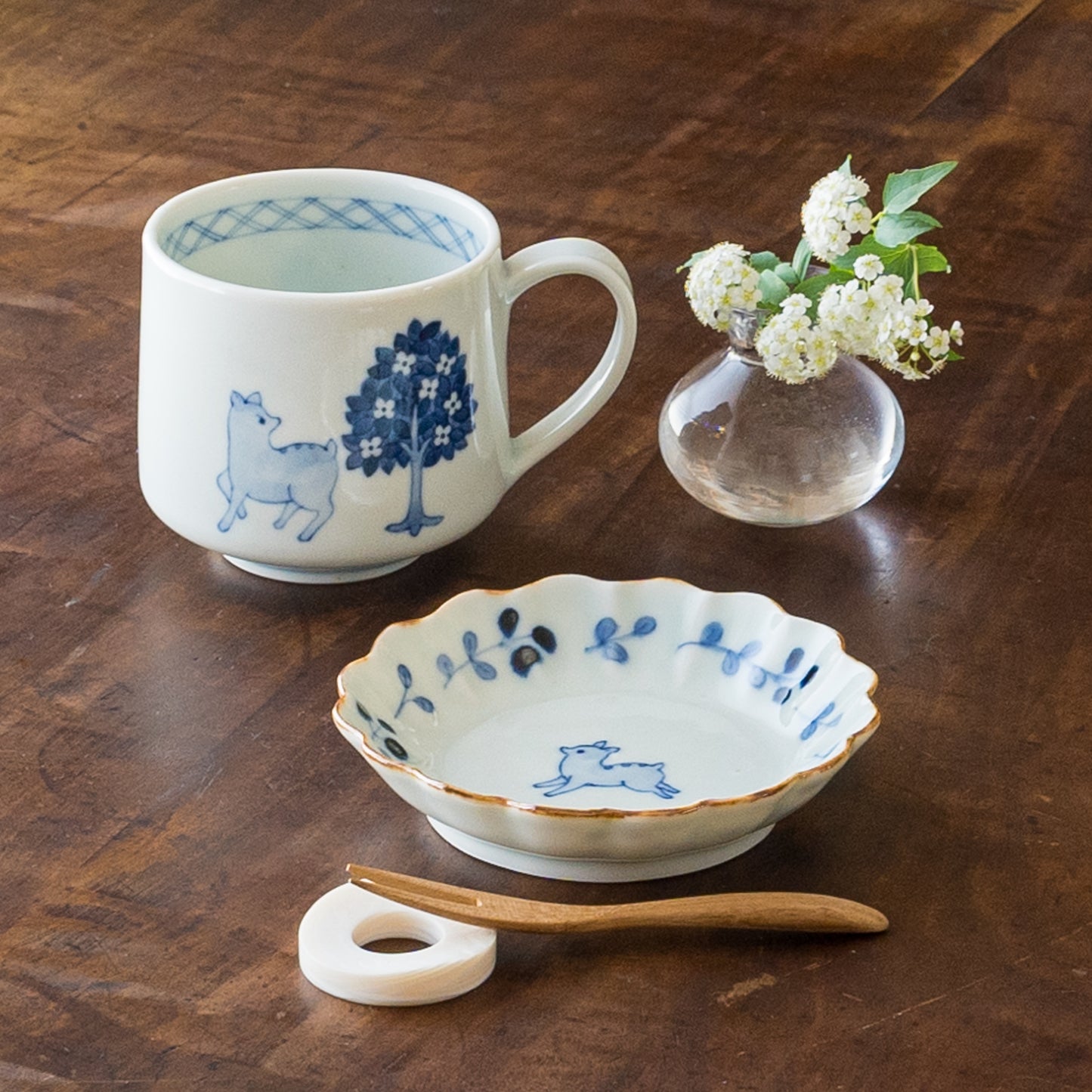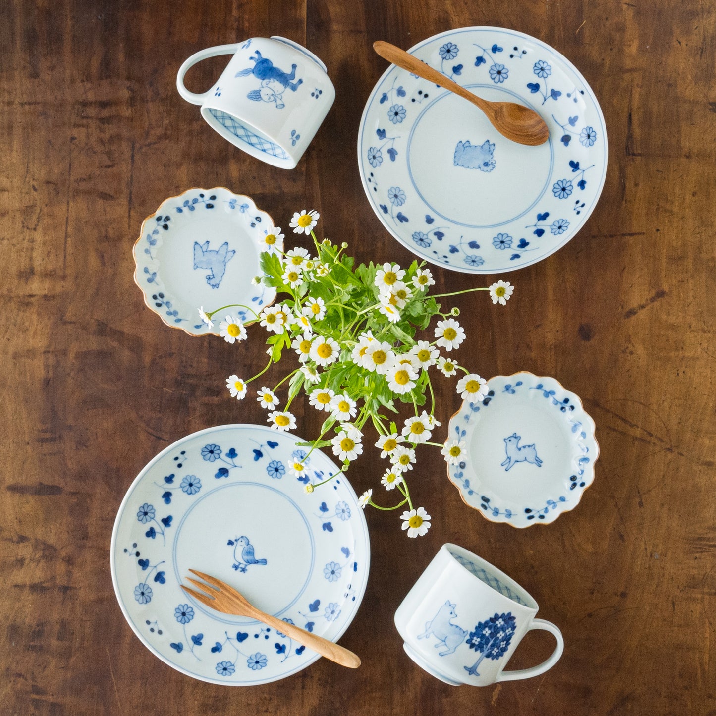 瀬戸の伝統的な瀬戸染付、芙蓉手からインスパイアを受けた文様構成にやさしく穏やかな気持ちにしてくれる愛らしい動物たちがお互い違和感なく調和しているのでずっと眺めていたくなります。
