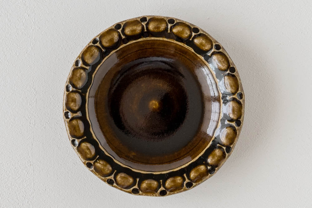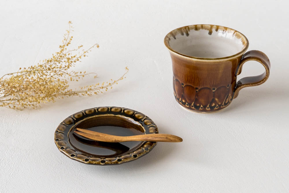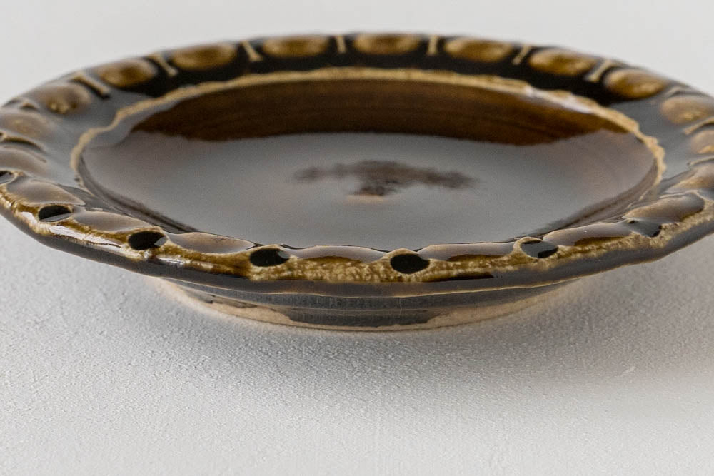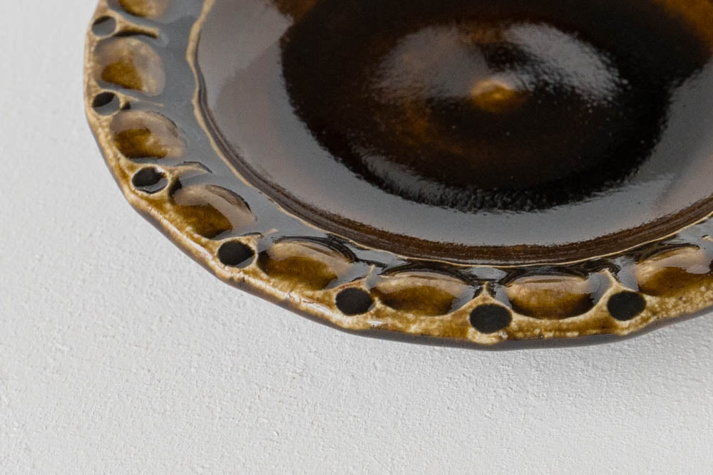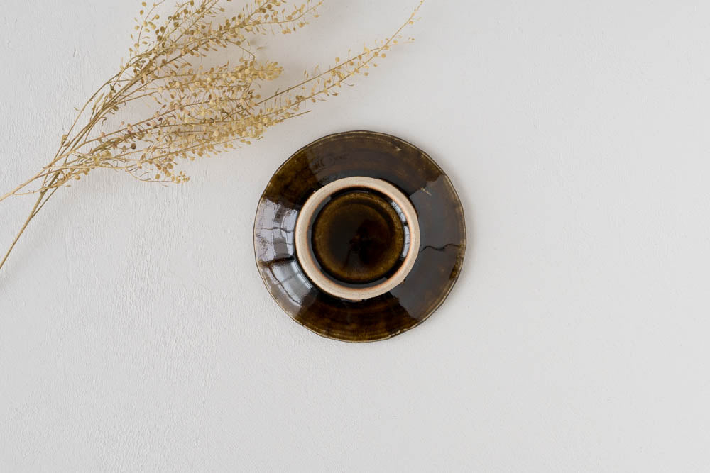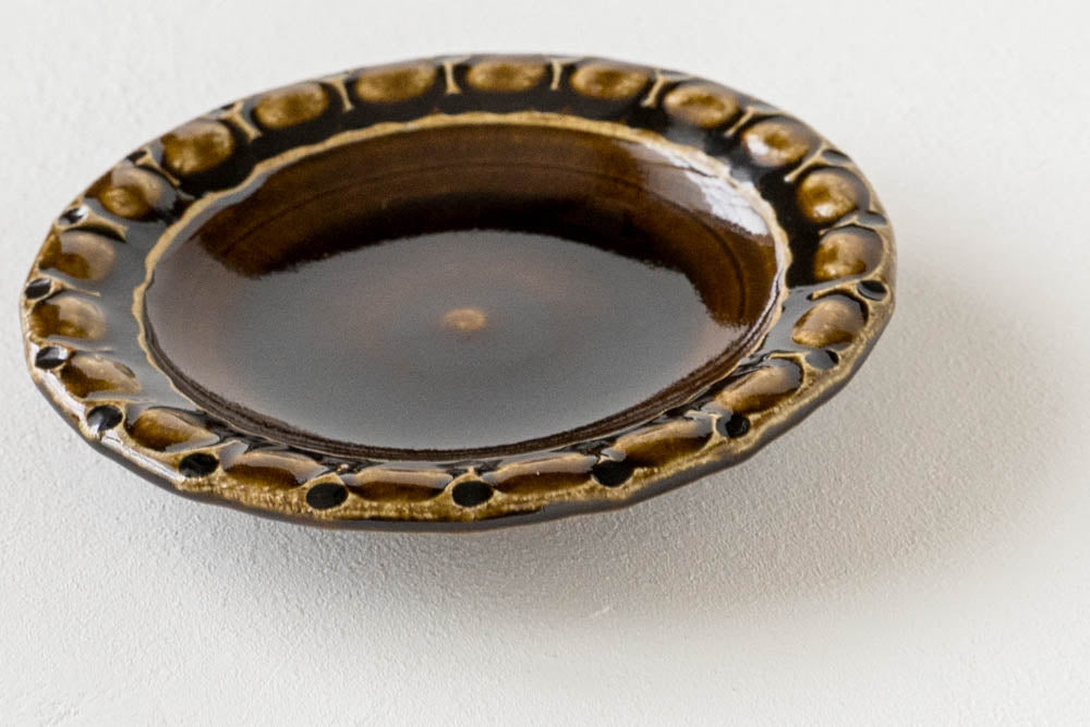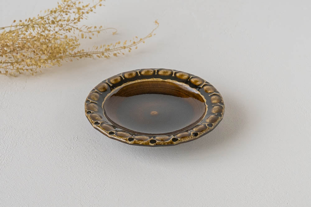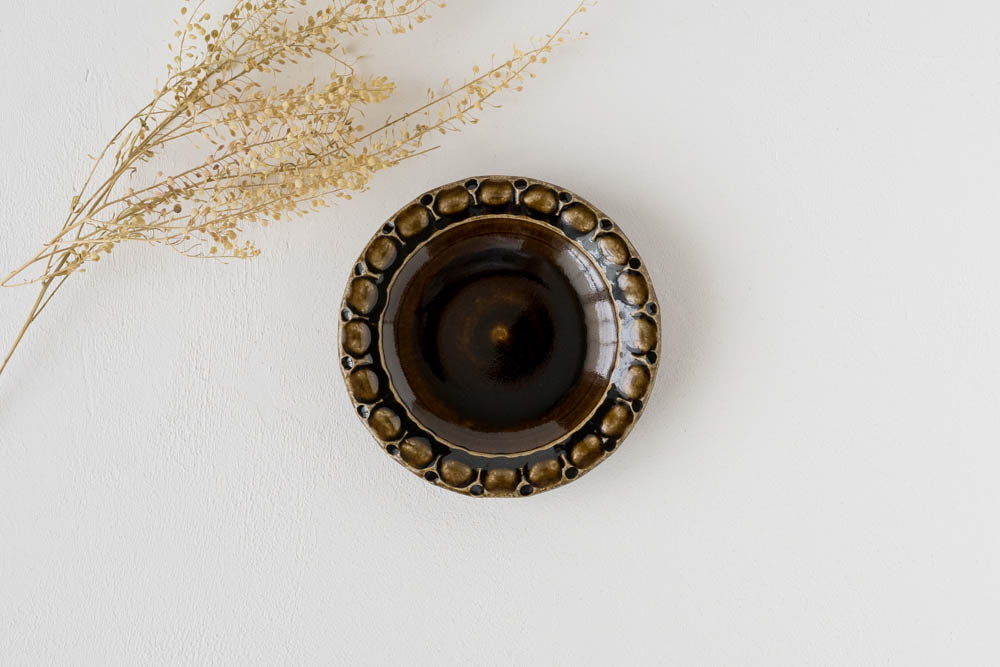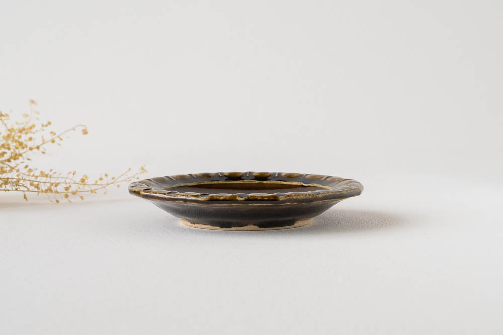 大地や木々など自然の風合いを感じる渋く落ち着いたあたたかみのあるこげ茶色の小皿です。光の加減によって光り輝いたり、深みのある落ち着いた感じになったりさまざまな表情を楽しませてくれます。