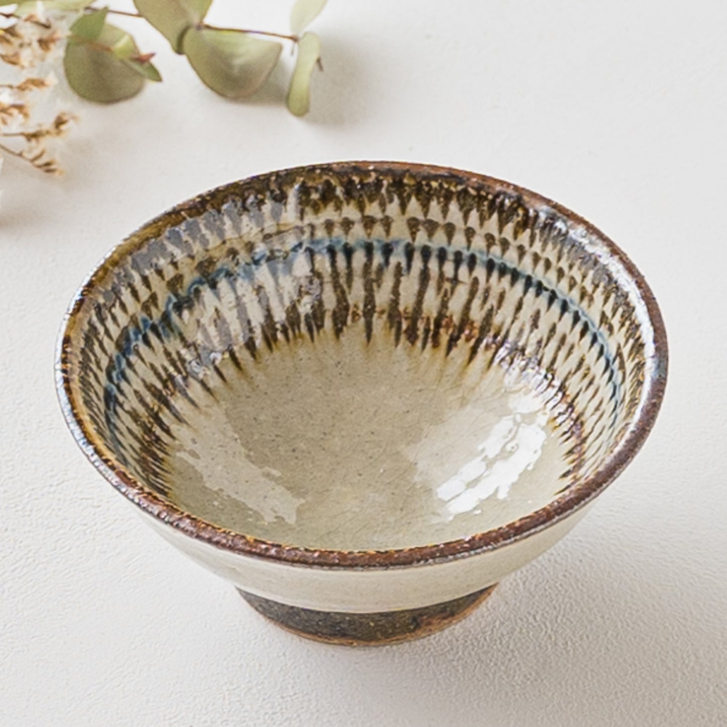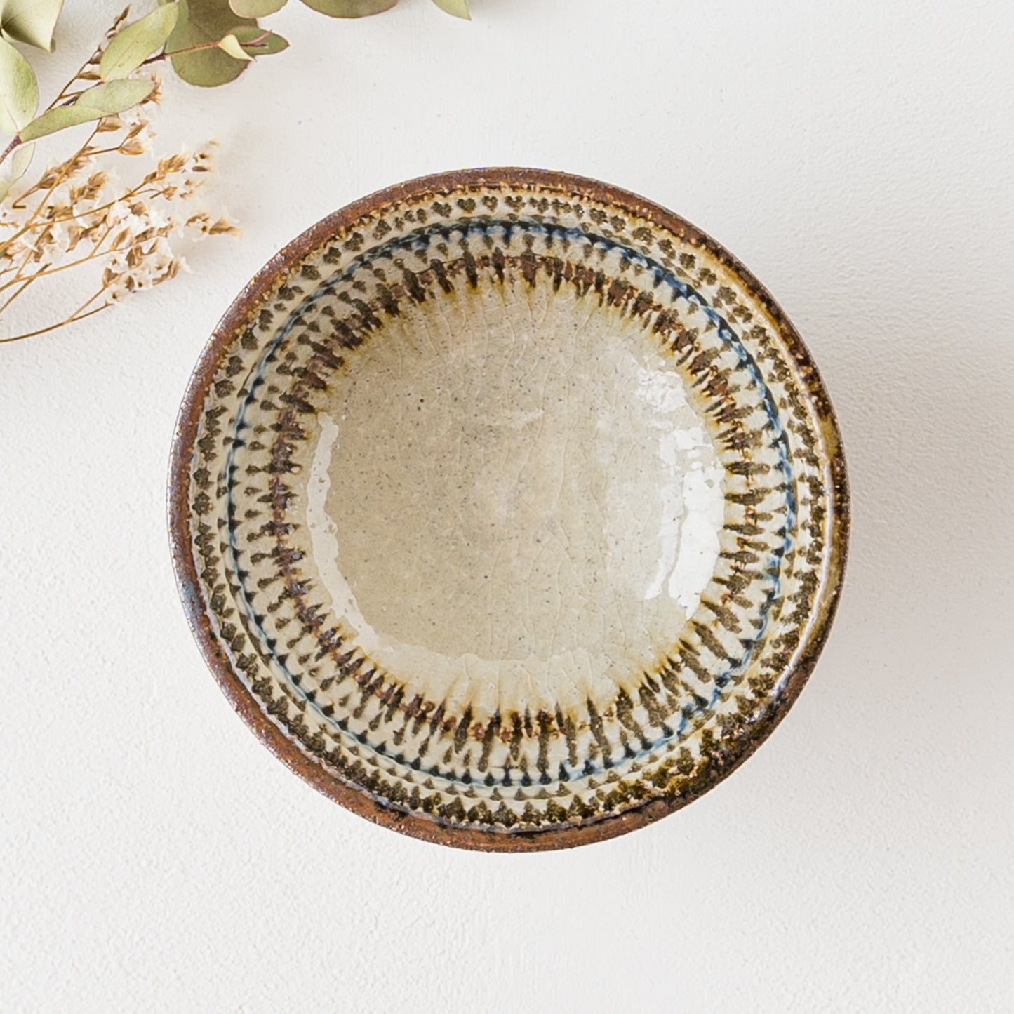 飛びカンナの素朴で温もりのある風合いと呉須の一本線がアクセントになってお料理を優しく彩ってくれます。また細かな貫入も見られて土ものの味わいを感じます。全体的につるっとした手触りですが、飛びカンナ部分と縁には少しざらつきがあります。