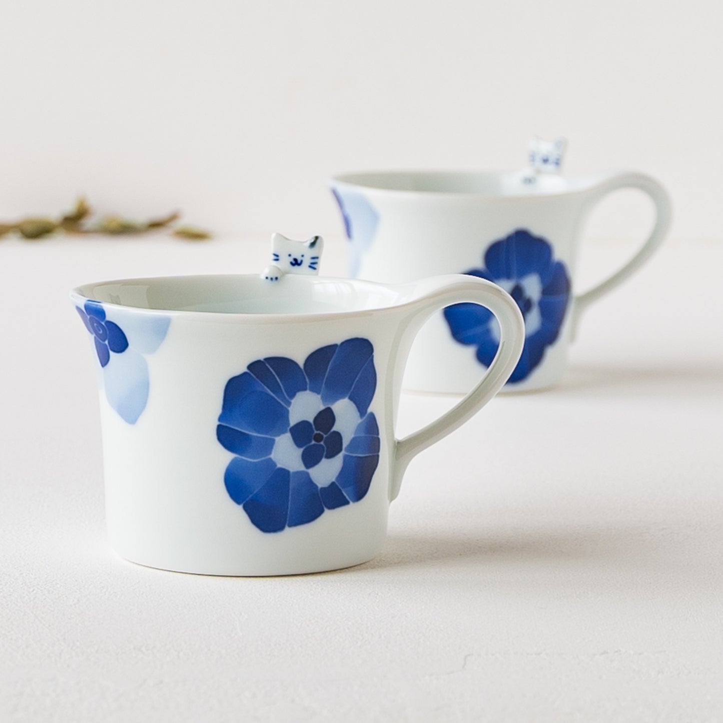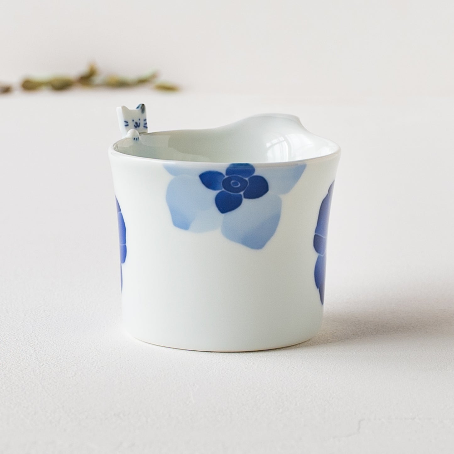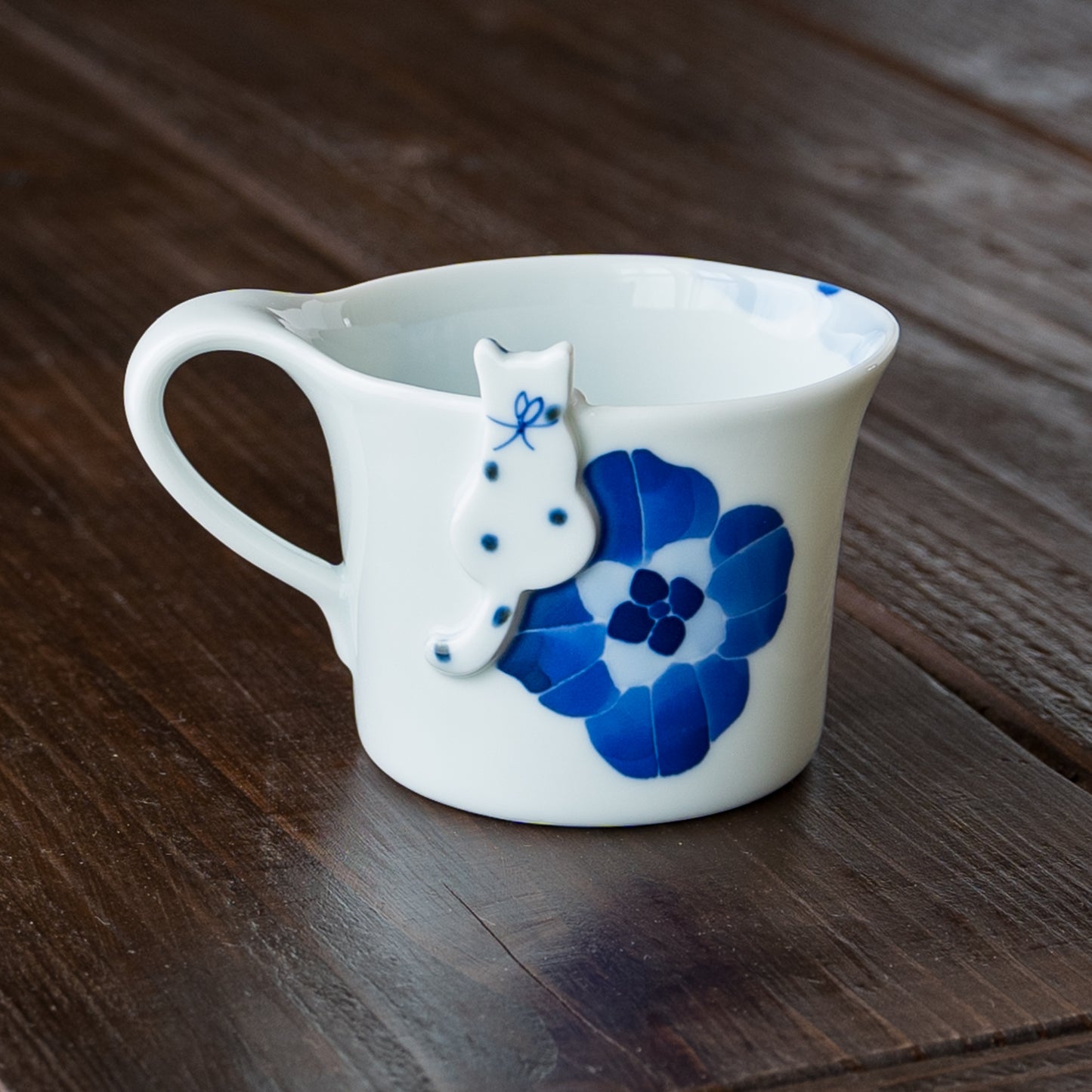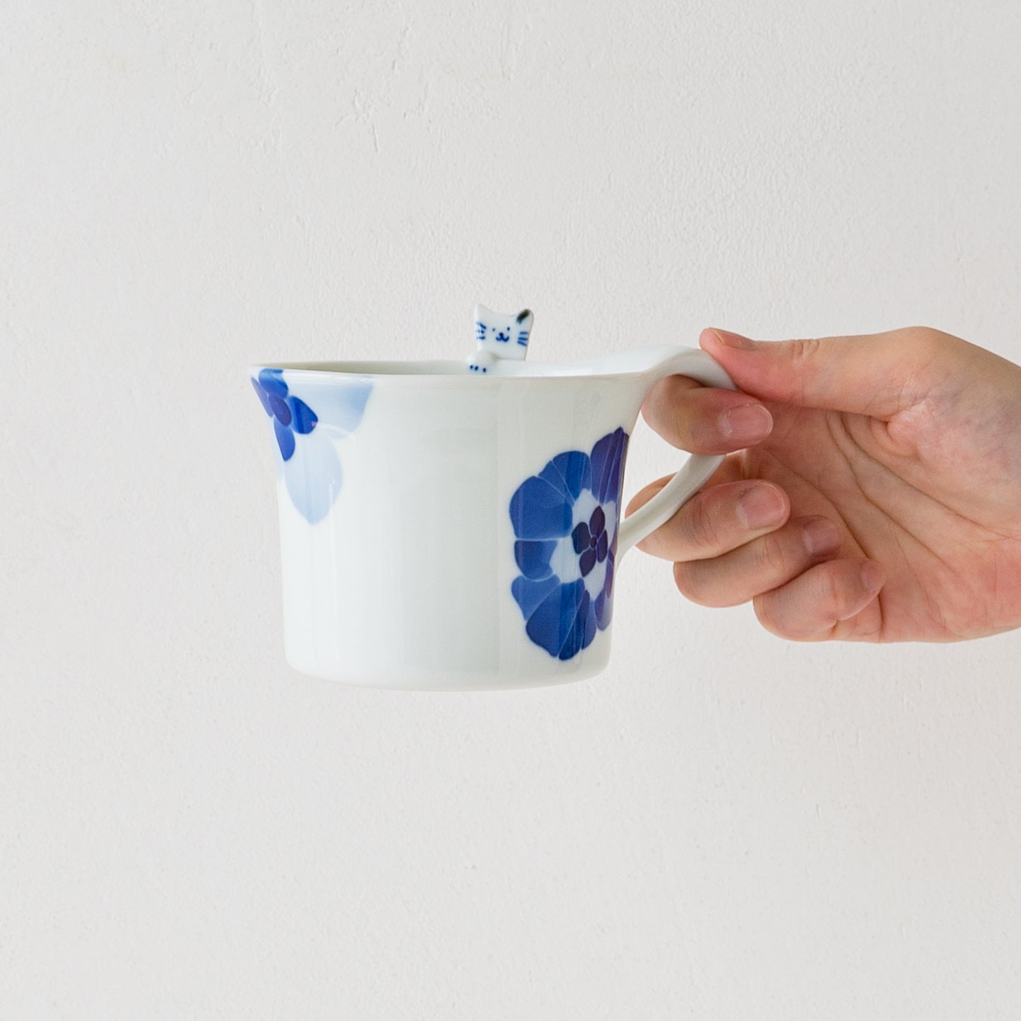 呉須の藍色のみで濃淡を生かして表情豊かにねことお花を描いています。フリーハンドで描かれているので、手仕事ならではの温もりを感じさせてくれます。