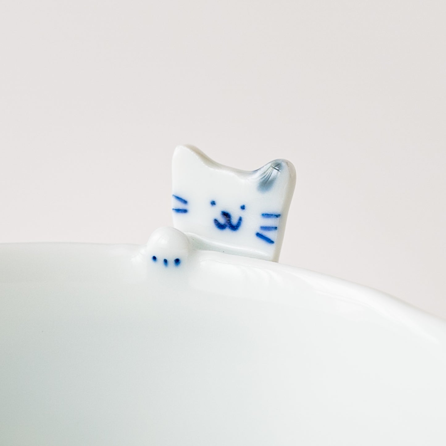 カップの縁にちょこんと顔を出したねこの表情がたまらなく可愛くて眺めているだけでほっこり癒されます。後ろ姿もキュートで思わず顔がほころんでしまいます。