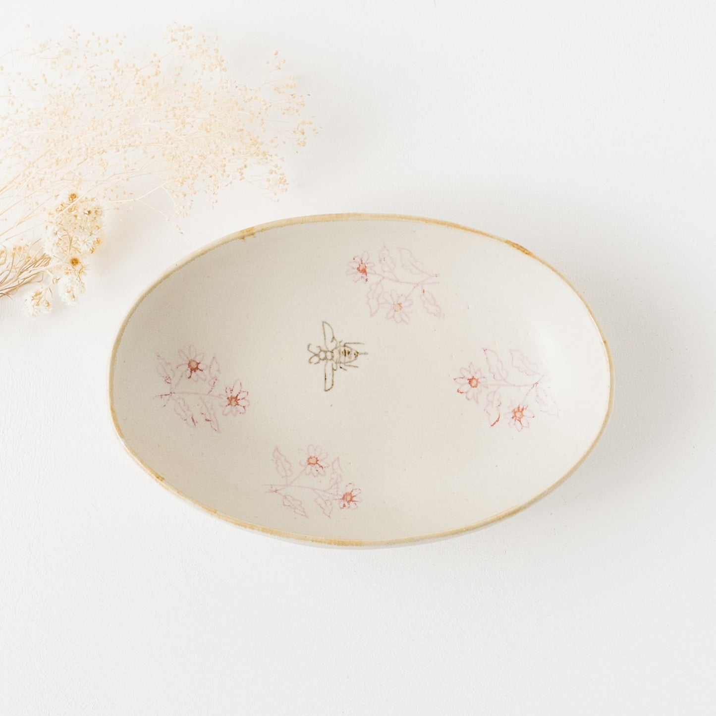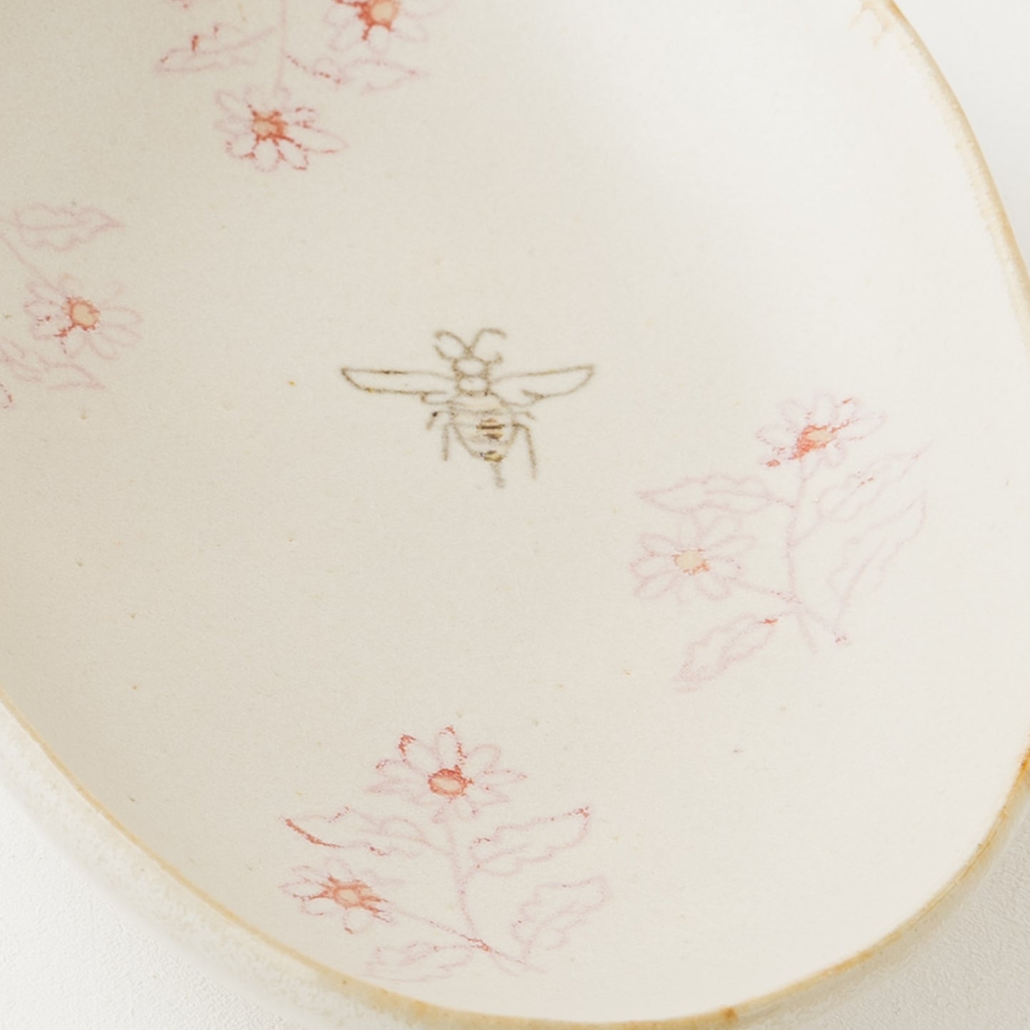 蜜を求めてお花畑を飛び回っているかわいらし蜂が絵本の中の1ページのよう。下絵をもとに彫り、そこに色を入れていく線刻という技法で描かれているので独特で柔らかなタッチの絵柄と淡くやさし気な色合いが表現されるので見惚れてしまいます。
