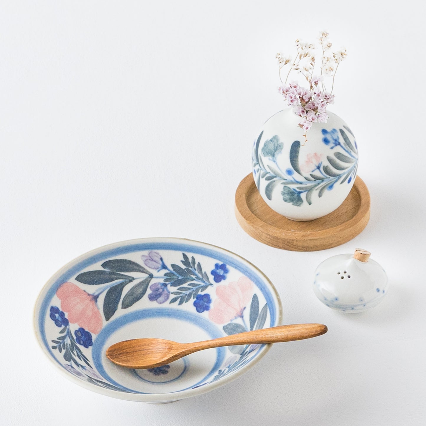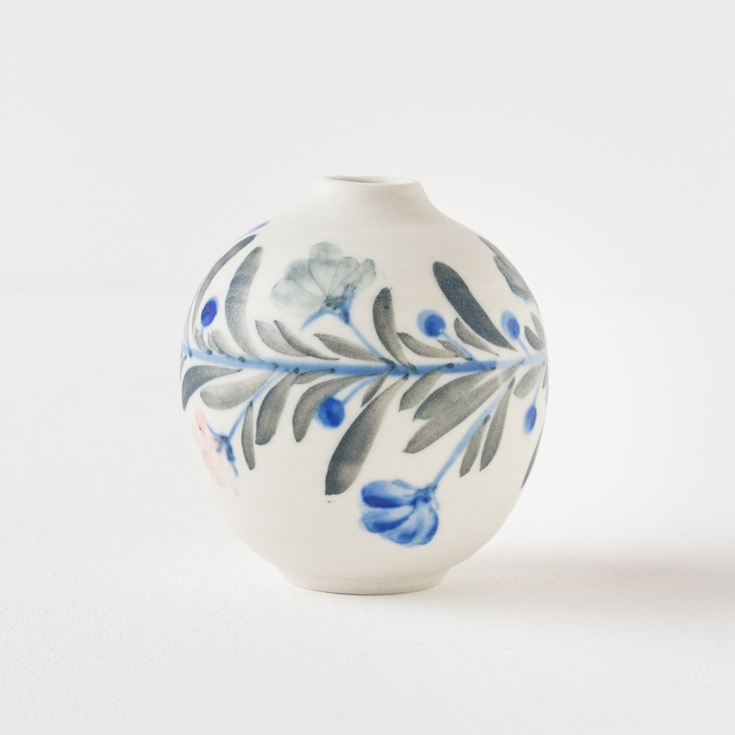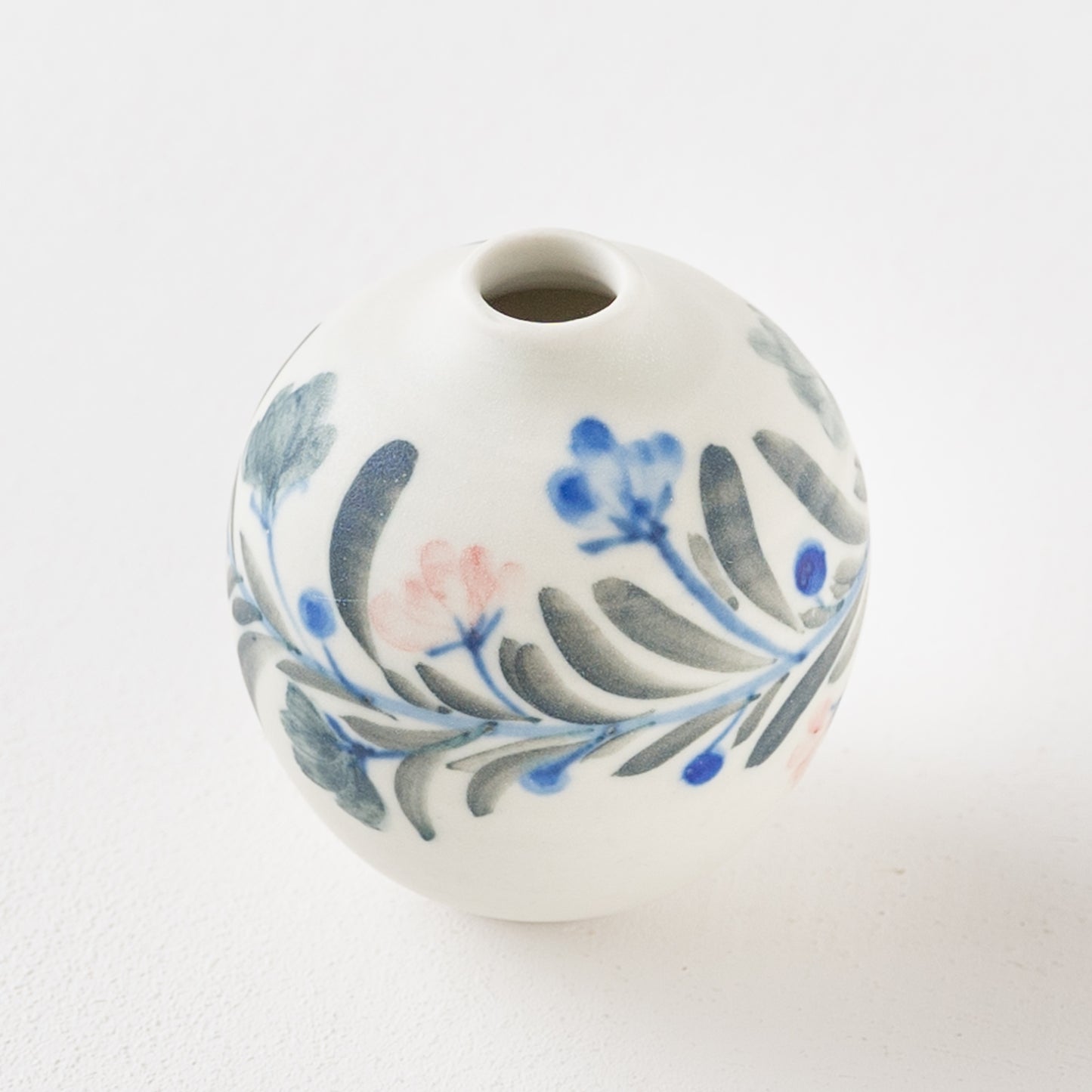 キャンバス地に描いたようなやさしく柔らかなタッチ。自由な筆致でのびやかに描かれた花模様の花器にお花を活ければお部屋の雰囲気をパッと明るくしてくれて、元気な気持ちにしてくれます。