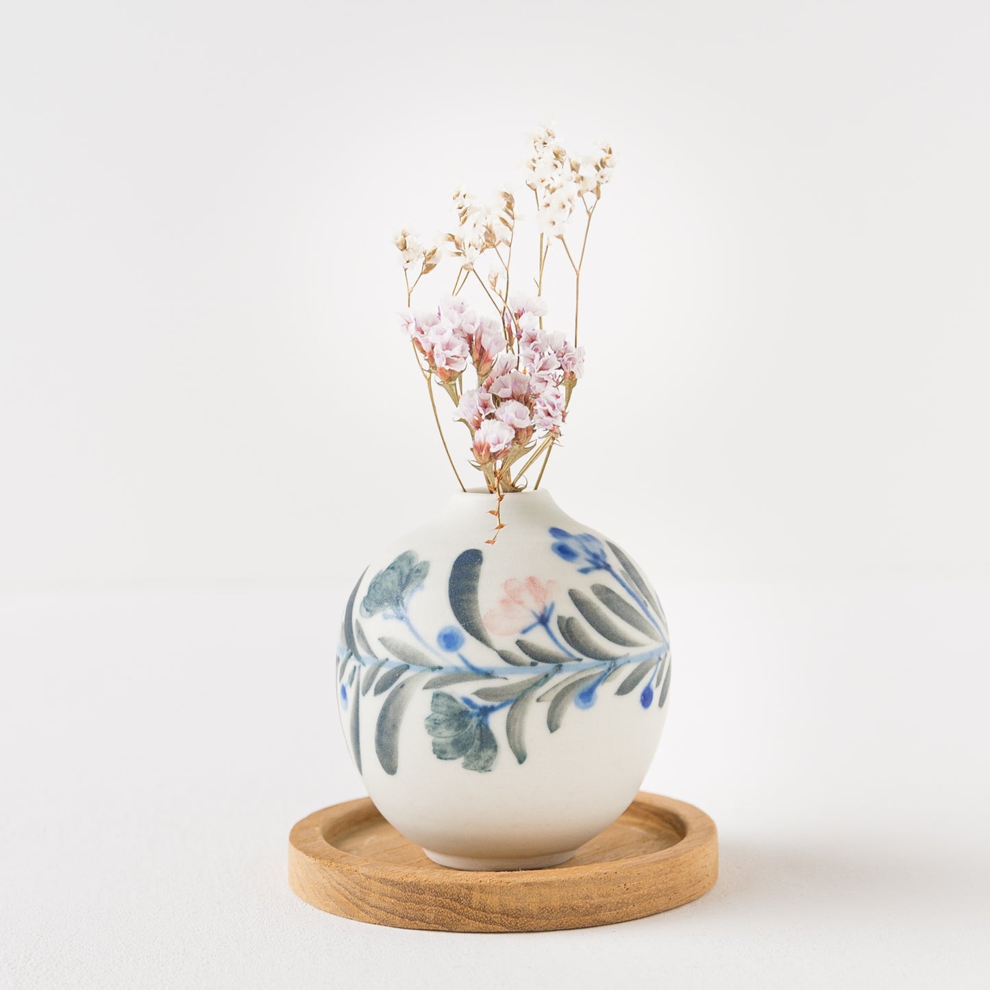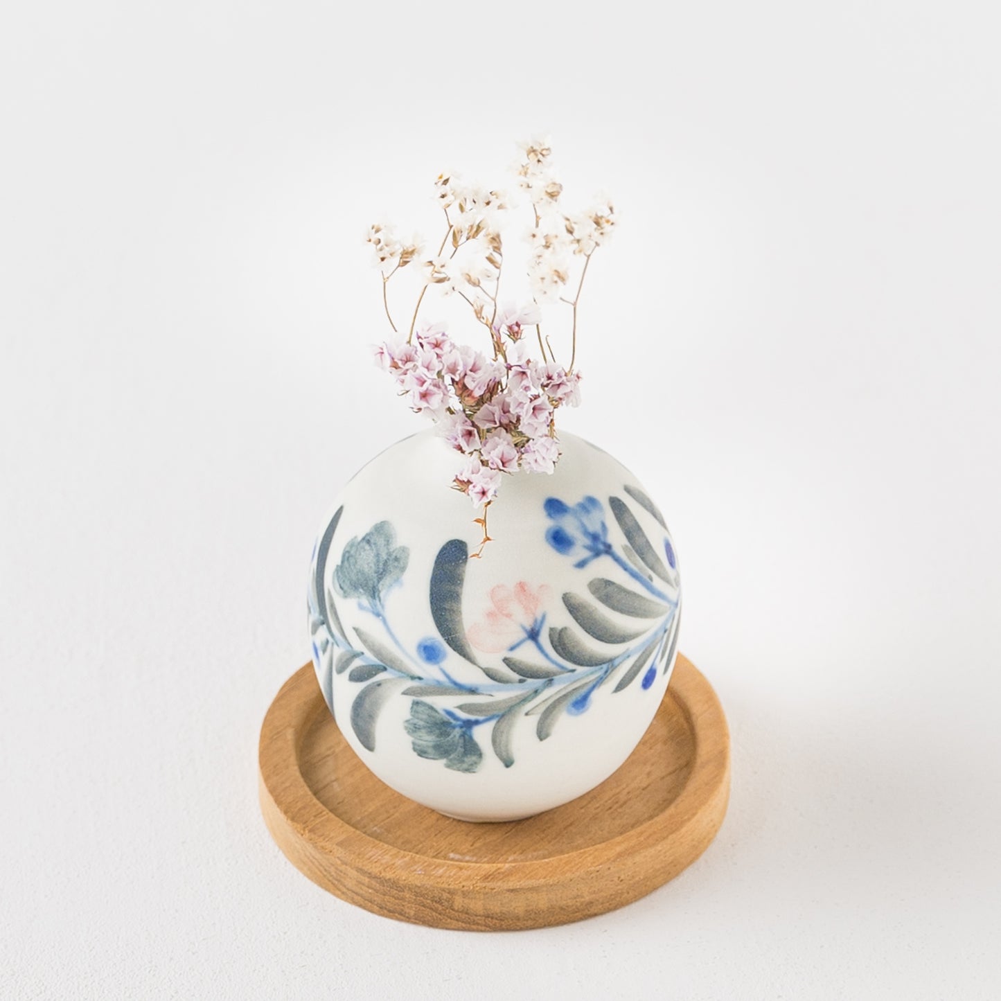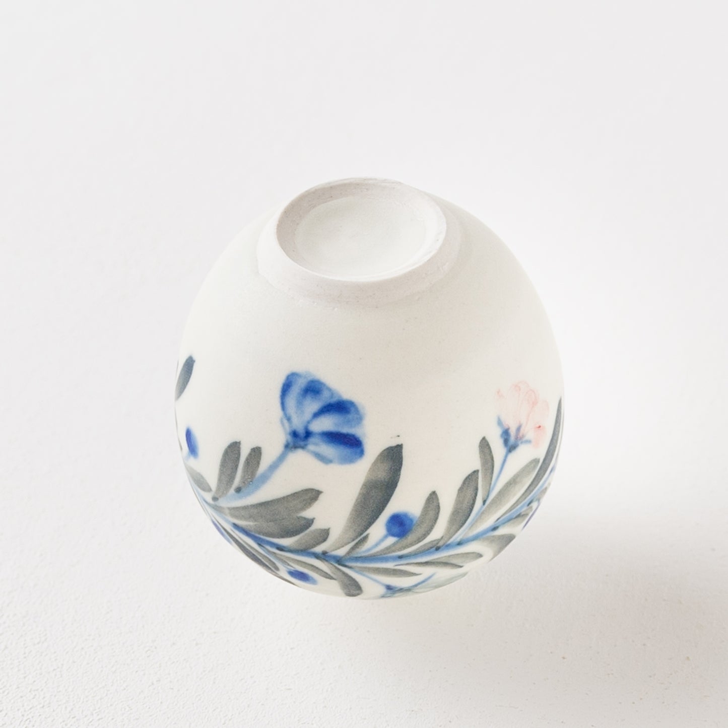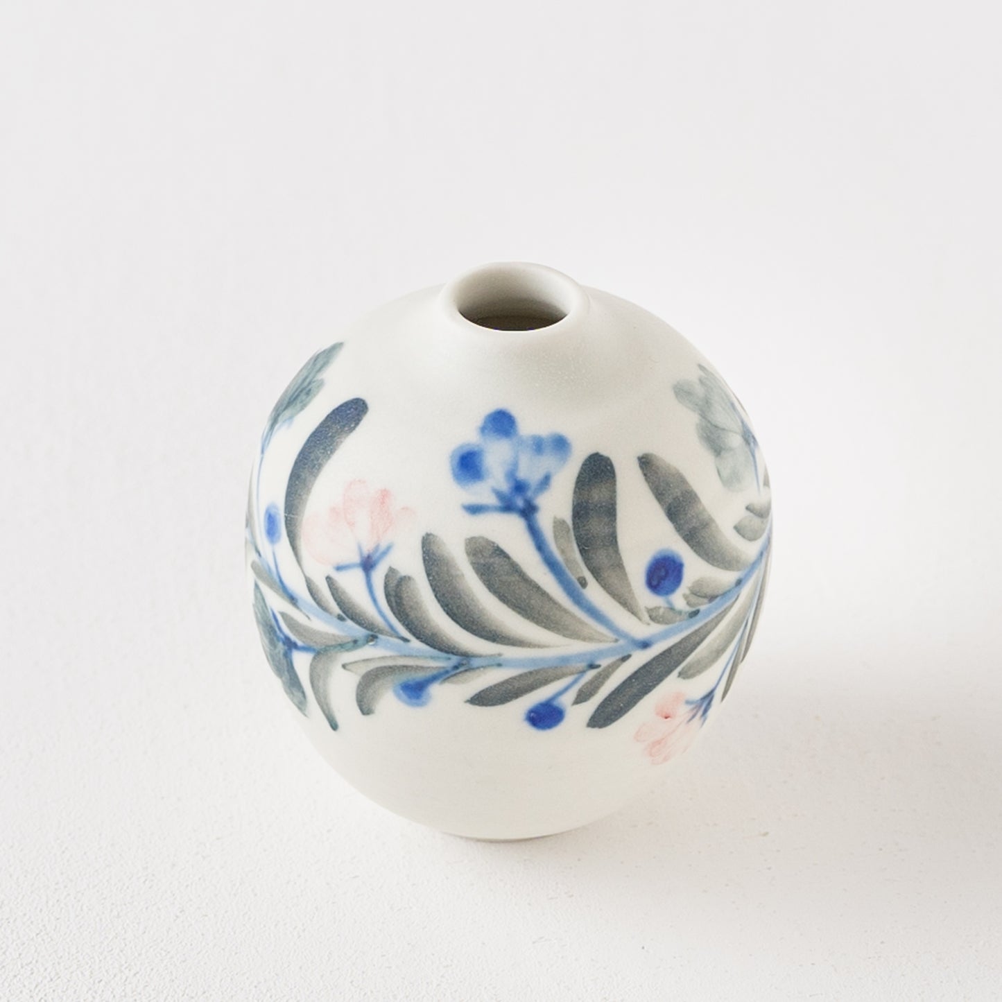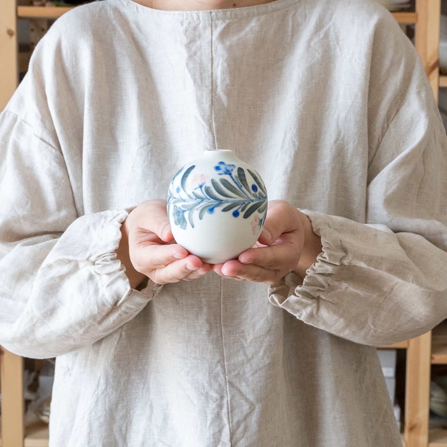 自由なスタイルでお花や葉っぱの数や形、また模様を少し変えて描くようにしているため、どの花器もふたつとして同じ模様はないオンリーワン。ひとつひとつの表情の違いに手仕事の魅力が感じられます。