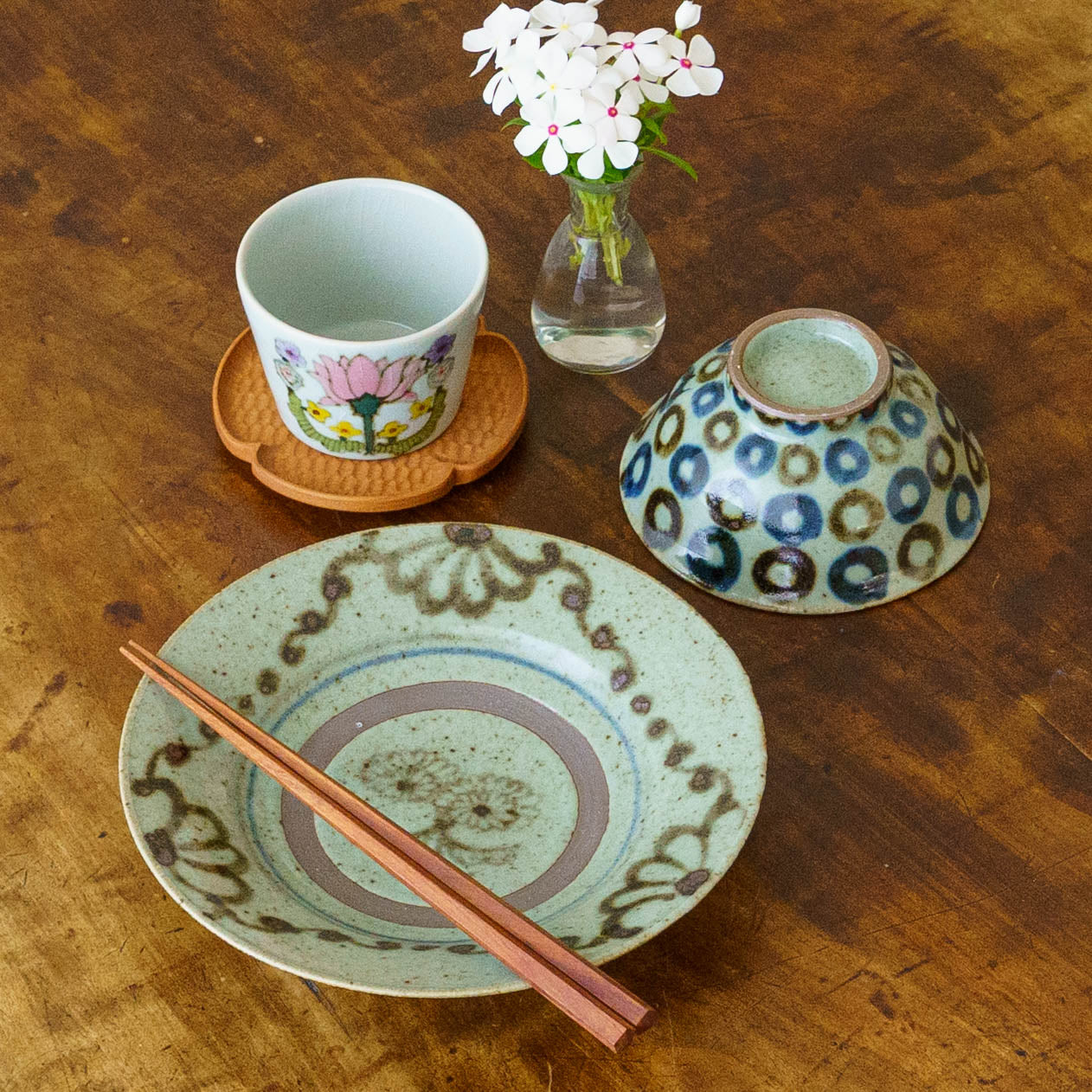 成型には主にろくろ、タタラ、型打ちの3種類の技法を用い、それぞれの特徴を活かしながら成型しています。手しごとならではのあたたかみと確かな技術が、ひとつひとつの器に息づいているようです。