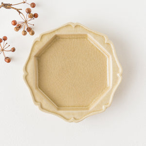 眺めているだけで優雅で贅沢な気分を味わえる縁のフリルカットとレース模様を浮き上がらせたデザイン。また、釉薬の濃淡や焼き色の微妙な違いなど手仕事ならではの温もりも感じます。