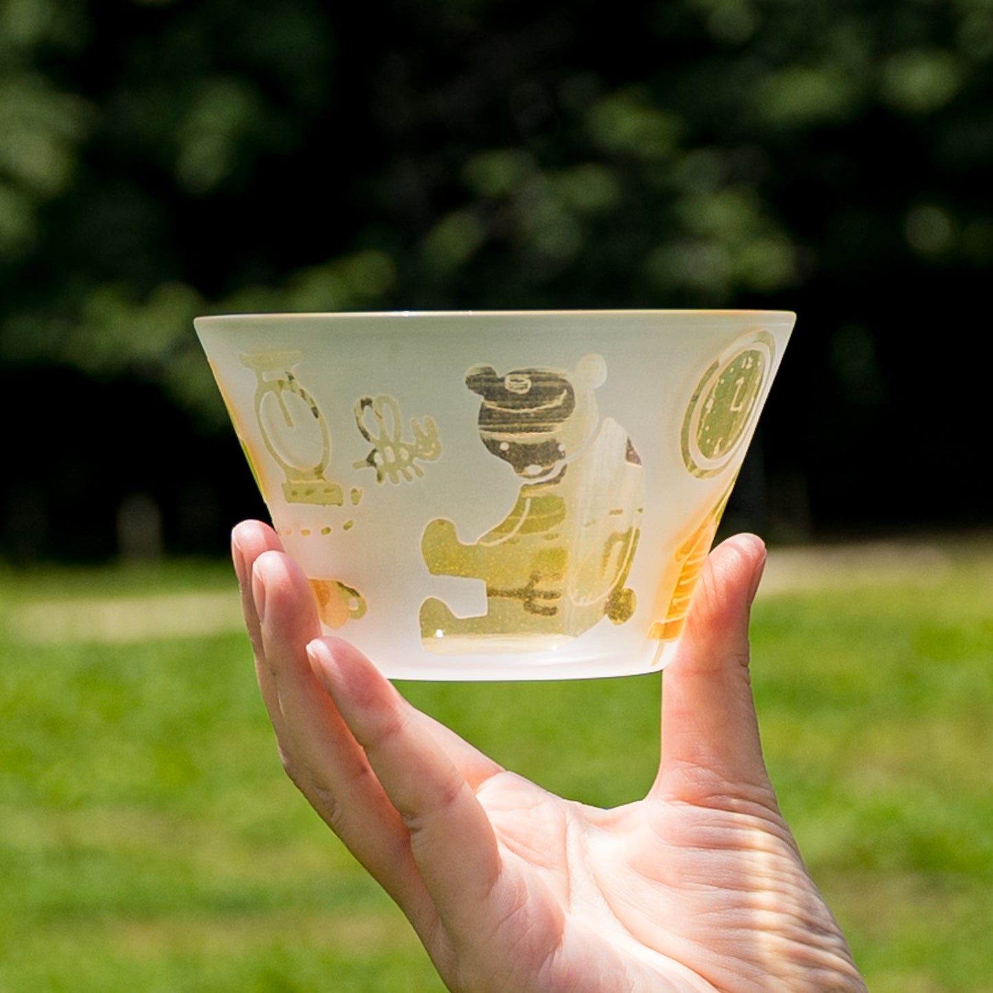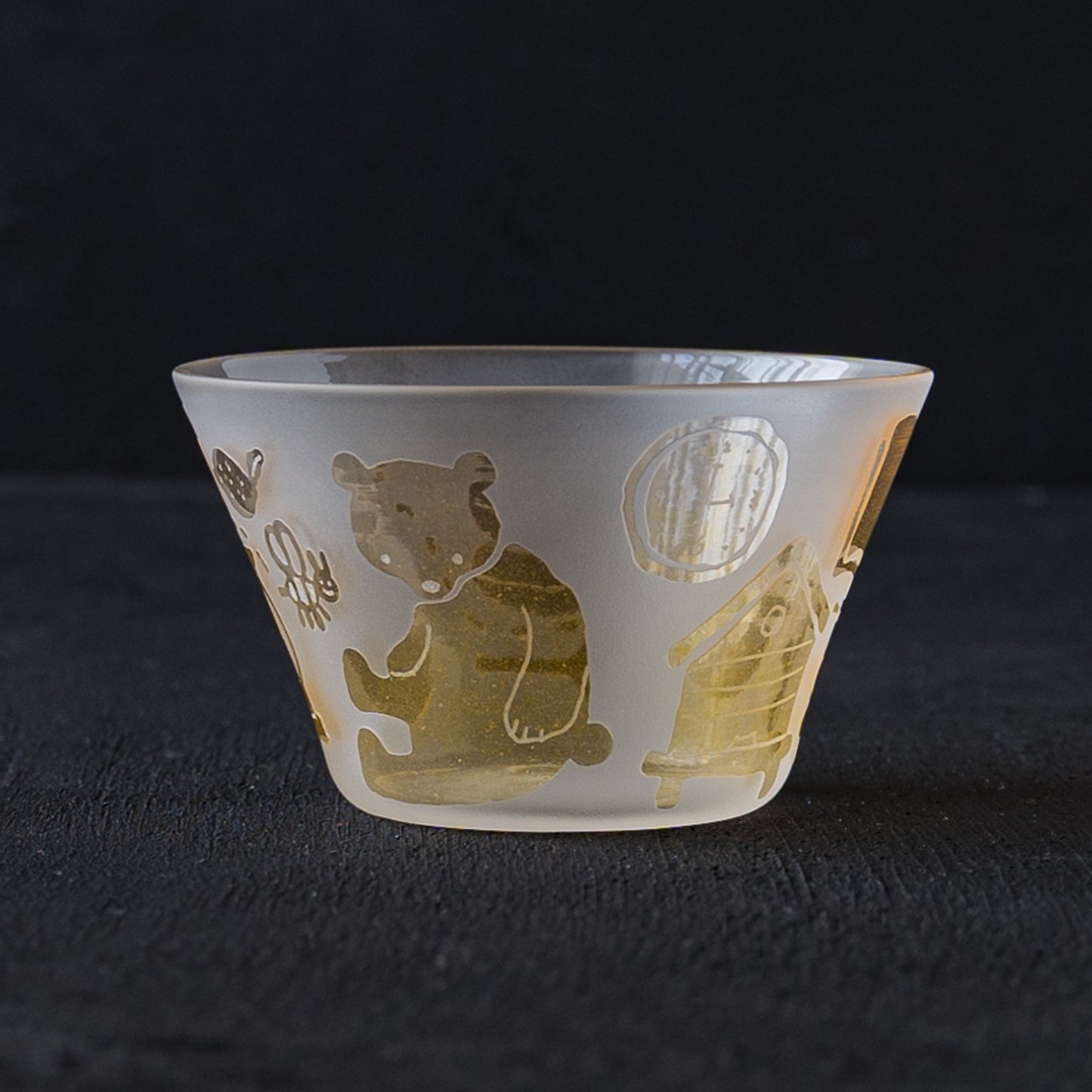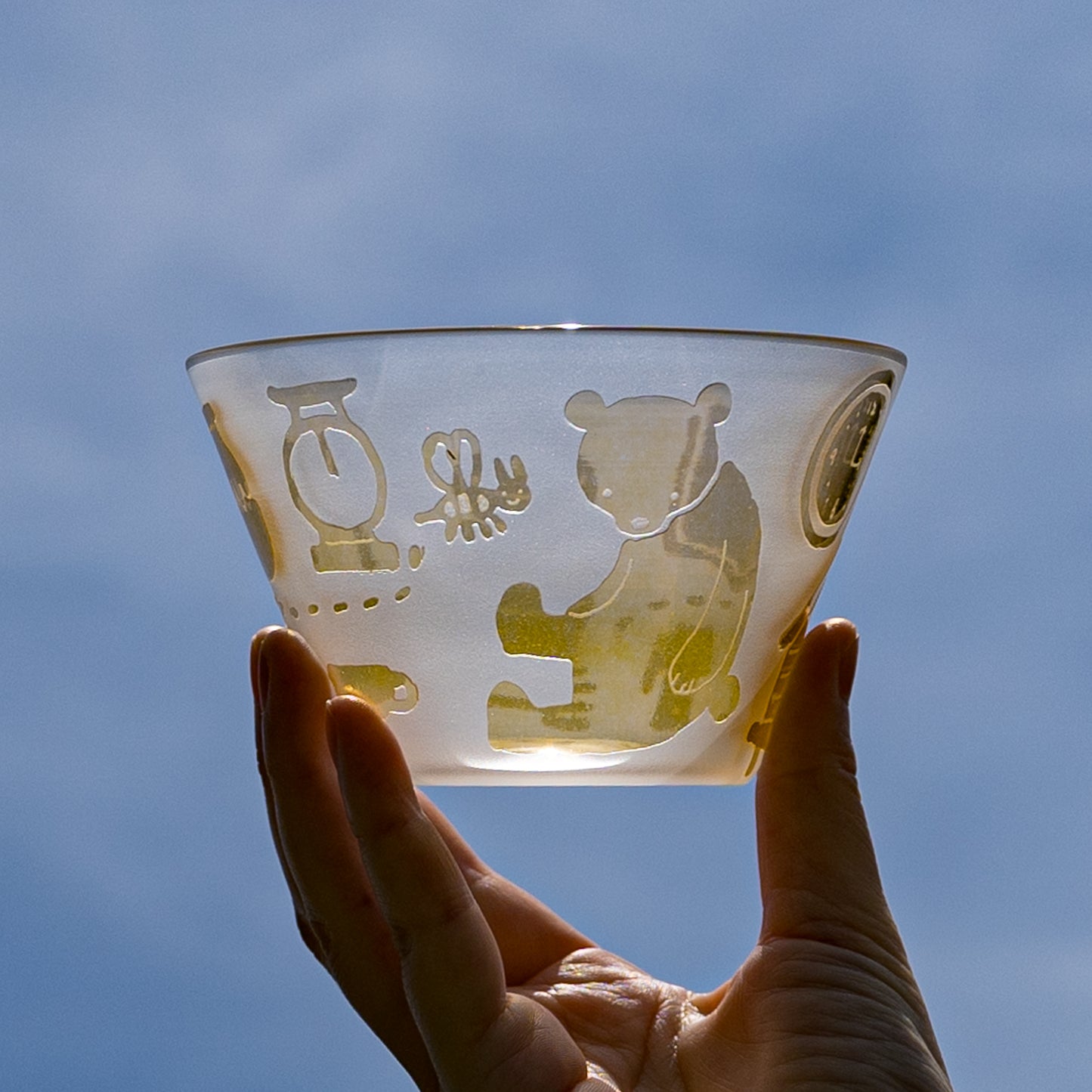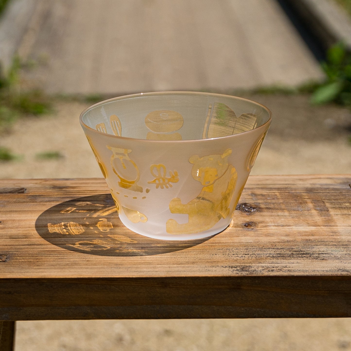 はちみつ色のガラスパウダーをガラス全体に吹き付けた後、木工用ボンドで絵柄を描いていきます。その後、サンドブラスト加工し、絵柄部分を剥がすと、はちみつ色のクマさんや道具などが表れます。細かな点や線などはリューターで削ってあたたかみを感じる風合いに仕上げてます。