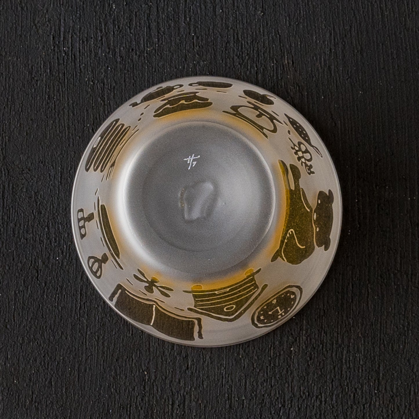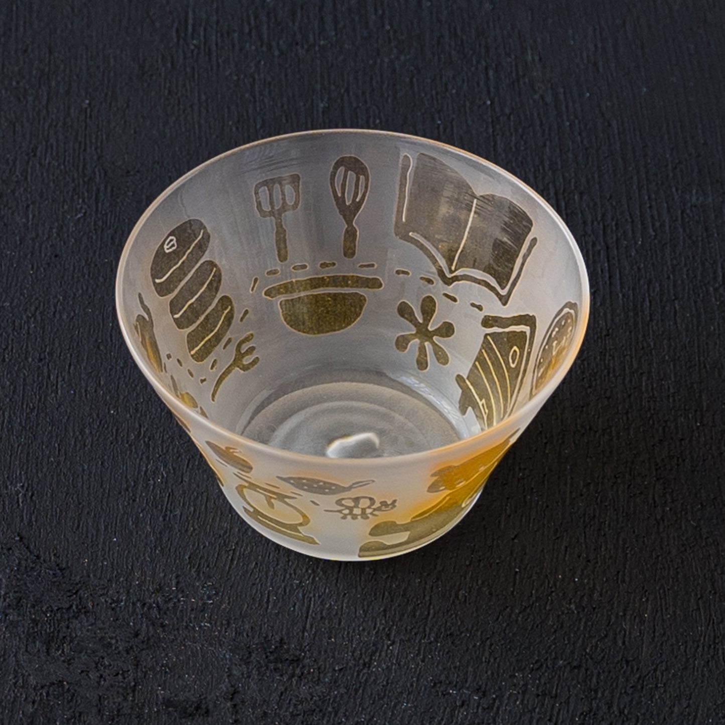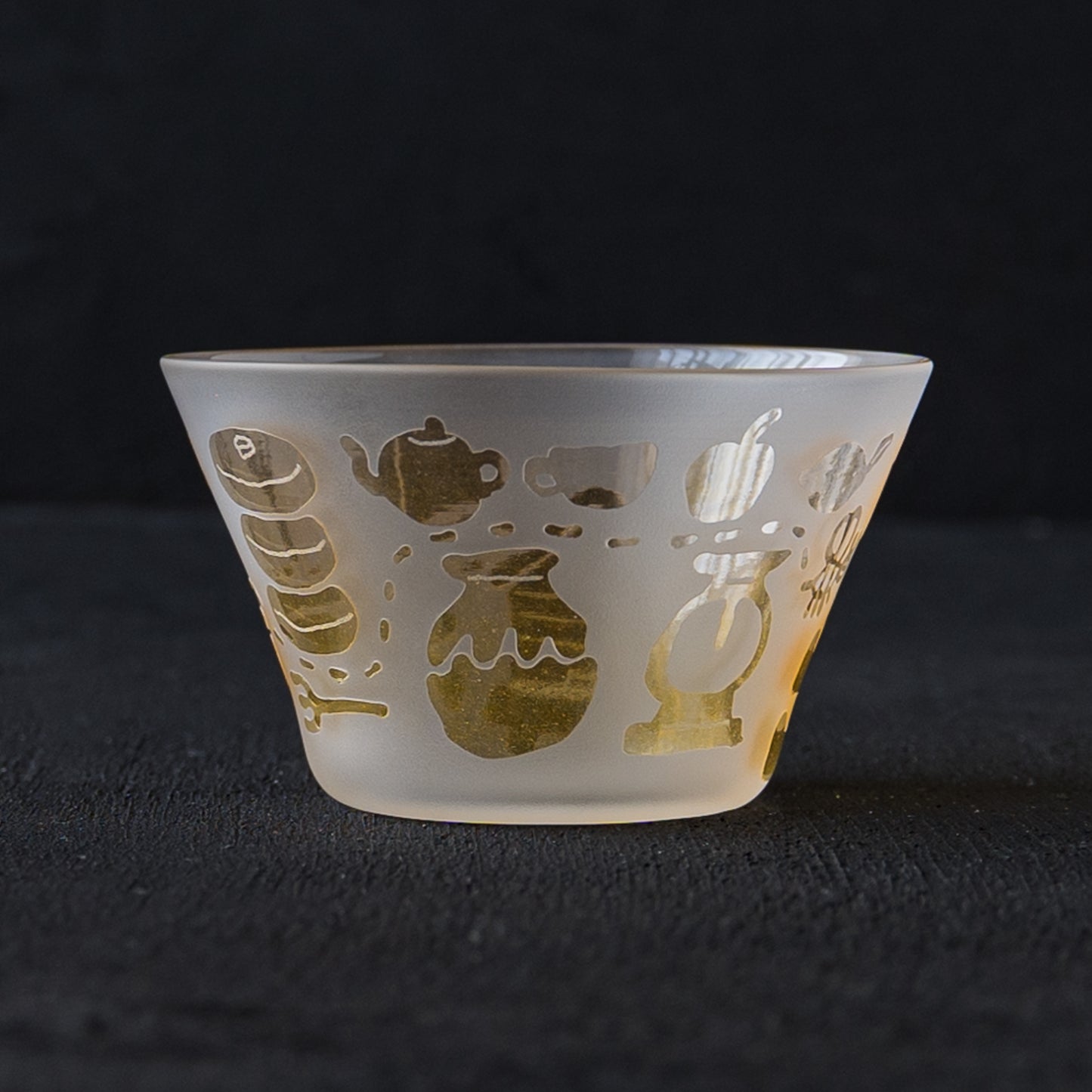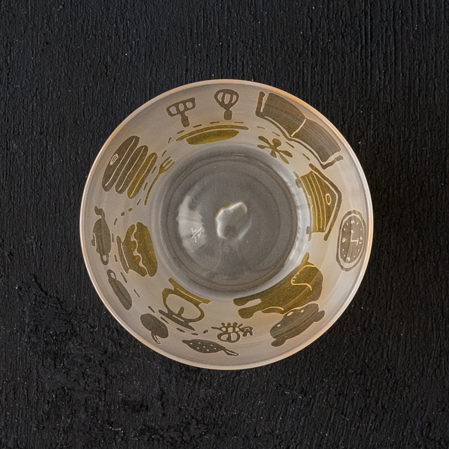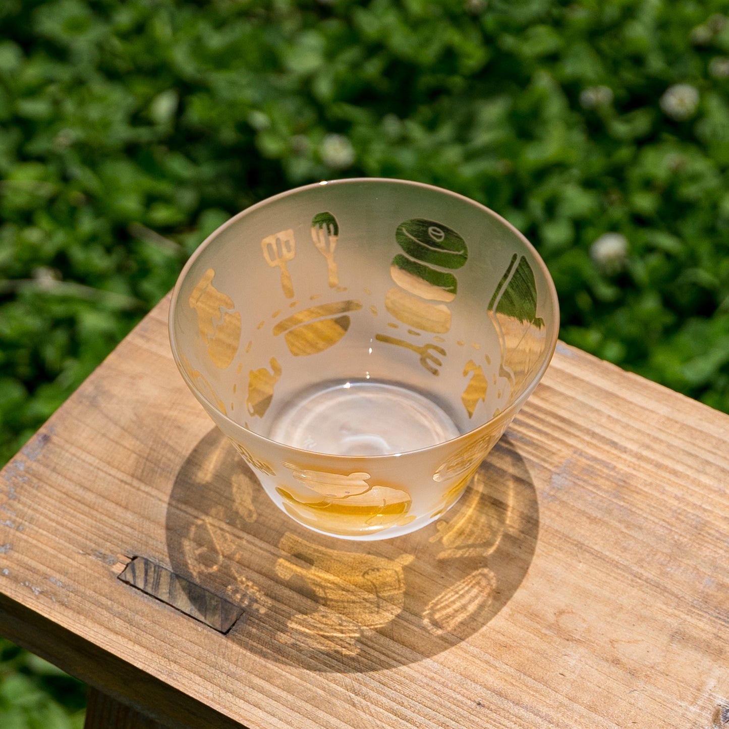 はちみつ色のガラスパウダーをガラス全体に吹き付けた後、木工用ボンドで絵柄を描いていきます。その後、サンドブラスト加工し、絵柄部分を剥がすと、はちみつ色のクマさんや道具などが表れます。細かな点や線などはリューターで削ってあたたかみを感じる風合いに仕上げてます。