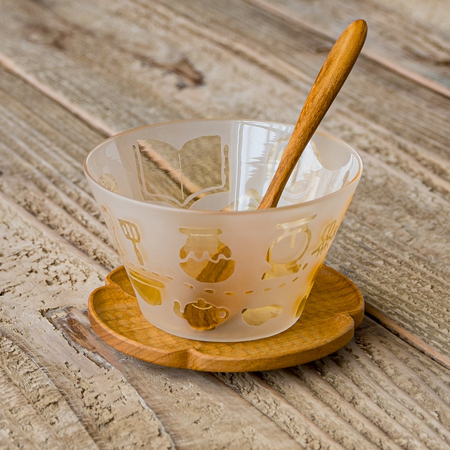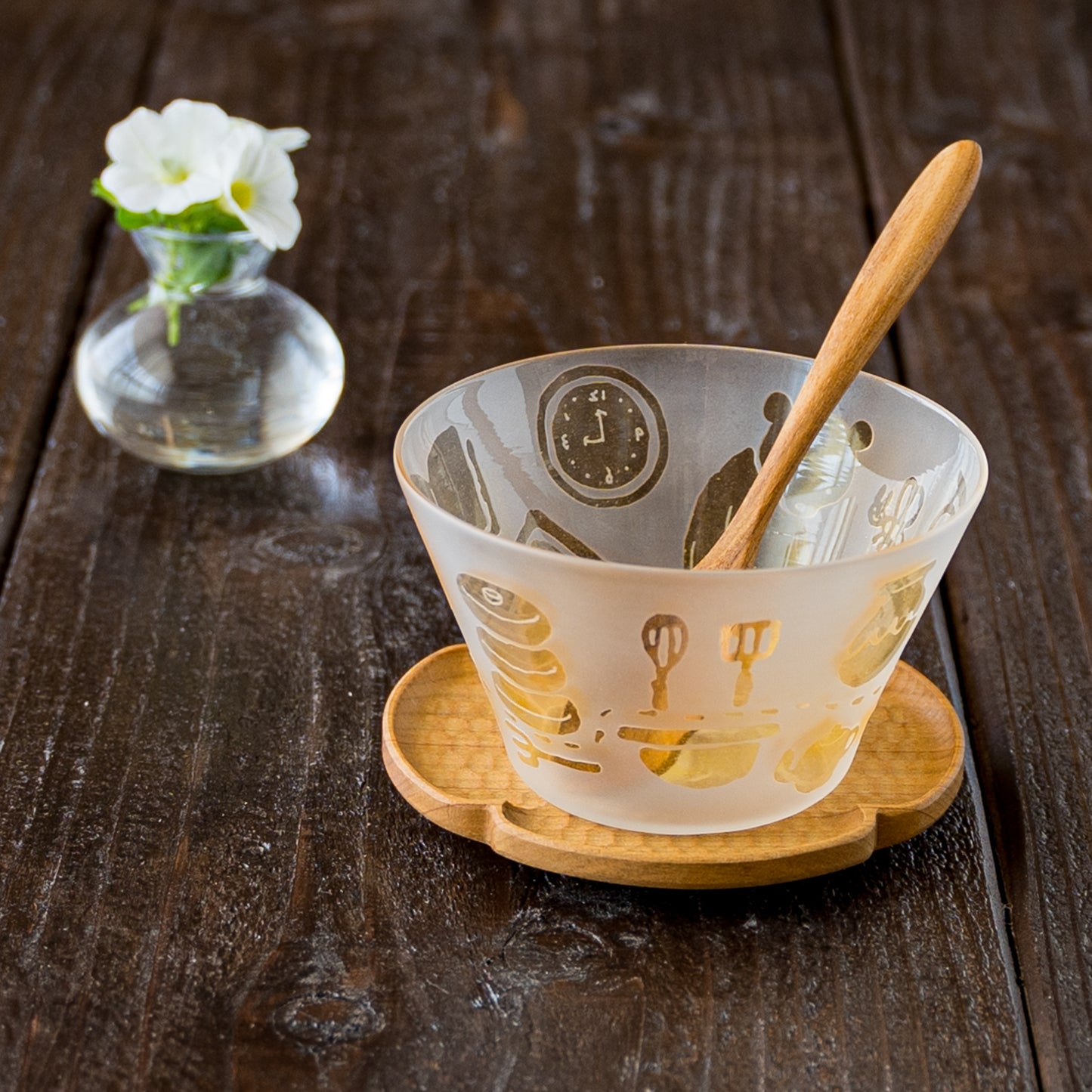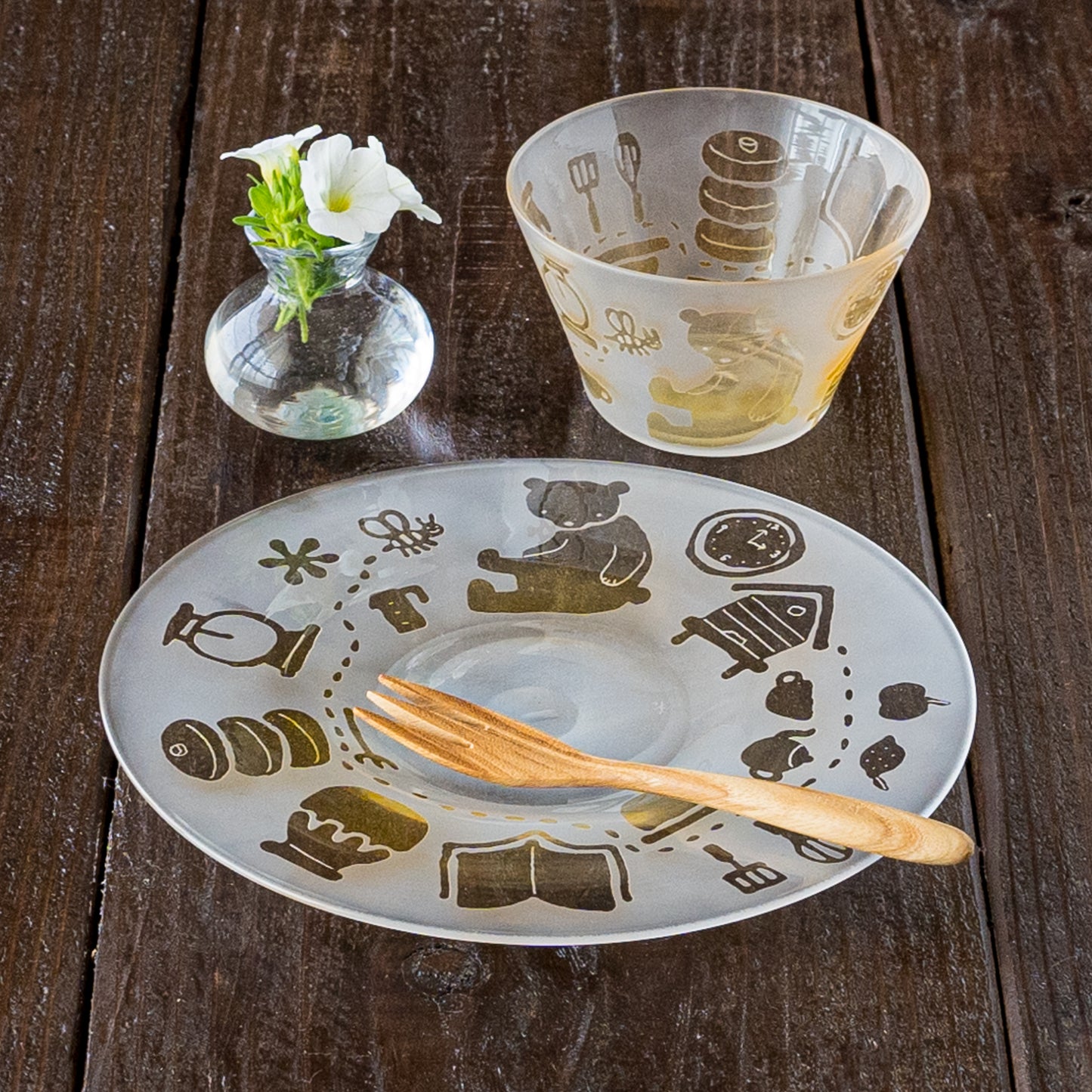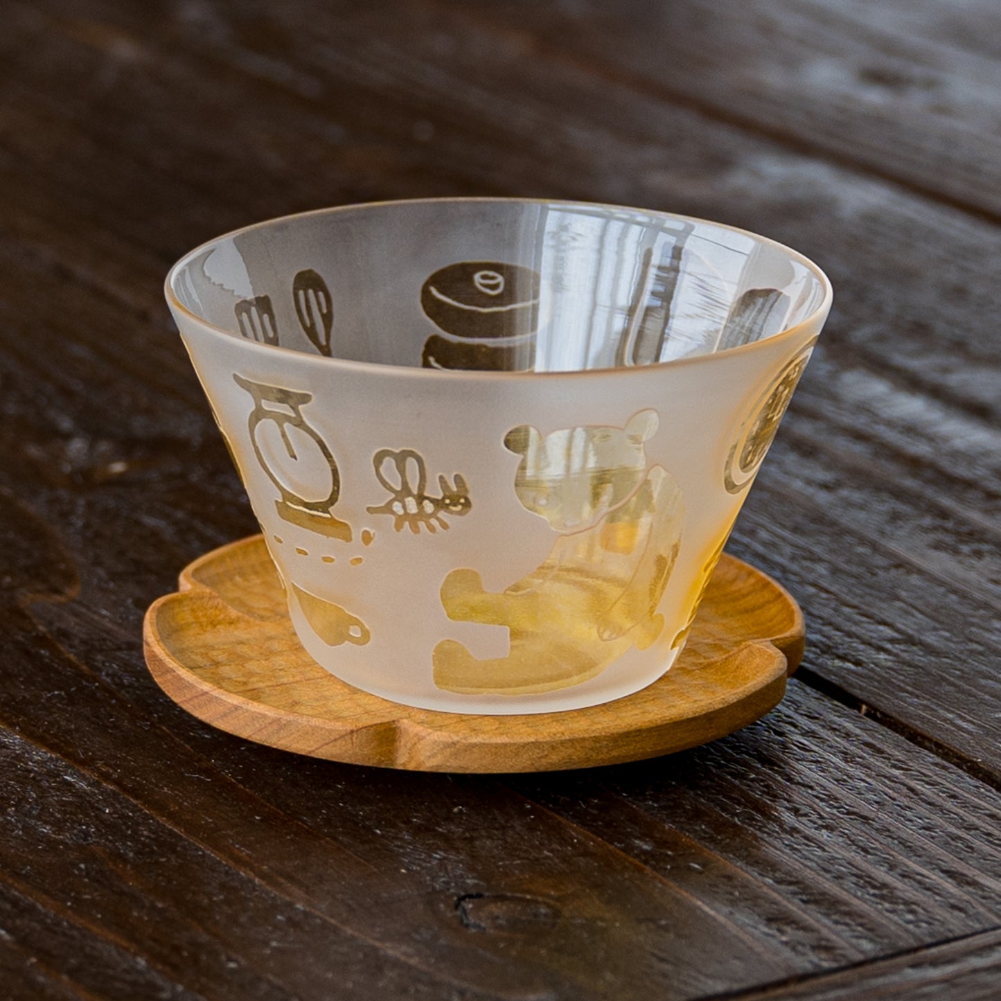 森に住むクマさんが3時のおやつにホットケーキづくりをするアイテムがカップ全体にずら~っと描かれたなんとも愛らしいデザートカップです。