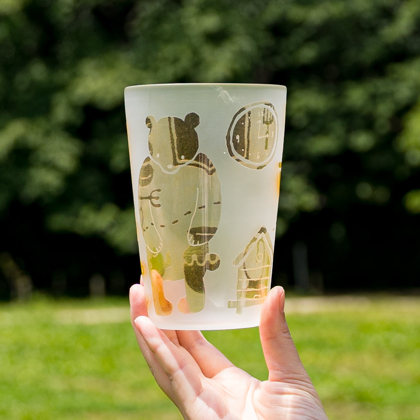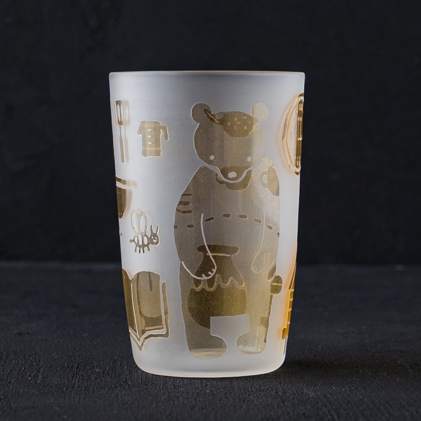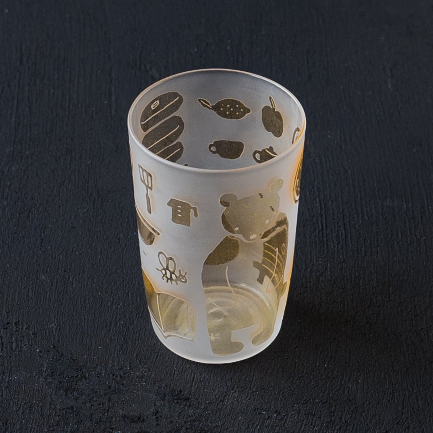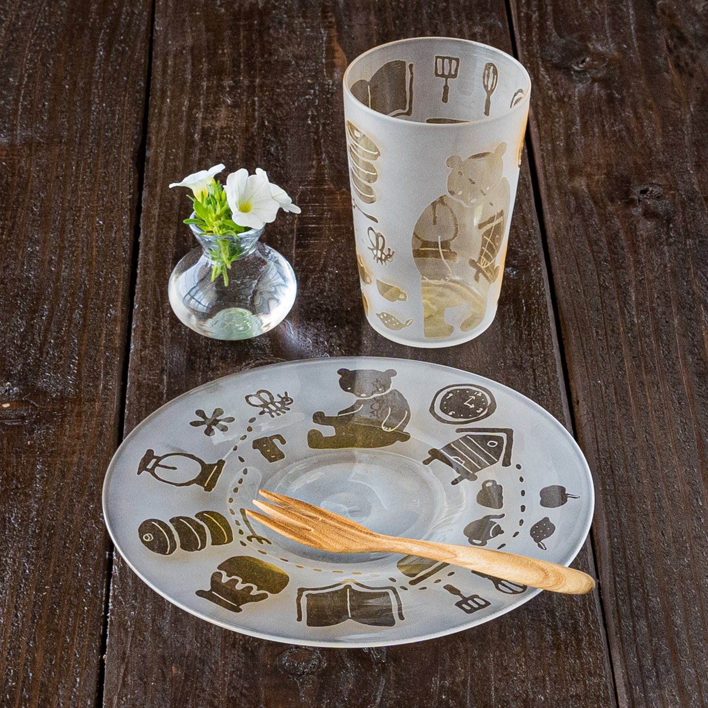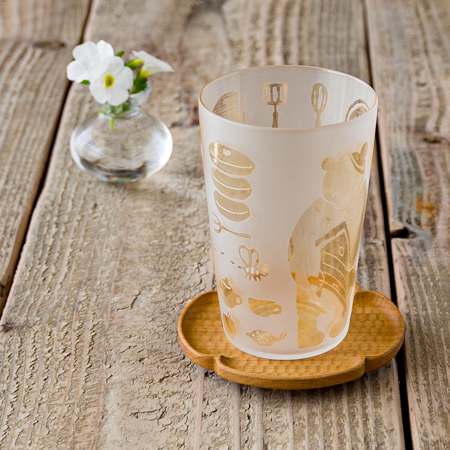 森に住むクマさんが3時のおやつにホットケーキづくりをするアイテムがグラス全体にずら~っと描かれたなんとも愛らしいグラスです。