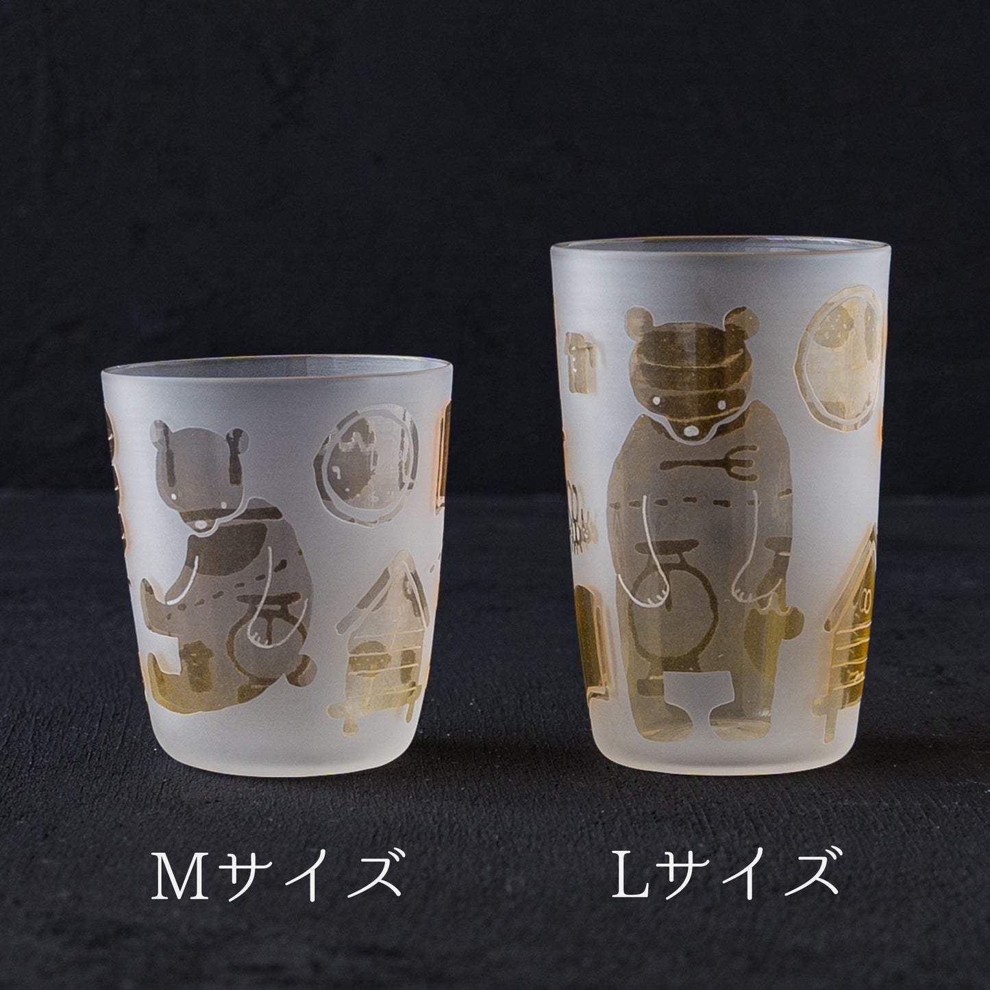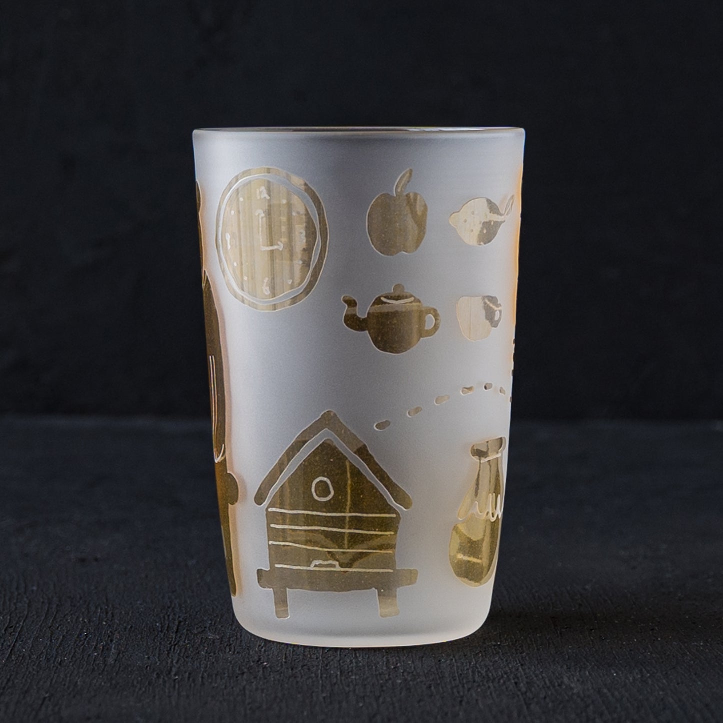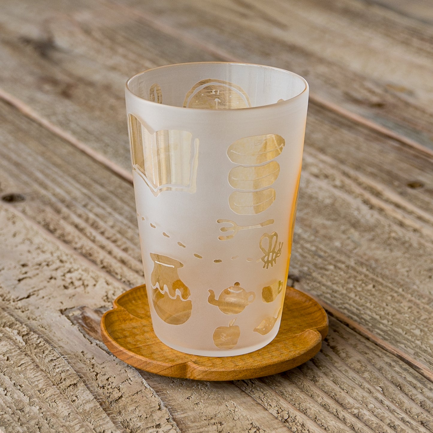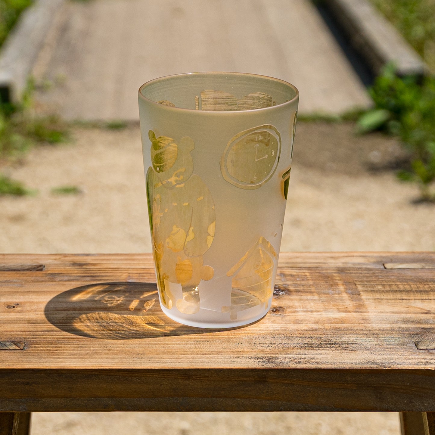 森に住むクマさんが3時のおやつにホットケーキづくりをするアイテムがグラス全体にずら~っと描かれたなんとも愛らしいグラスです。