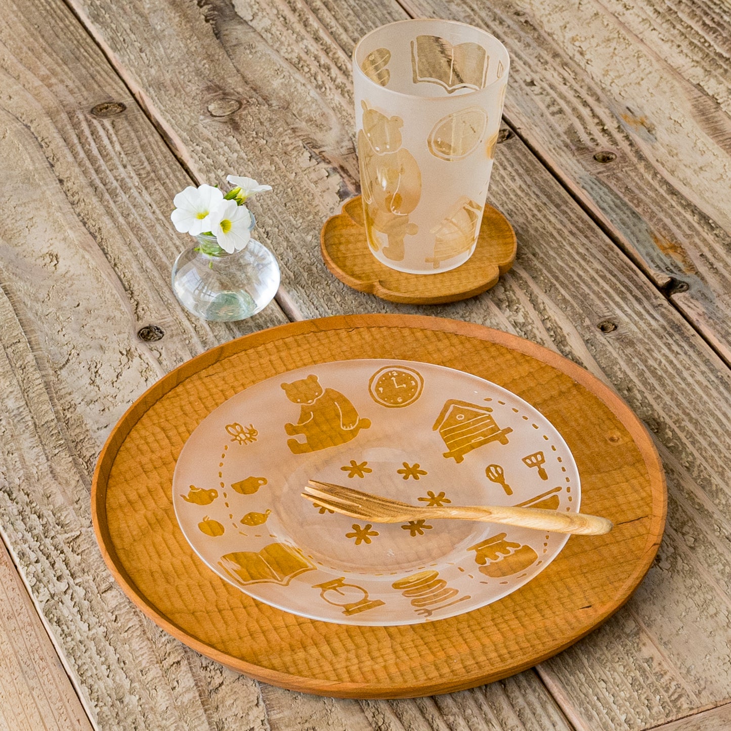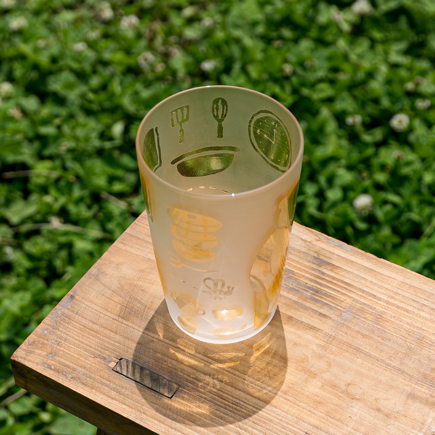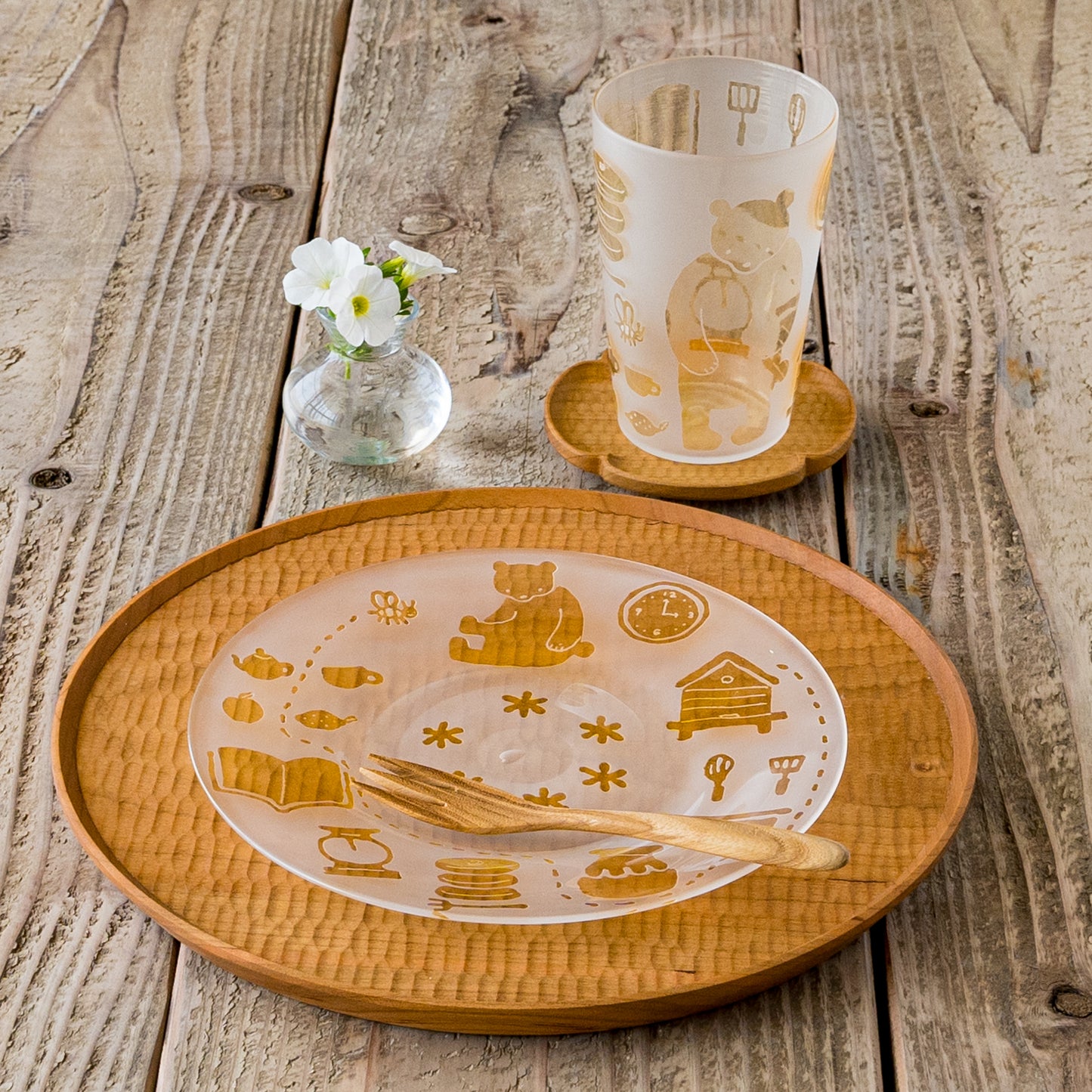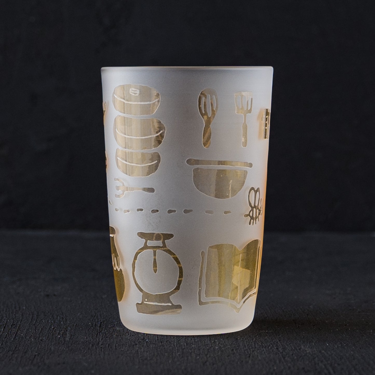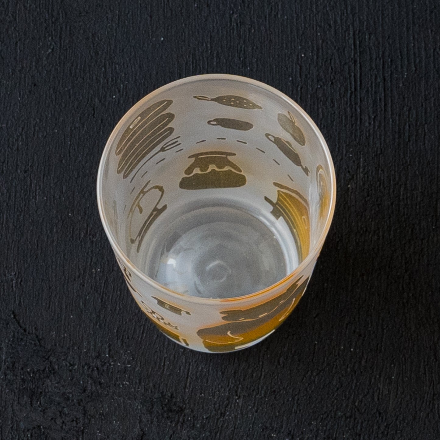 森に住むクマさんが3時のおやつにホットケーキづくりをするアイテムがグラス全体にずら~っと描かれたなんとも愛らしいグラスです。