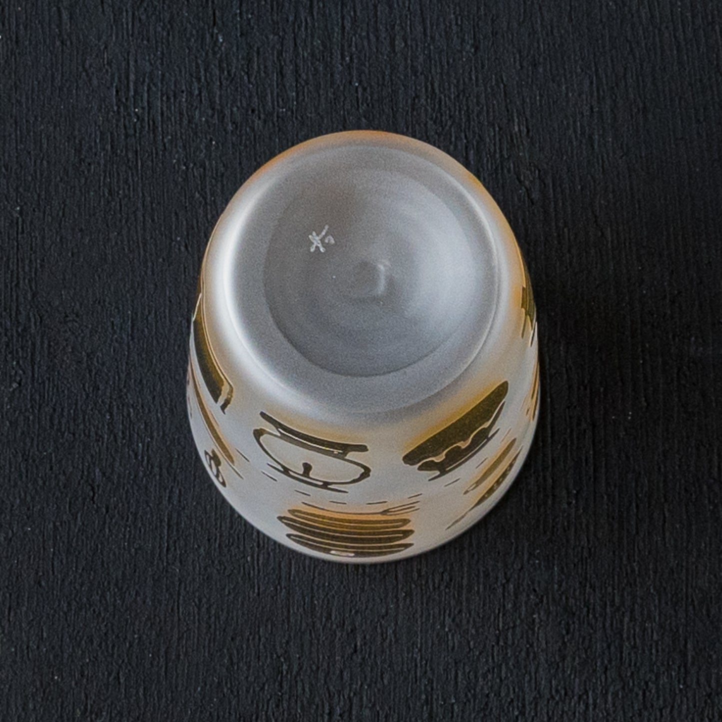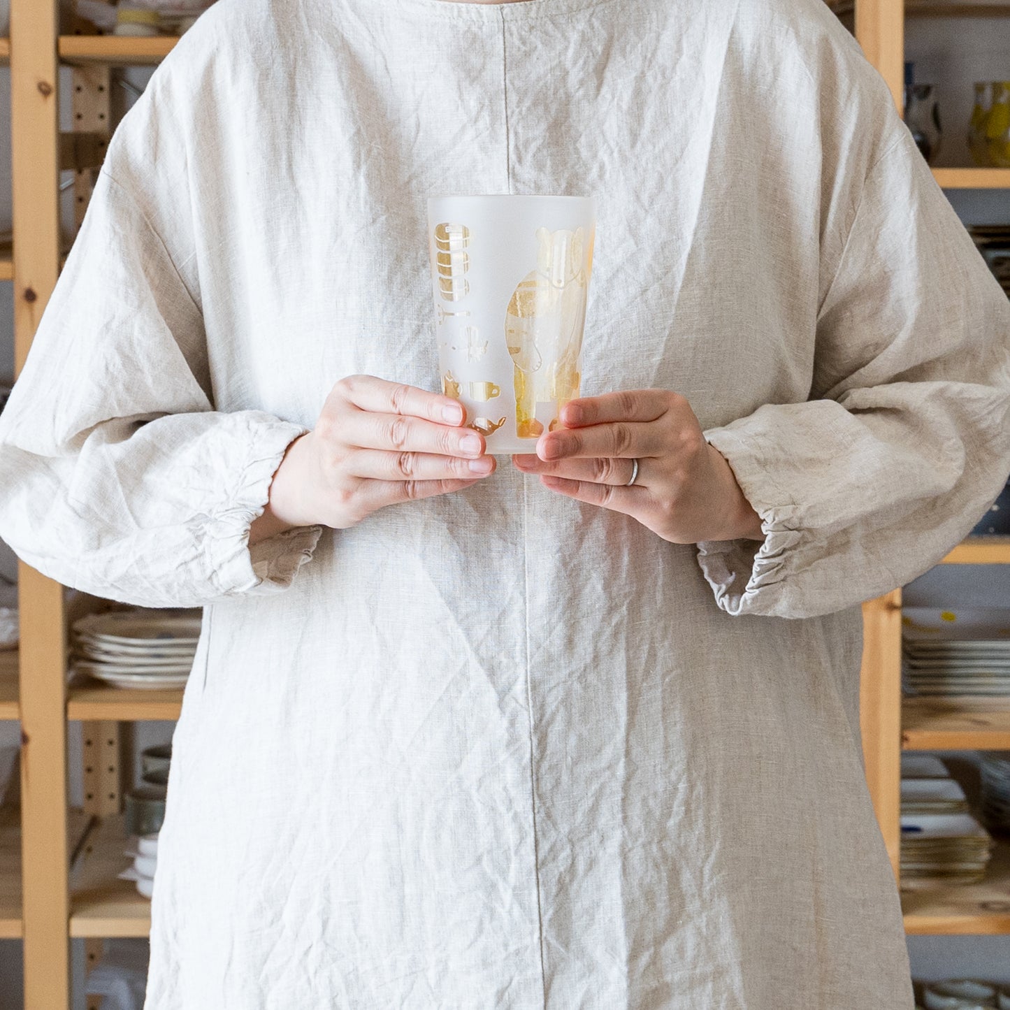 はちみつ色のガラスパウダーをガラス全体に吹き付けた後、木工用ボンドで絵柄を描いていきます。その後、サンドブラスト加工し、絵柄部分を剥がすと、はちみつ色のクマさんや道具などが表れます。細かな点や線などはリューターで削ってあたたかみを感じる風合いに仕上げてます。
