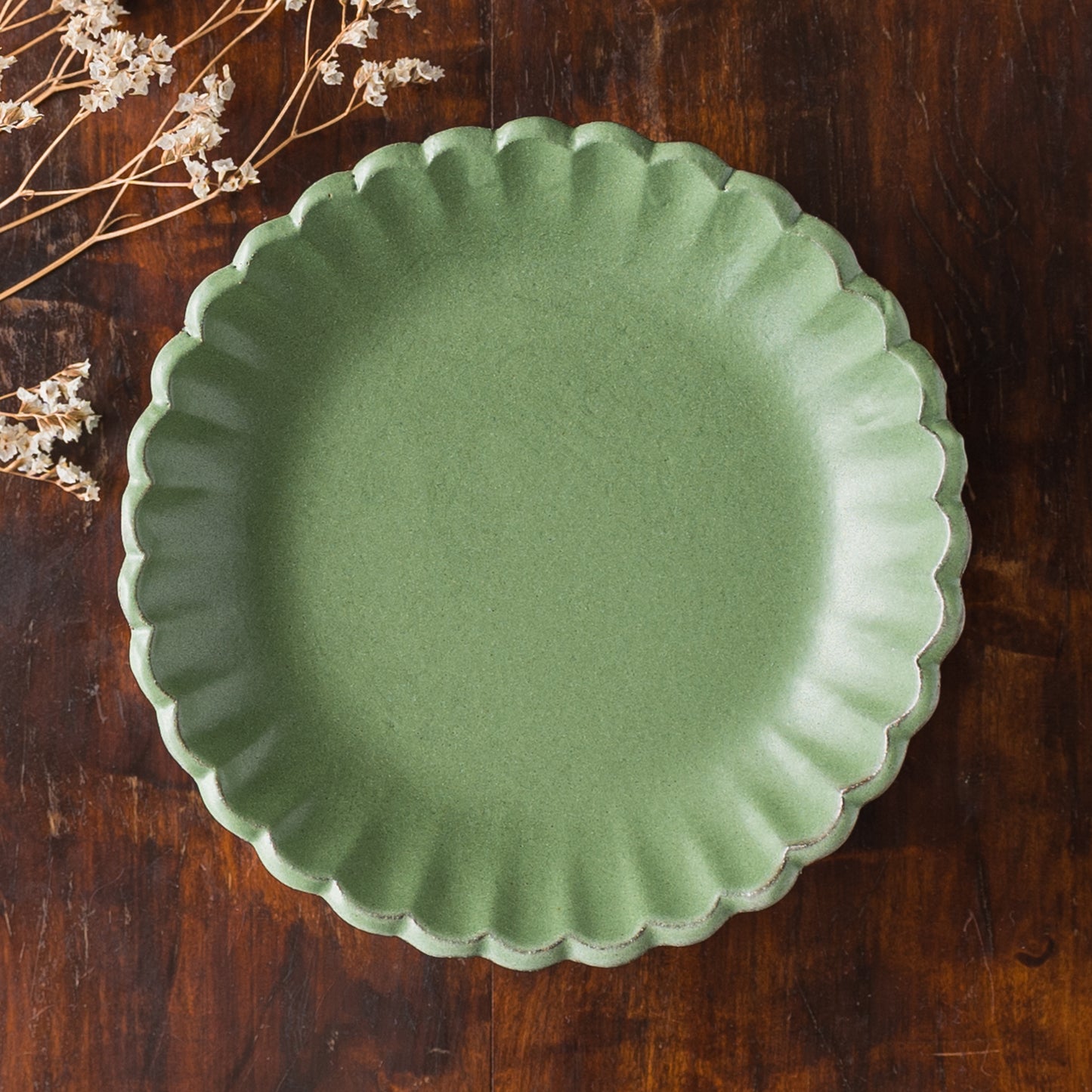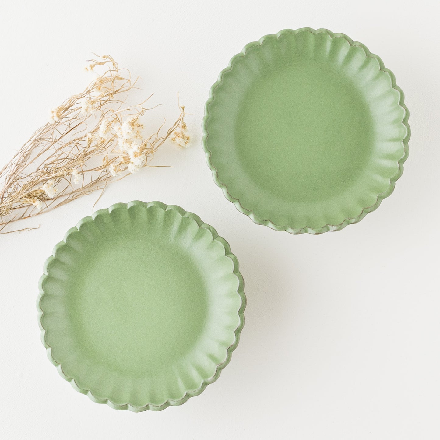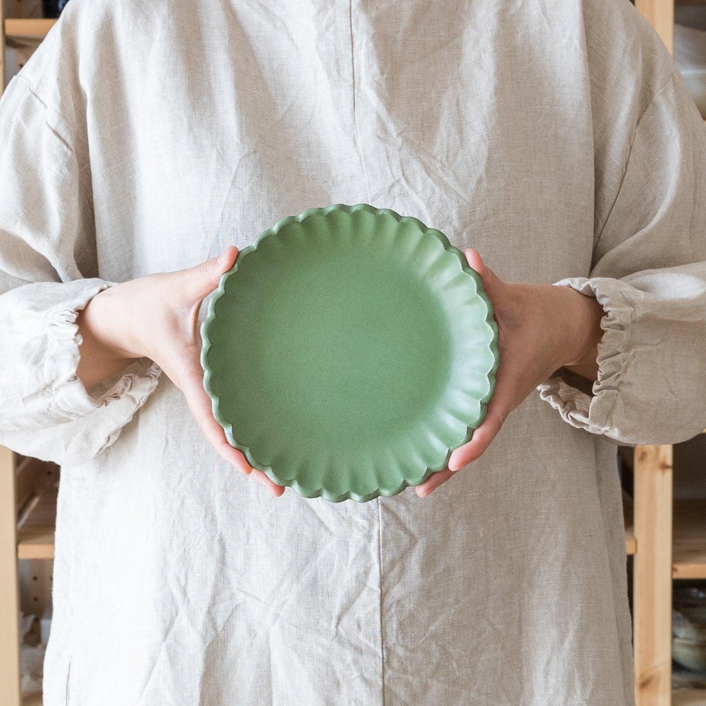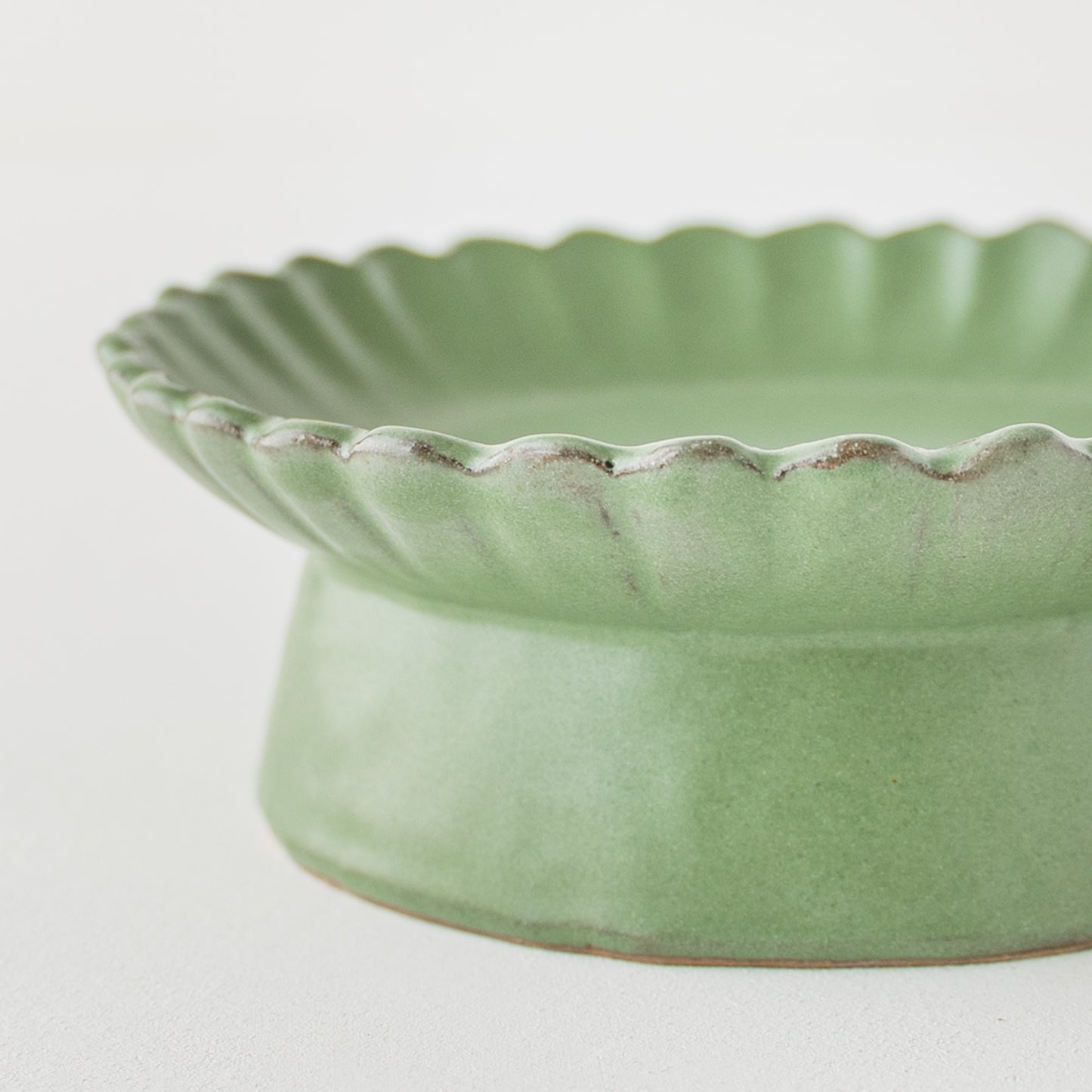 平安時代からある日本の伝統的な色の若草色。緑系のうつわがあると食卓に変化が生まれて明るくなります。花紋の部分に表れた釉薬の濃淡が表情豊かであたたみを感じます。