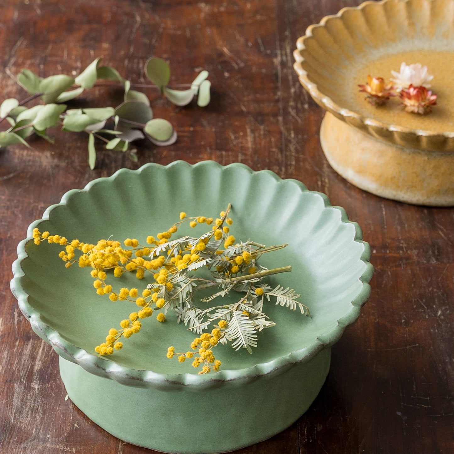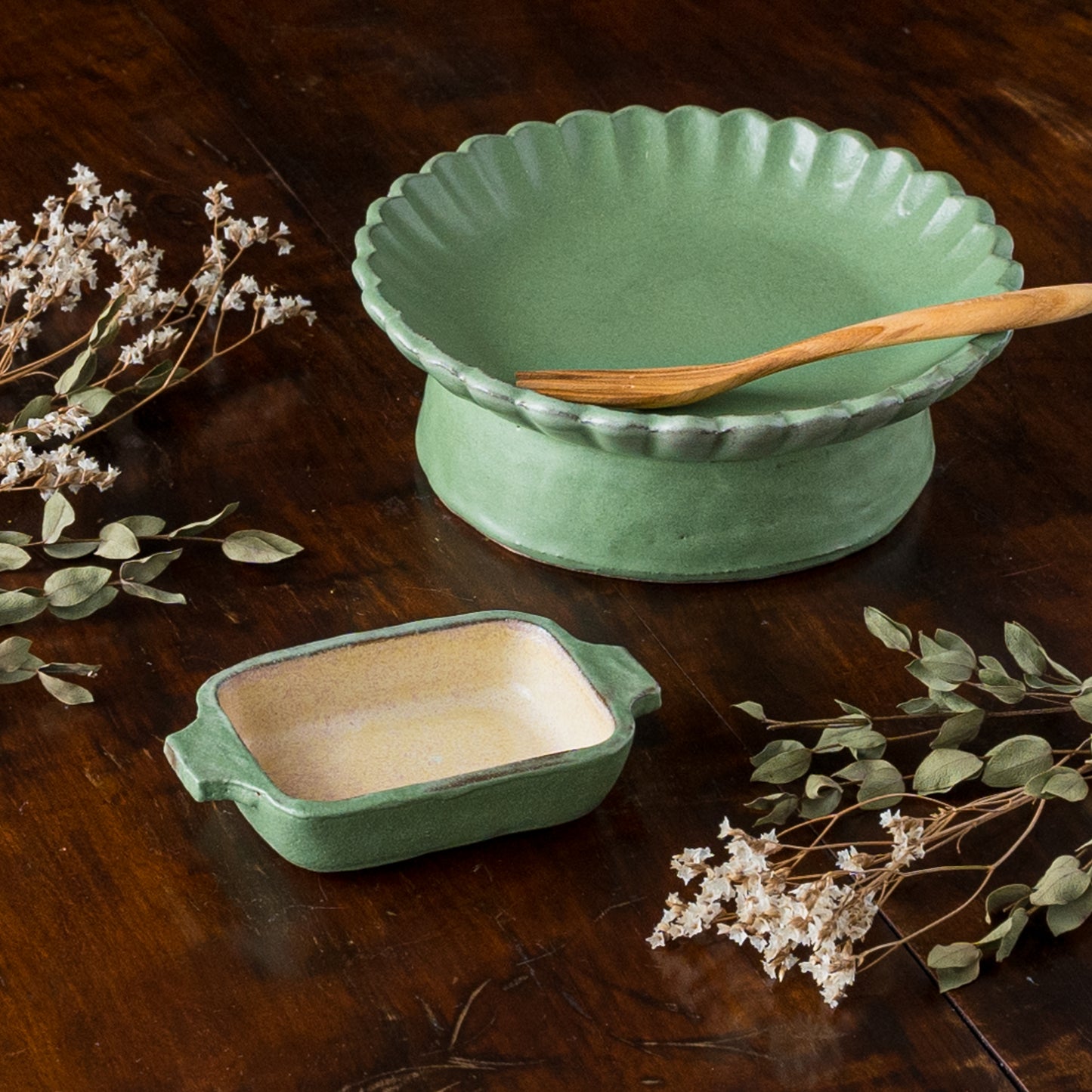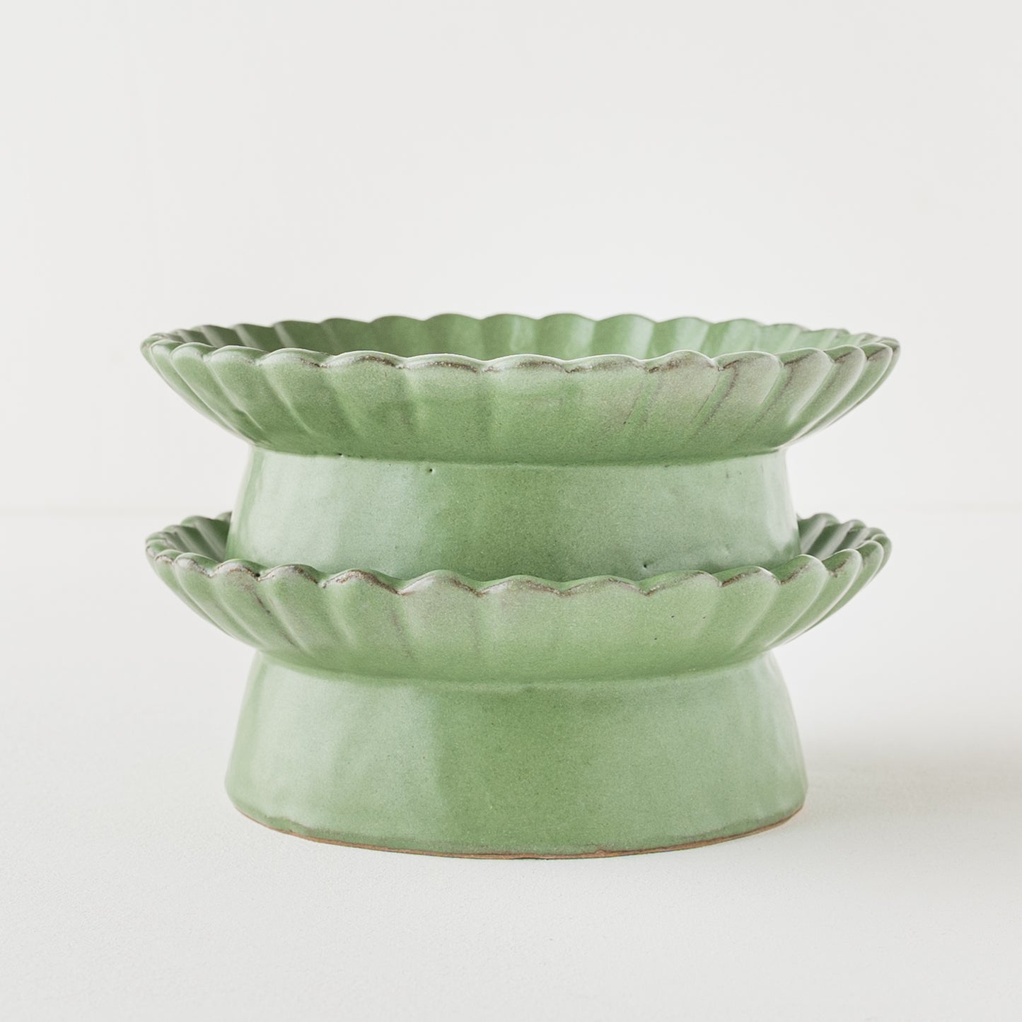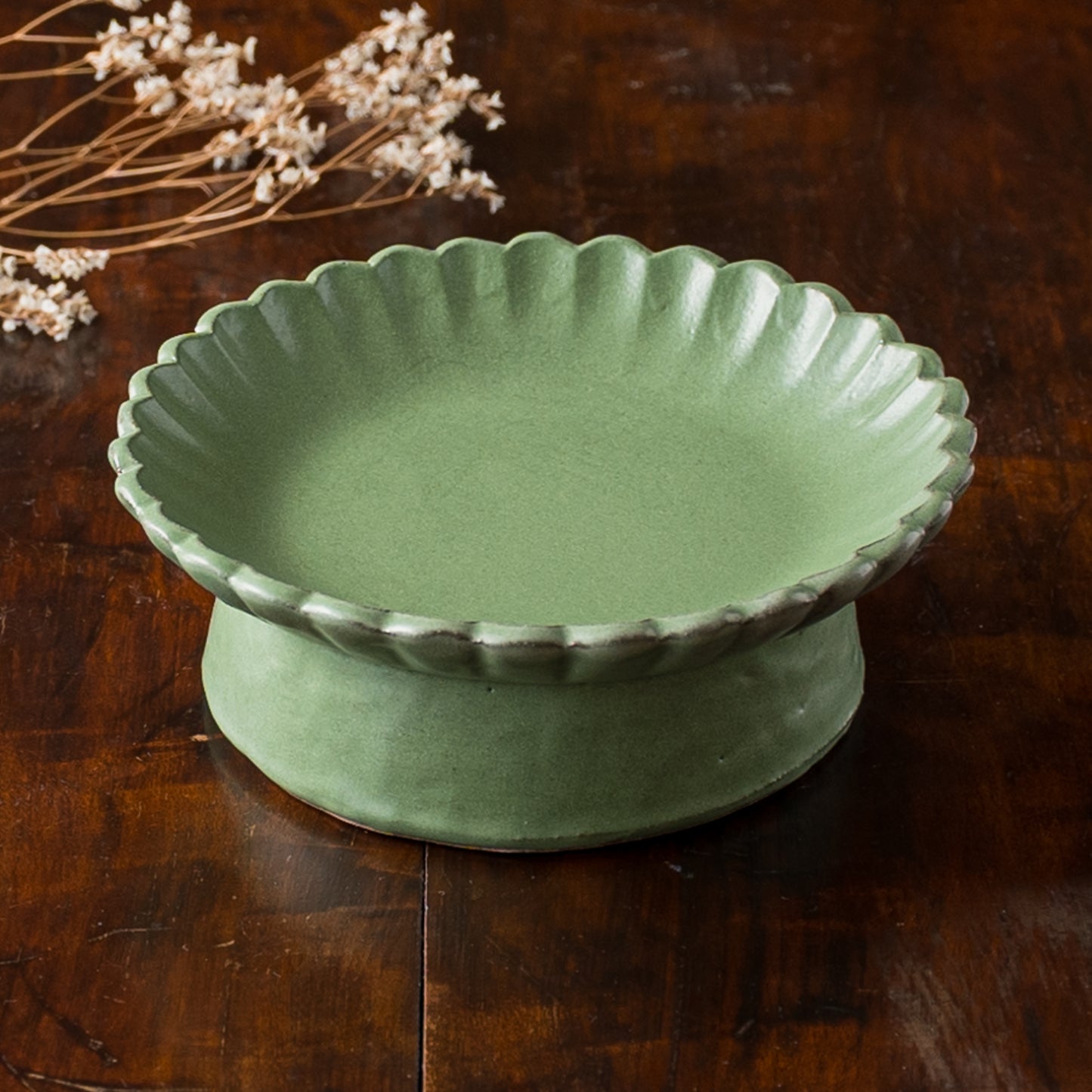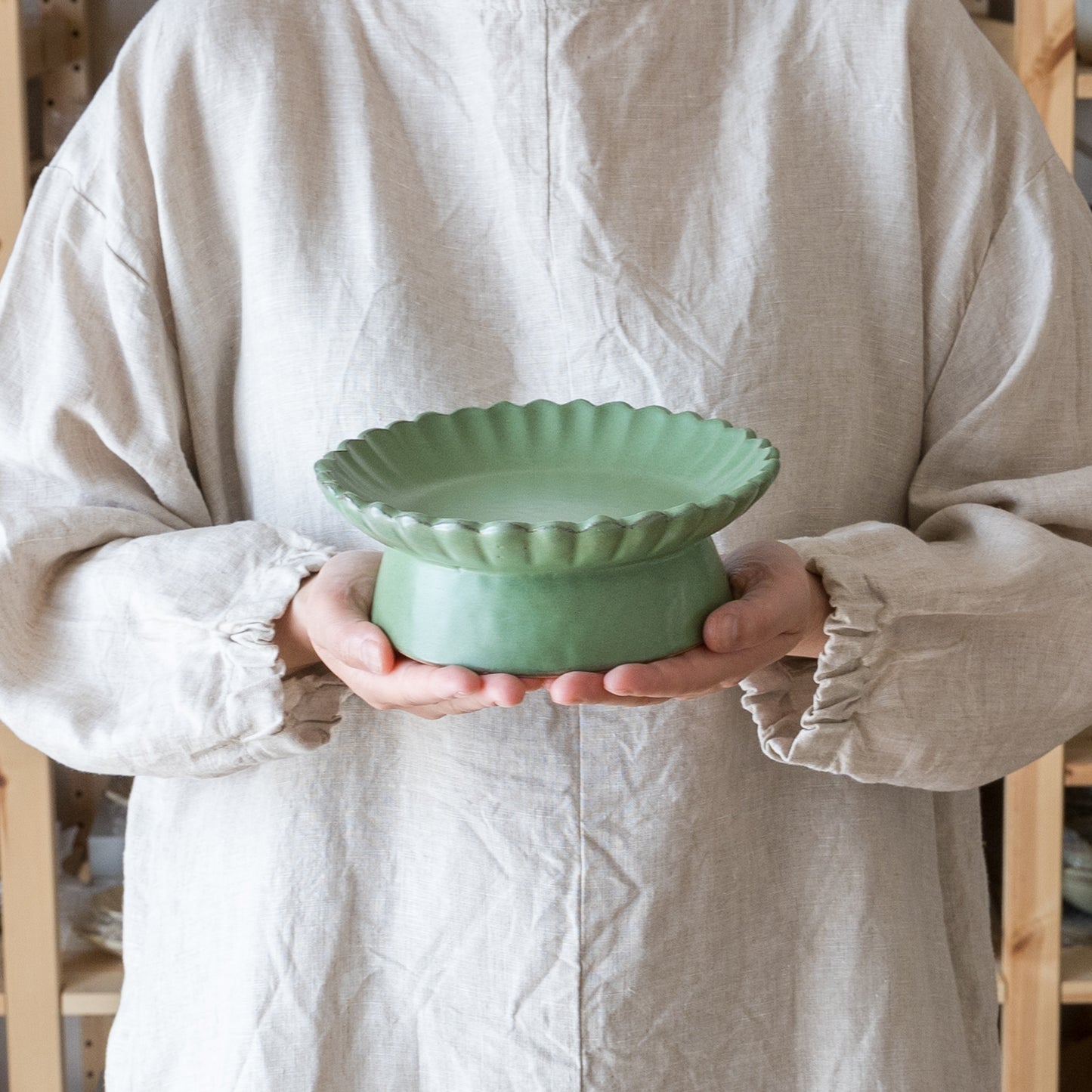 平安時代からある日本の伝統的な色の若草色。緑系のうつわがあると食卓に変化が生まれて明るくなります。花紋の部分に表れた釉薬の濃淡が表情豊かであたたみを感じます。