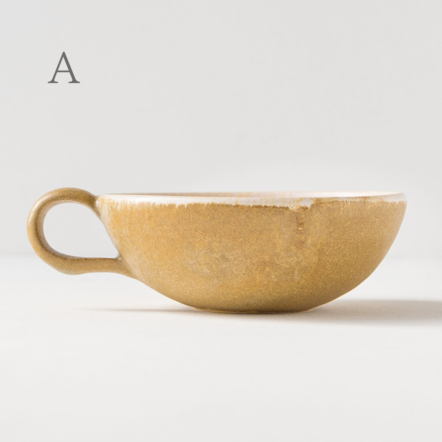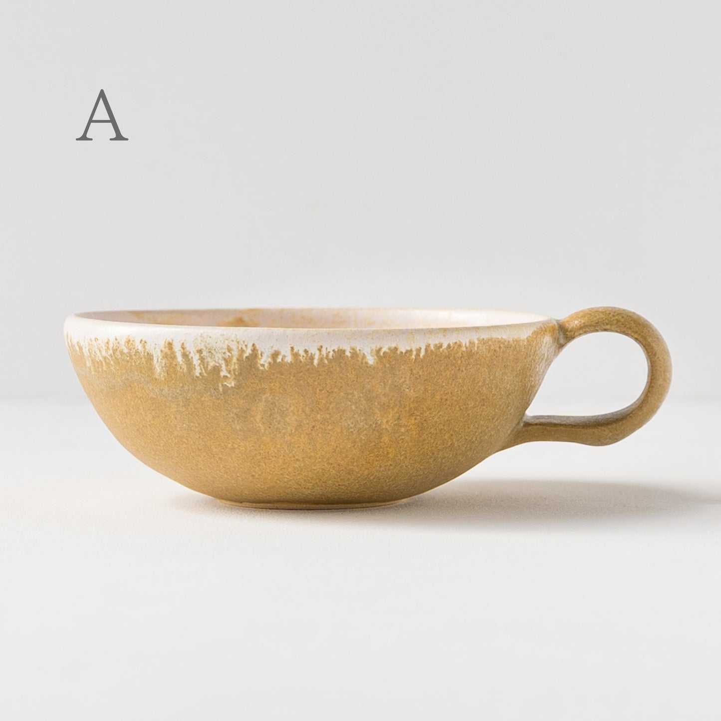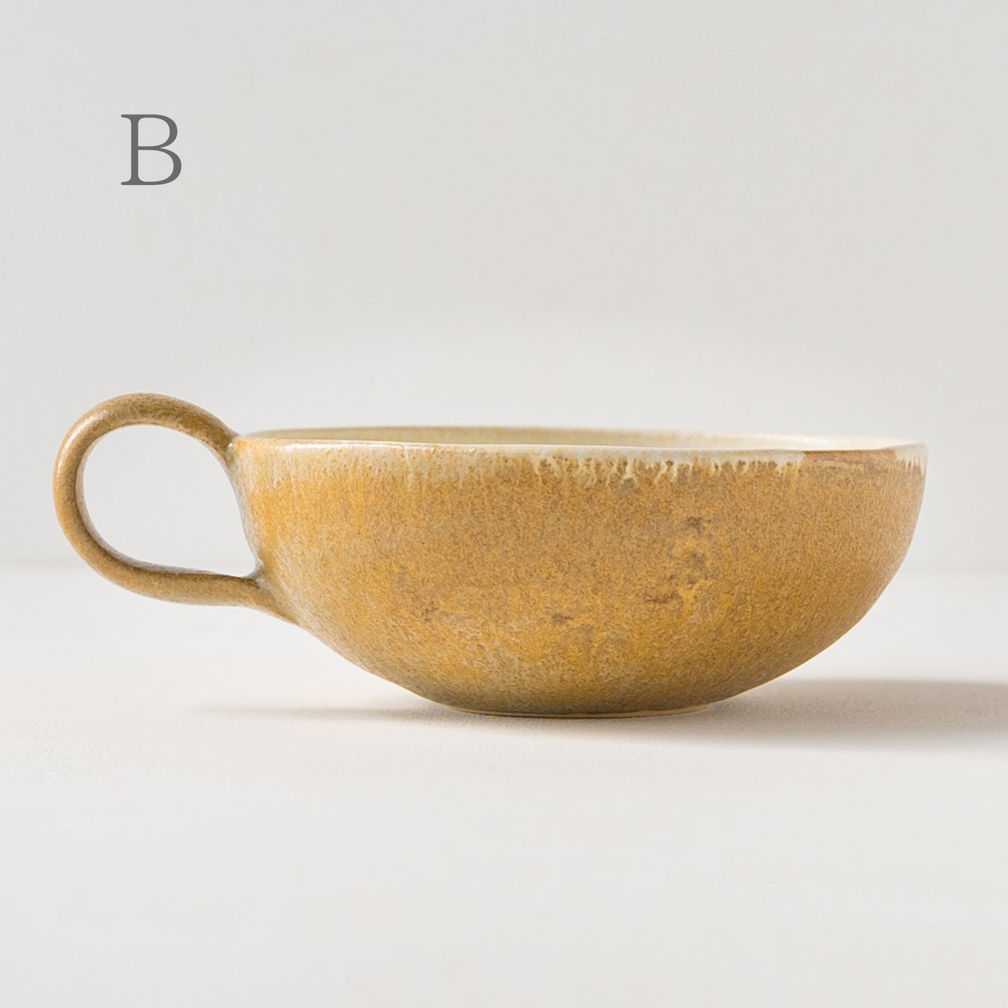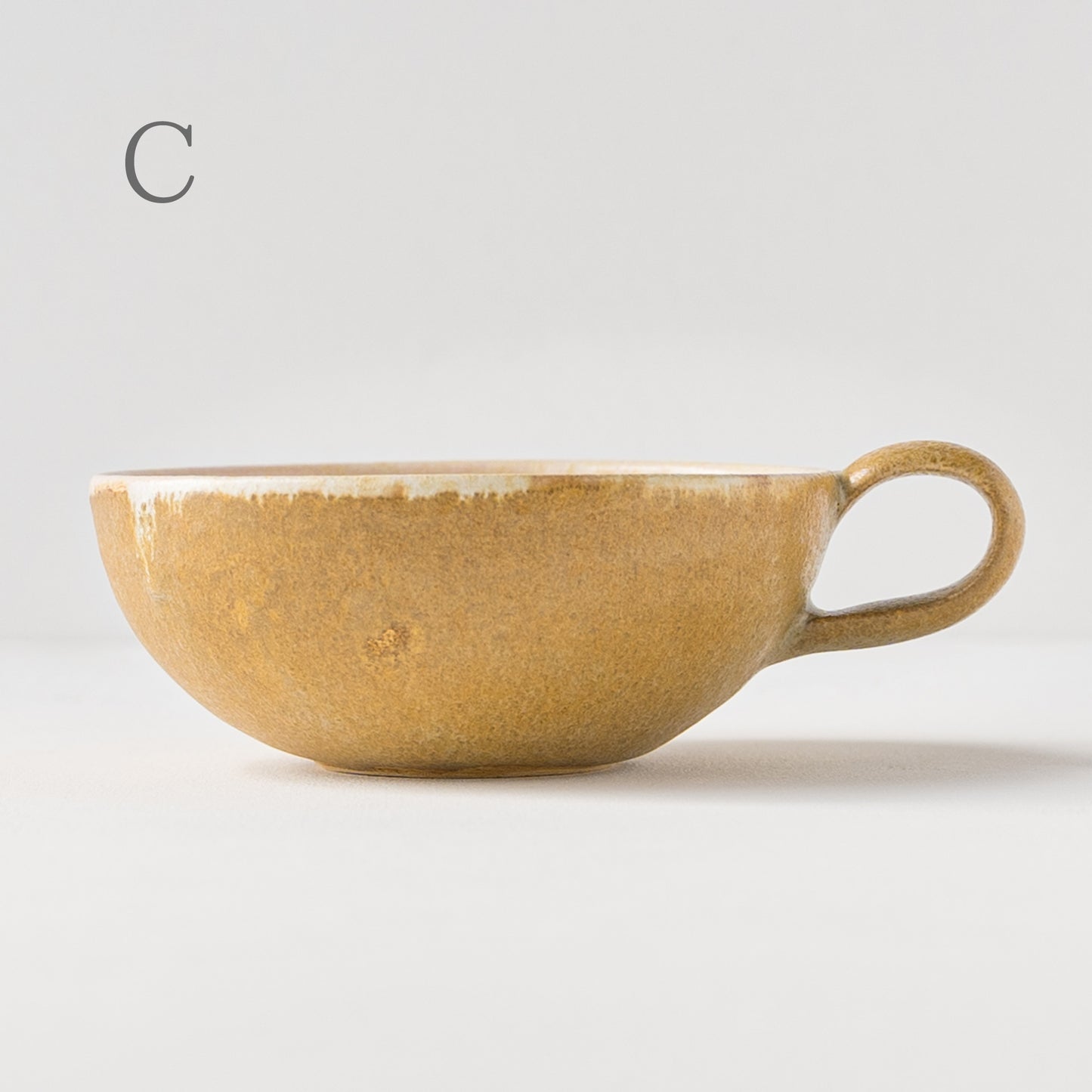 麦わら色とは、麦藁の色のような赤みを帯びたくすんだ黄色。麦の実を取り去ったあとの茎の色をそのまま色名にするのも奥ゆかしく、なんとも懐かしさを覚えるやさしい色味です。全体に表れた釉薬の濃淡が表情豊かであたたみを感じます。