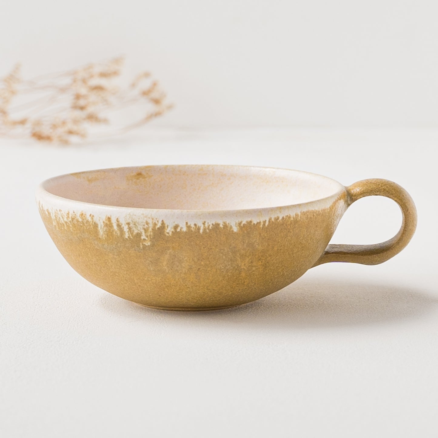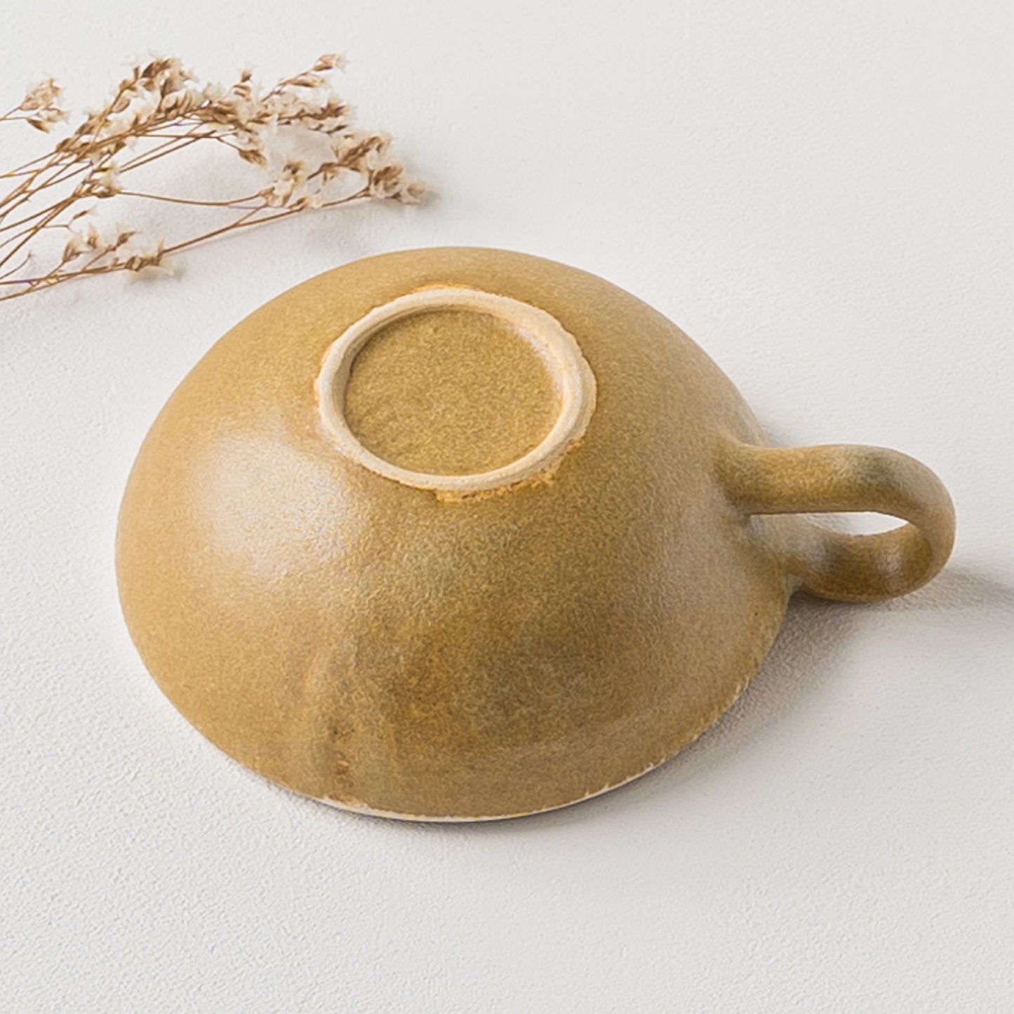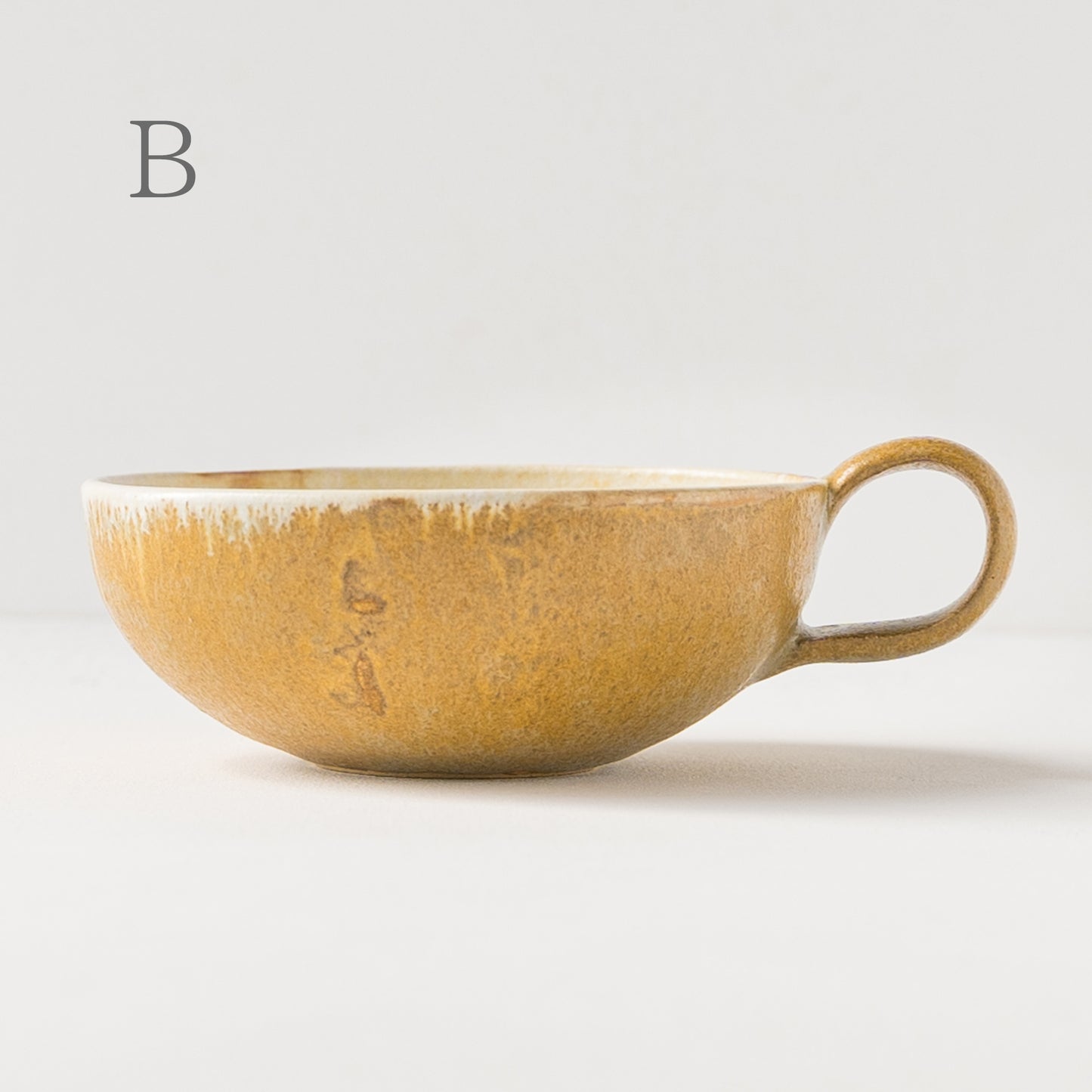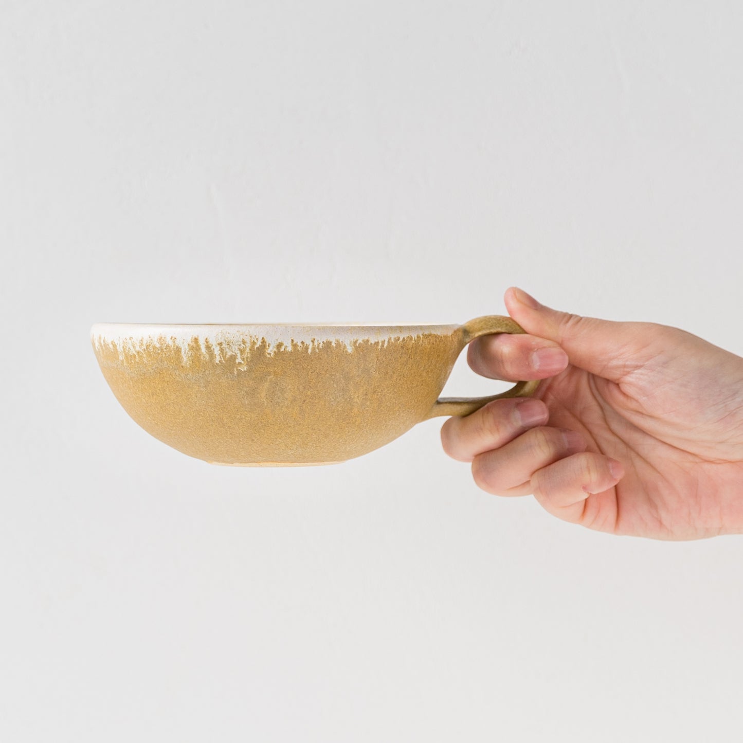 麦わら色とは、麦藁の色のような赤みを帯びたくすんだ黄色。麦の実を取り去ったあとの茎の色をそのまま色名にするのも奥ゆかしく、なんとも懐かしさを覚えるやさしい色味です。全体に表れた釉薬の濃淡が表情豊かであたたみを感じます。