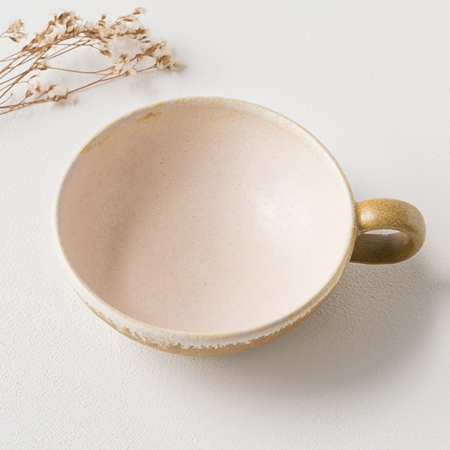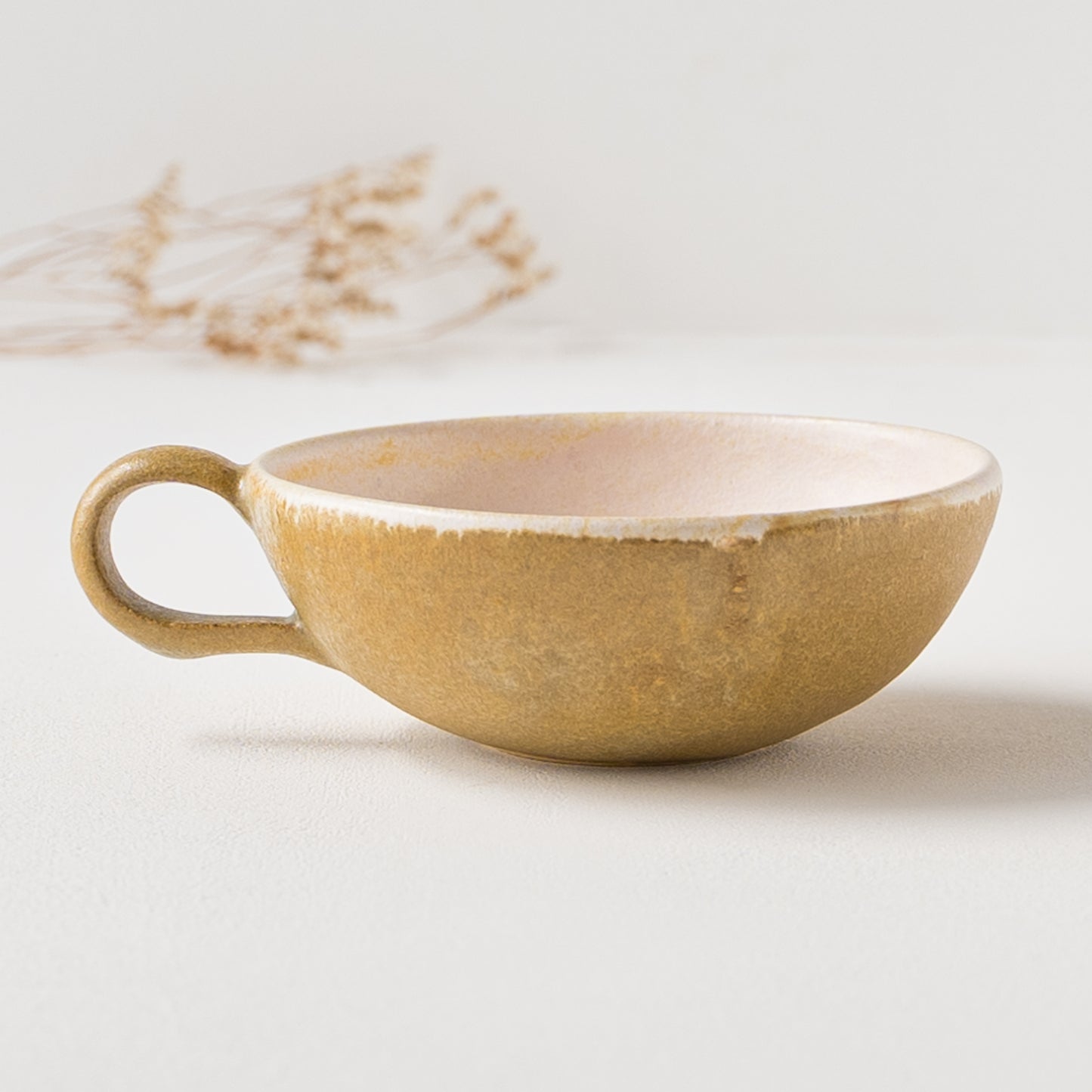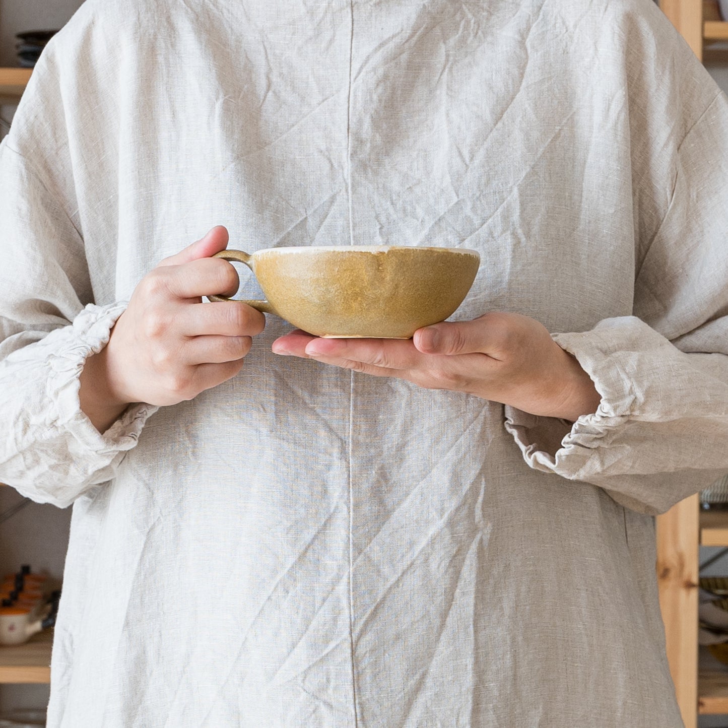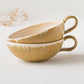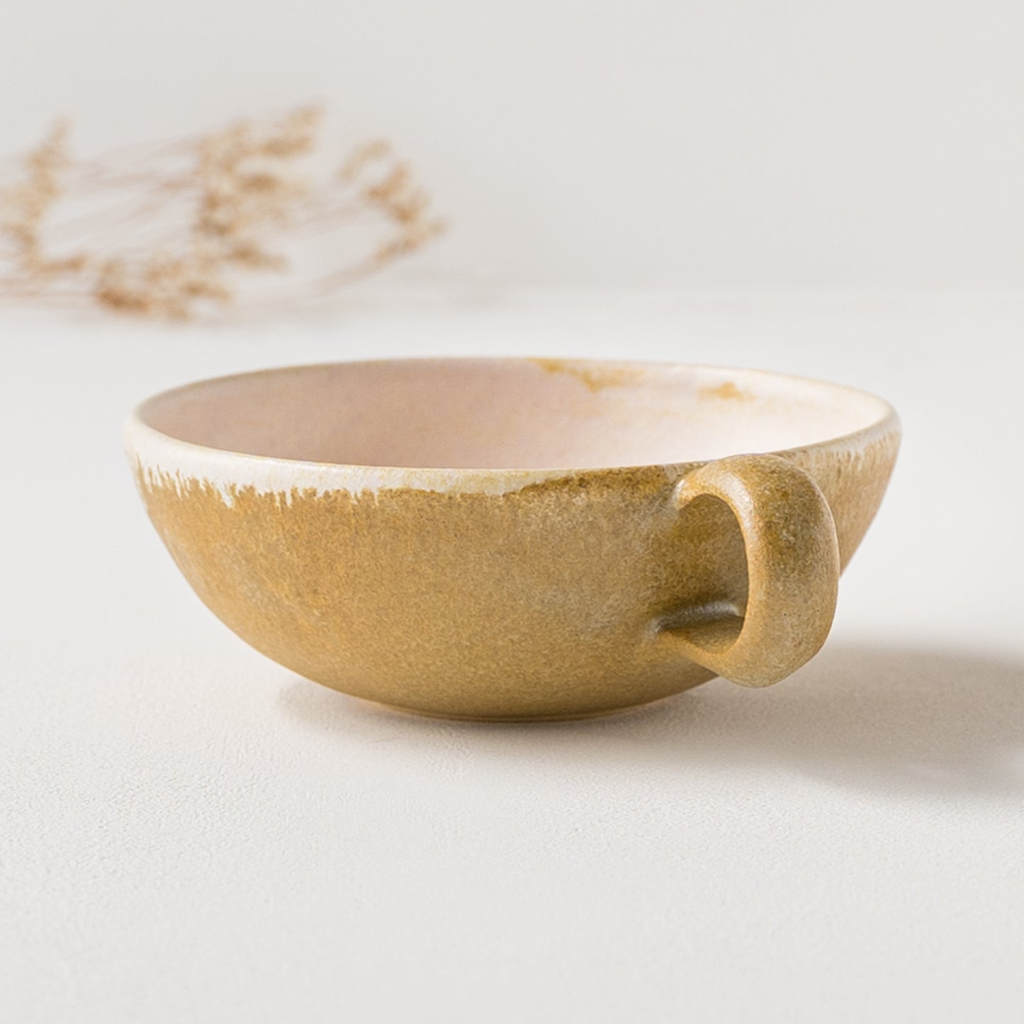 麦わら色とは、麦藁の色のような赤みを帯びたくすんだ黄色。麦の実を取り去ったあとの茎の色をそのまま色名にするのも奥ゆかしく、なんとも懐かしさを覚えるやさしい色味です。全体に表れた釉薬の濃淡が表情豊かであたたみを感じます。