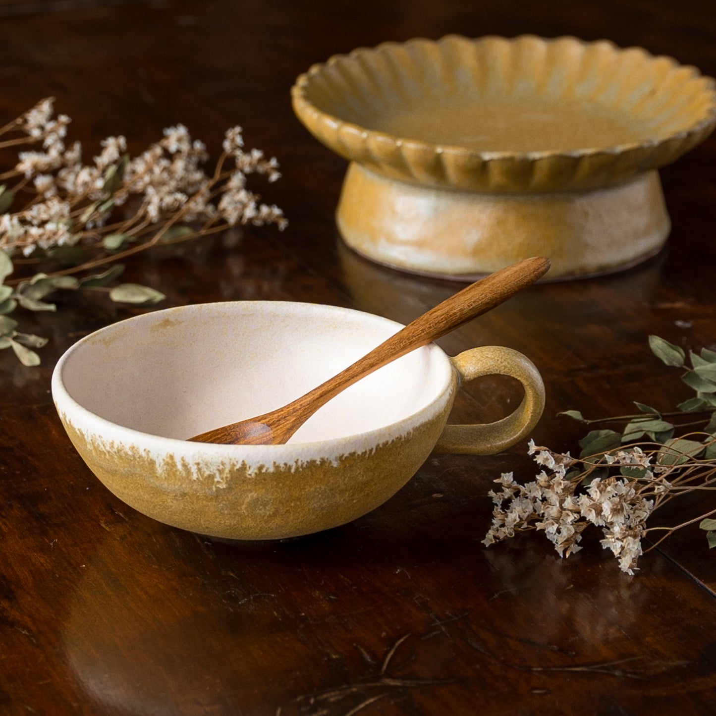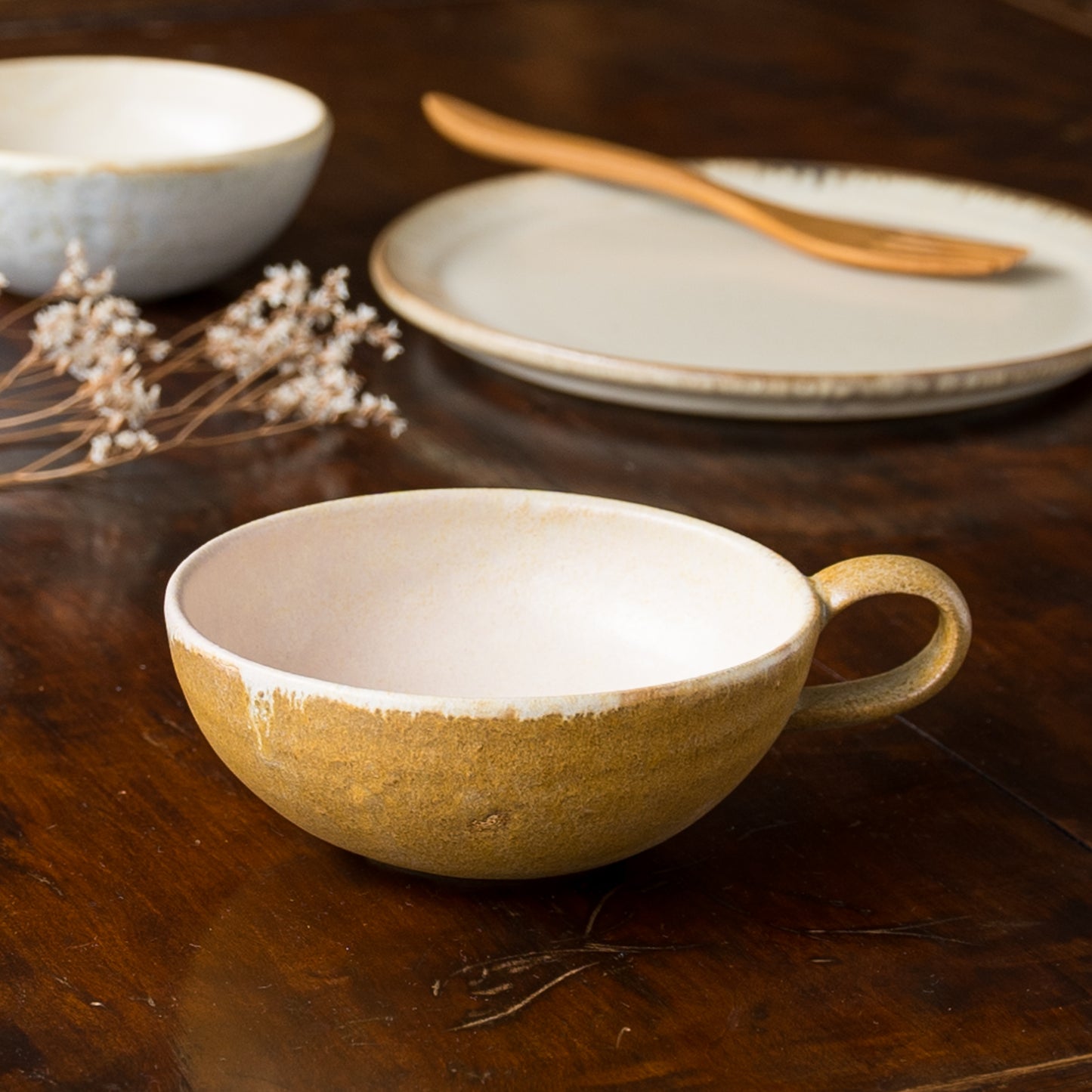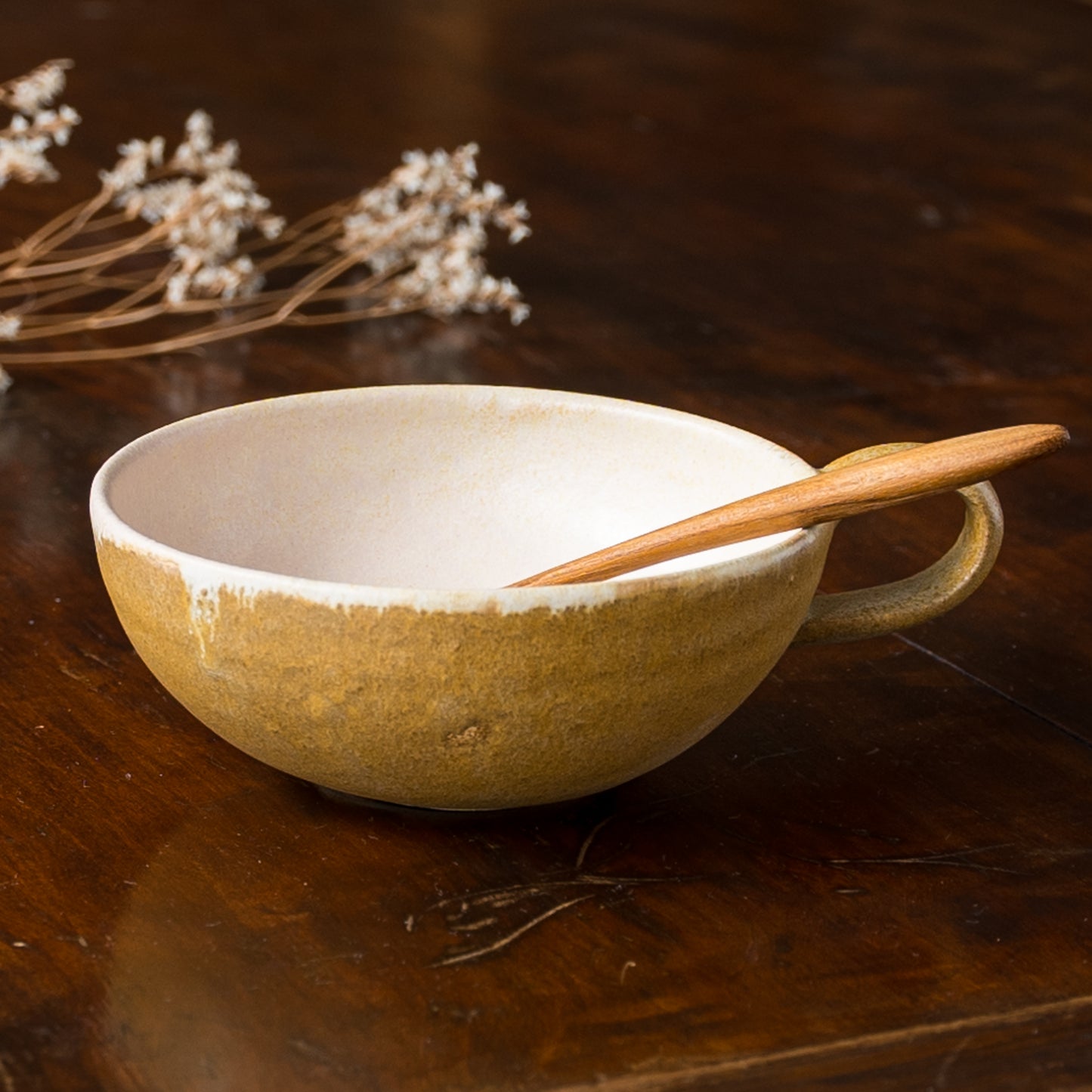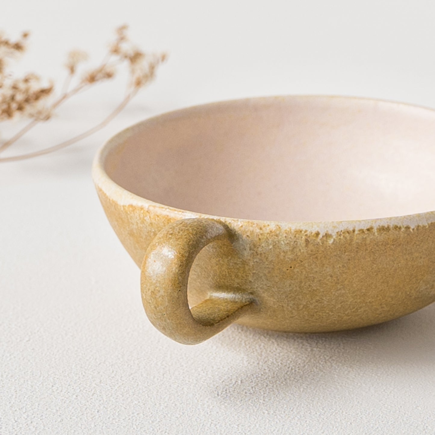 麦わら色とは、麦藁の色のような赤みを帯びたくすんだ黄色。麦の実を取り去ったあとの茎の色をそのまま色名にするのも奥ゆかしく、なんとも懐かしさを覚えるやさしい色味です。全体に表れた釉薬の濃淡が表情豊かであたたみを感じます。